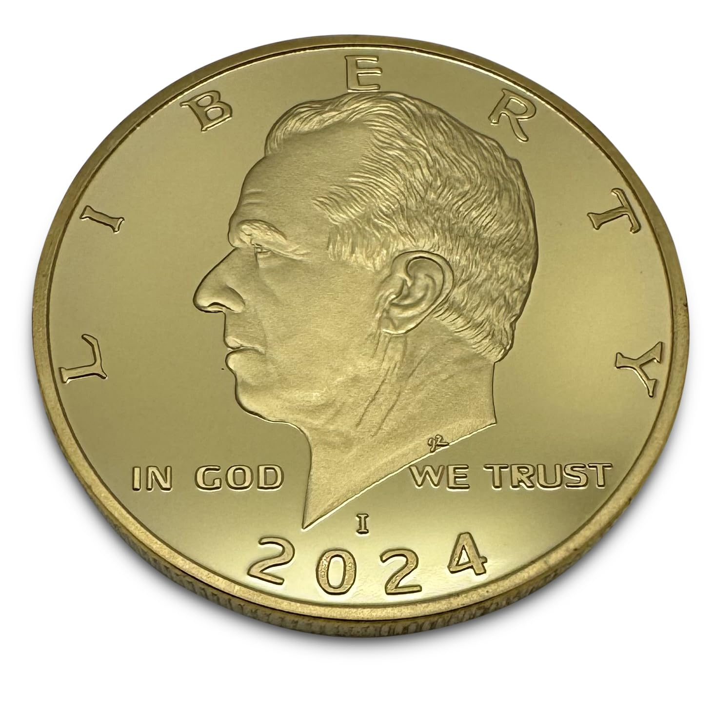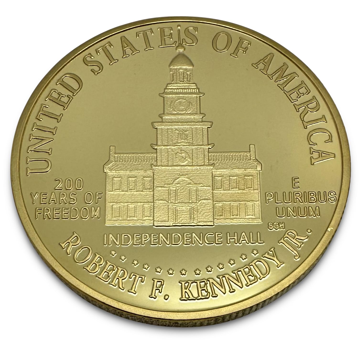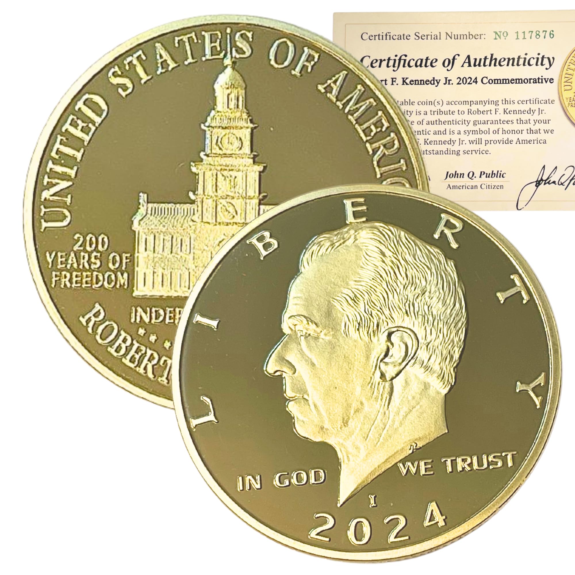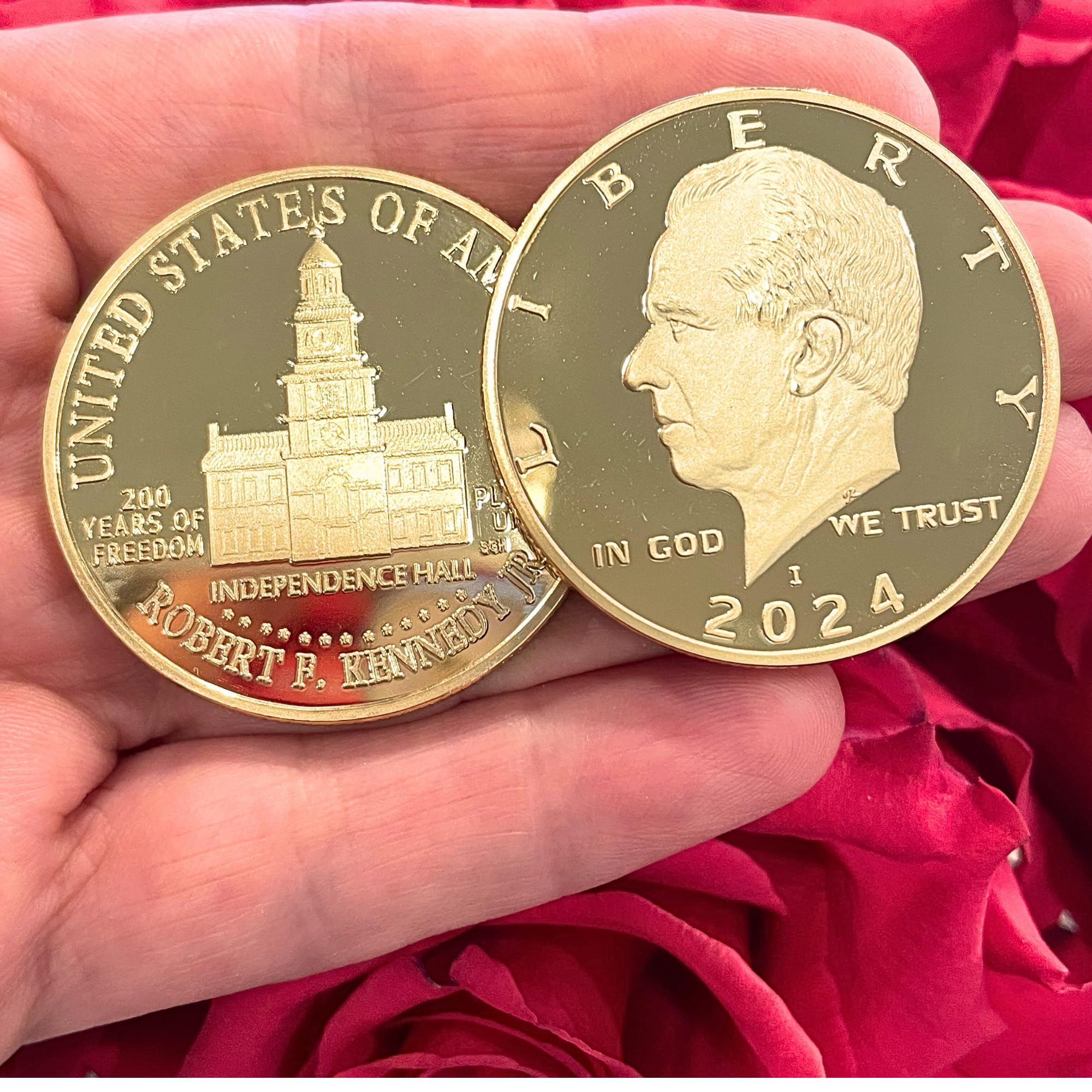 COLLECTIBLE. First-edition, one of a kind 2024 Robert F Kennedy gold coin for collectors is the perfect addition to your President challenge coins, memorabilia, flags, hats, t-shirts, bobbleheads, and pens