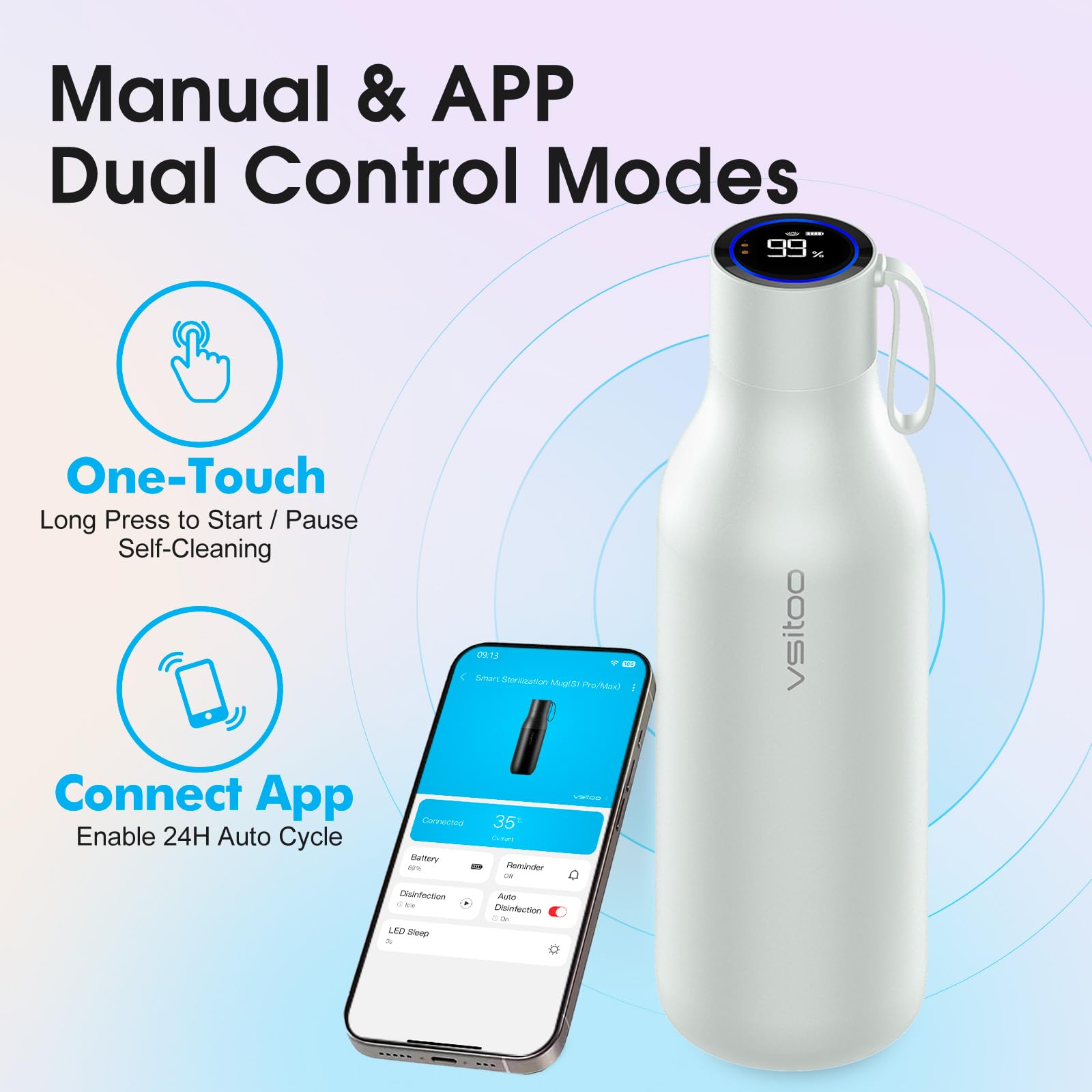 【App-Controlled Cleaning and Operation】Customize cleaning schedules via the VSITOO app or use the touchscreen for independent operation. This self-cleaning smart water bottle adapts to your routine while providing practical features like the smart water bottle with reminder to drink water. The smart water bottle ensures seamless control wherever you are.
