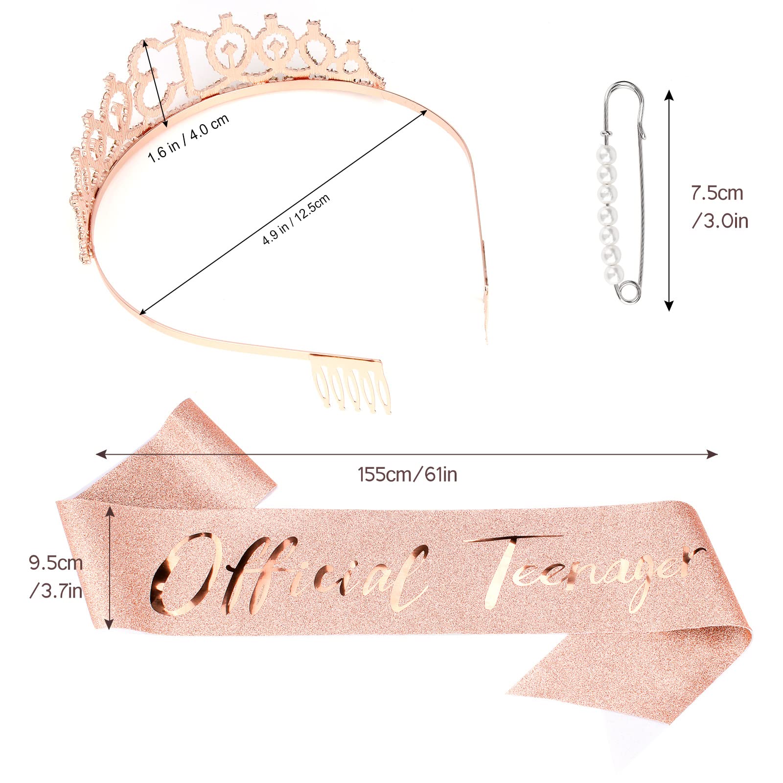 One Size Fit All - Birthday sash - Length: 61”(155cm),Width: 3.7”(9.5cm);Rhinestone Tiara are adjustable as well comes with comb design that can holds and stable and comfortable on top of the hair.Birthday sash can be fixed and adjusted in length with pearl pins .