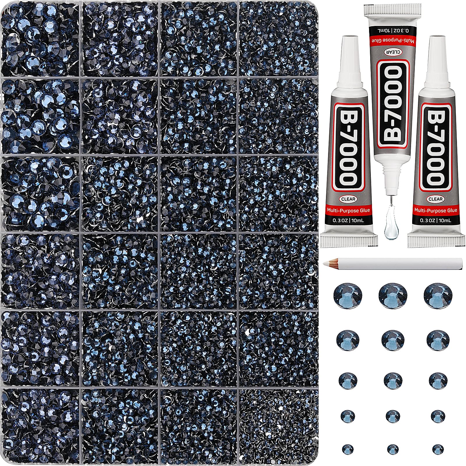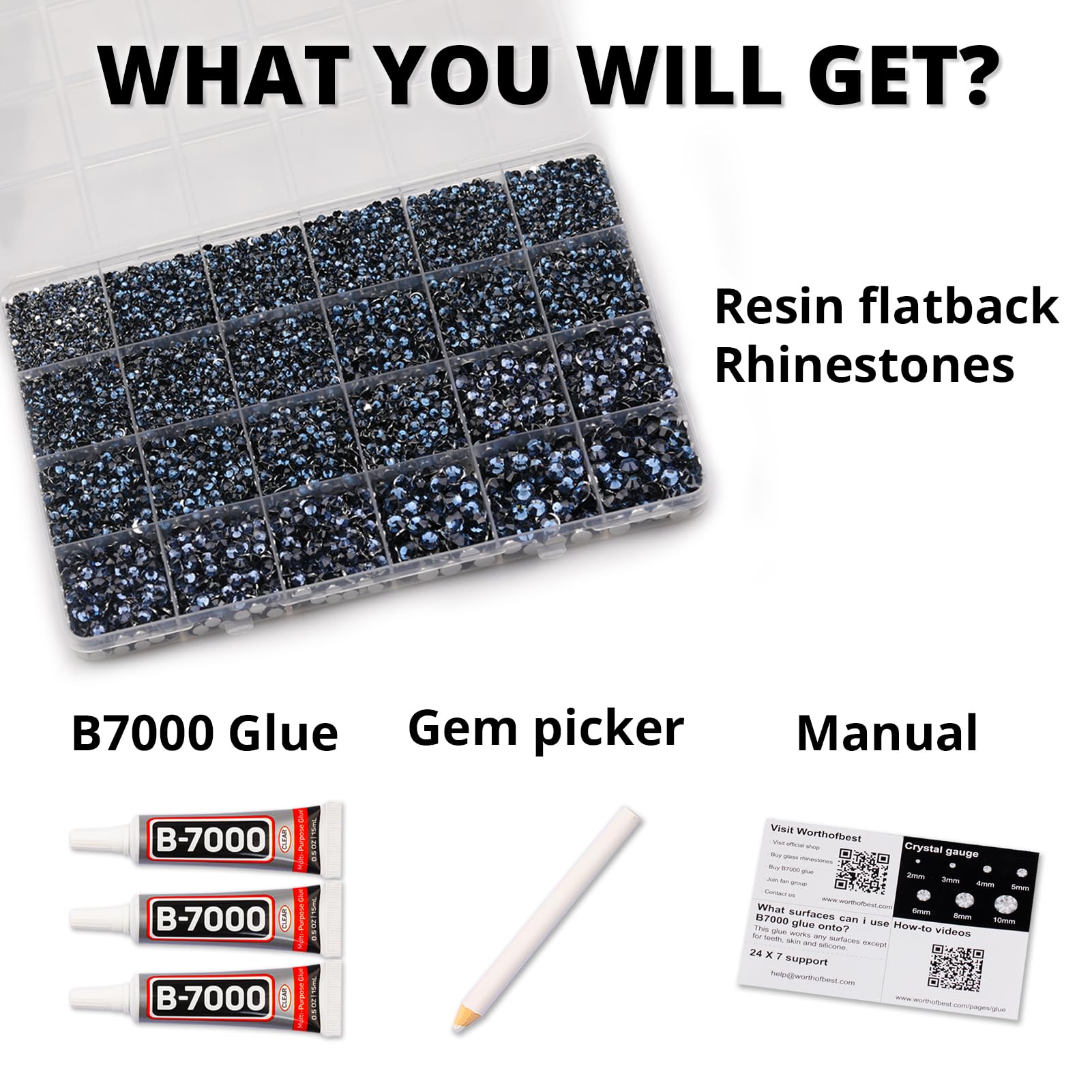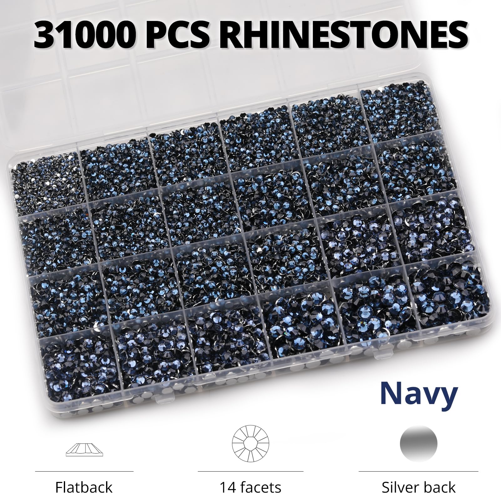 Package Content with Tool (pickup pen and manual) -- The bedazzler kit Package includes 1 navy blue rinestones set with 24 grids, approx 31000 pcs of 2-6mm bling-out resin rhinestones