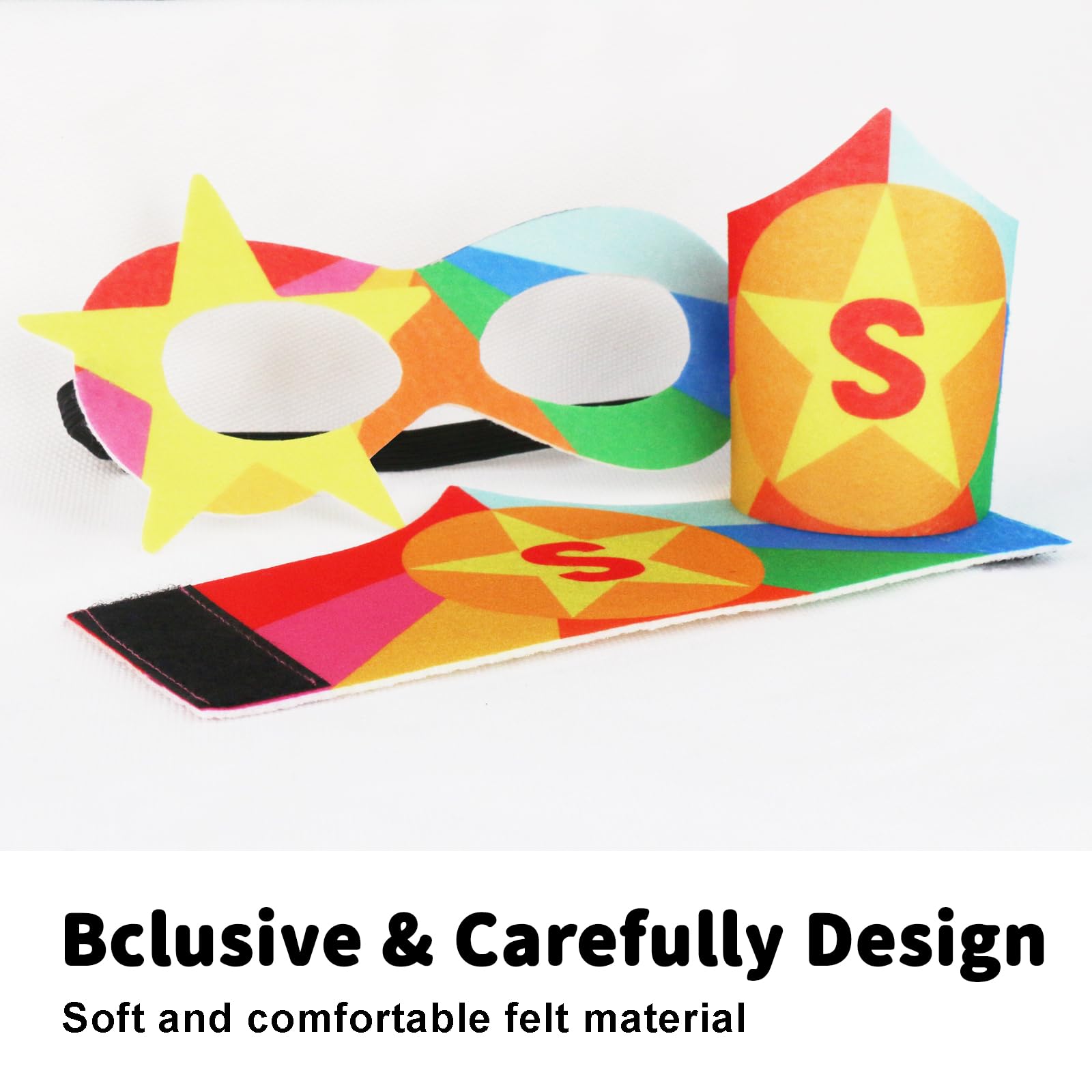 NEW UPGRADE - Star superhero capes for kids, made of child/eco-friendly Polyester, feature curved streamlined design, and Exquisite full-color digital printing, Unique and Durable. Superhero dress up mask and cuffs, made of soft felt with digital printing, vibrant and lively. Your Lilo hero will soar and save day, while their imaginations blossom.