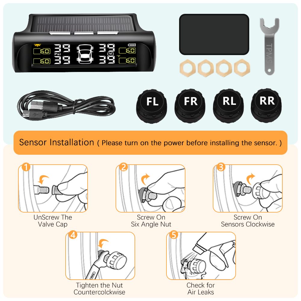 【Auto Solar Charge & USB Charge】 Tire Pressure Monitoring System is Automatic solar charging, using higher quality and more durable solar lithium battery panels. it also can be charged by USB when there is no sun. Help you focus on driving rather than tpms battery power.