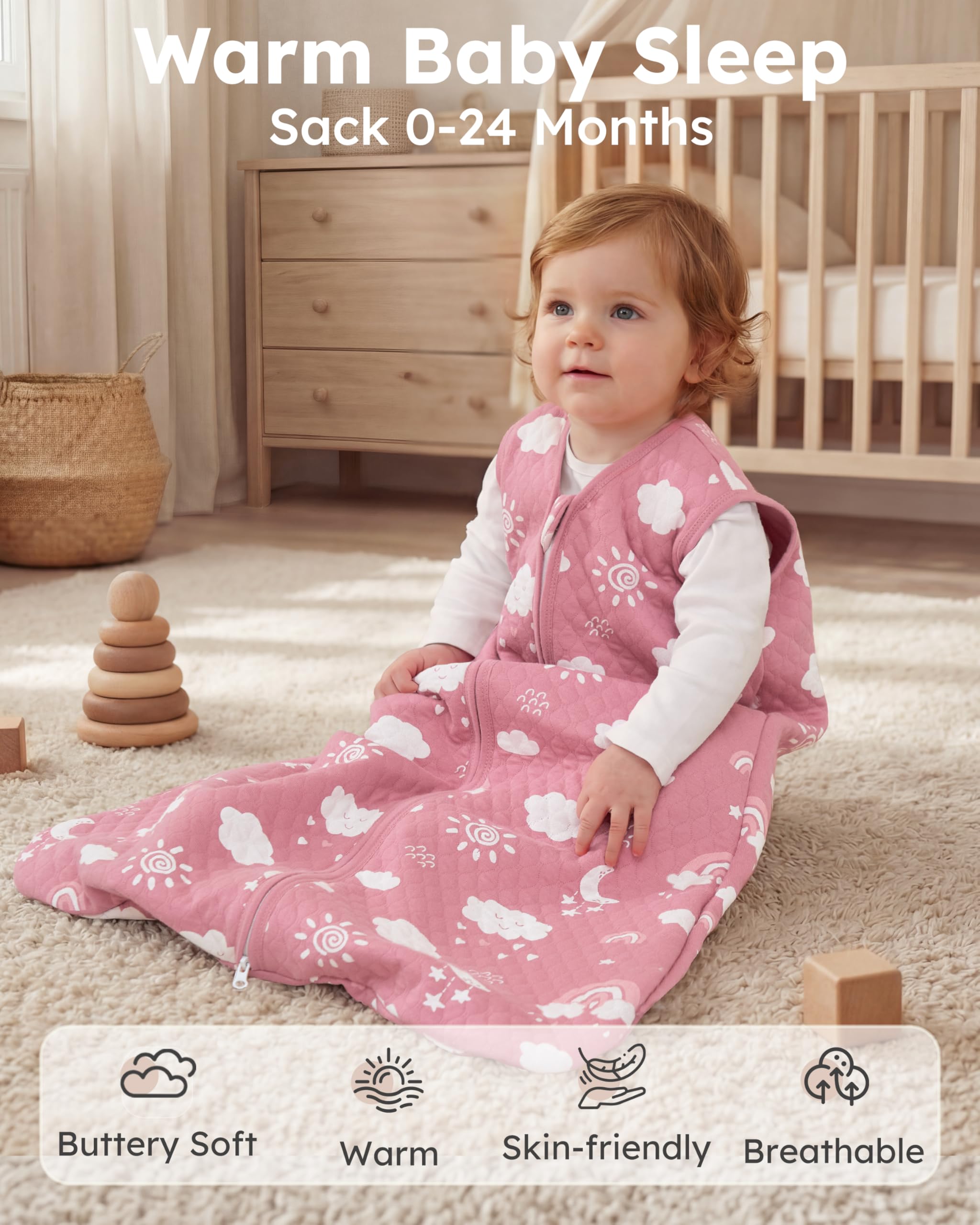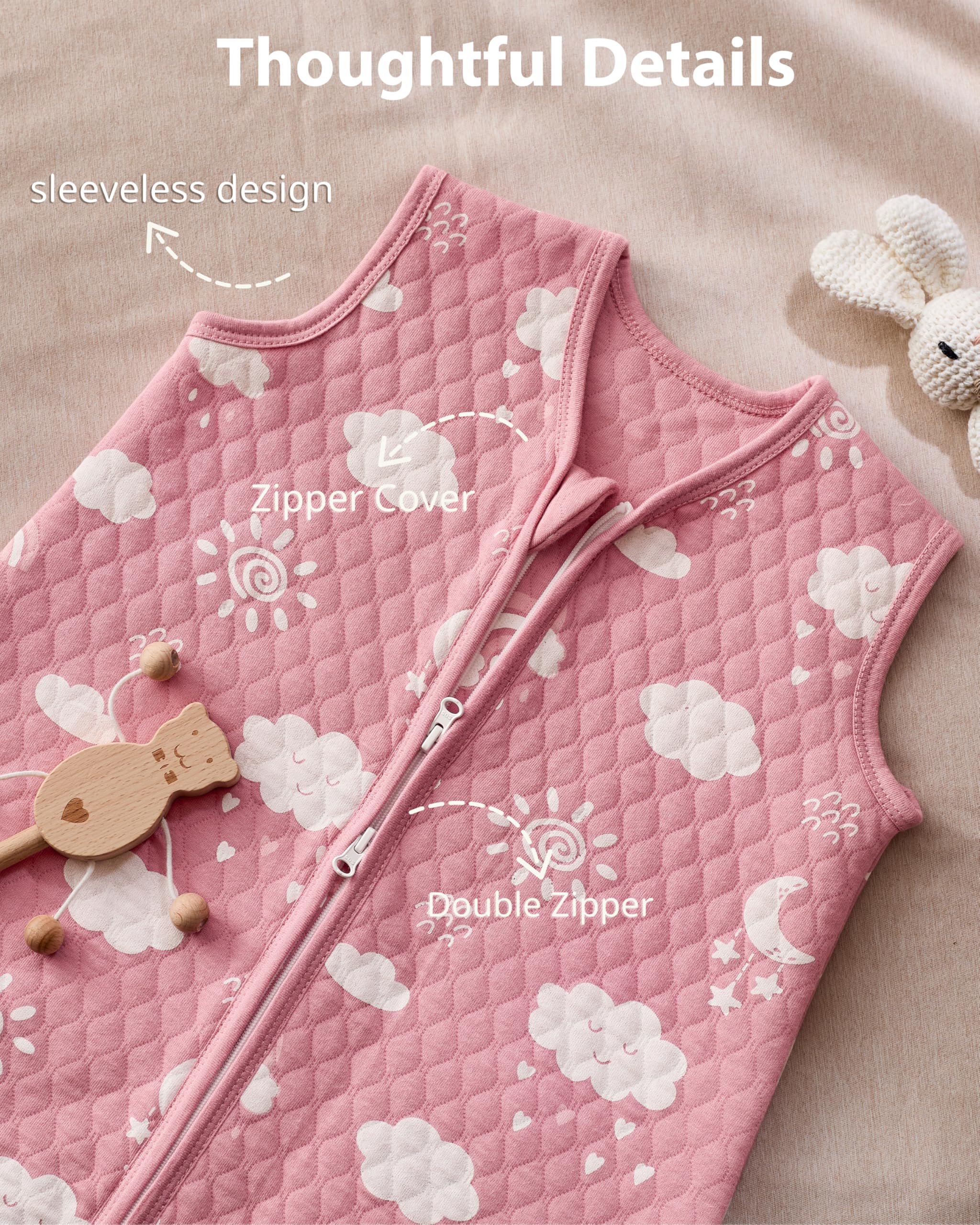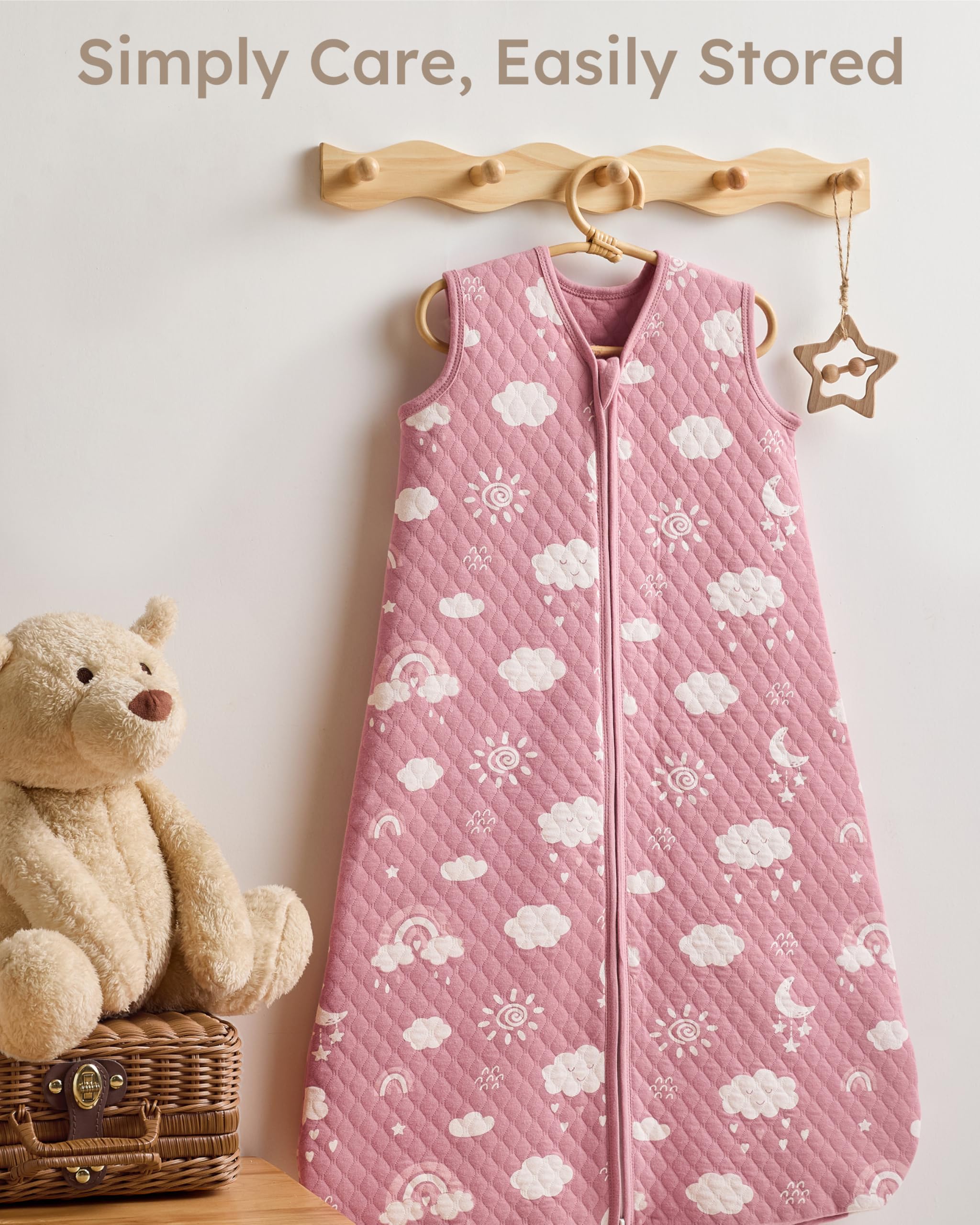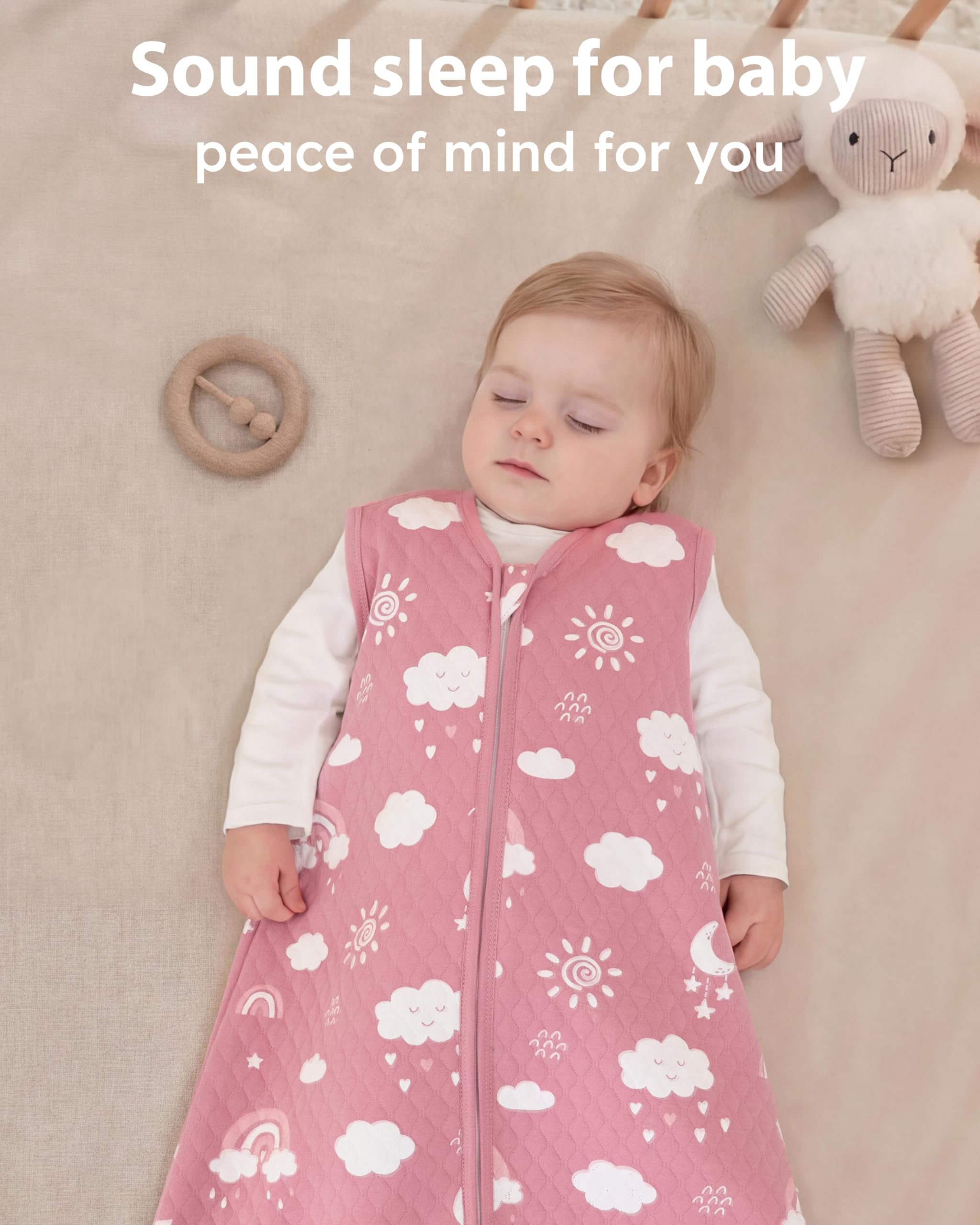 Quilted to Last: The long-lasting quilted design for the baby sleep sack keeps the fill evenly in place after repeated washes. No shifting, no bunching, which means worry-free for you and fewer replacements as your baby grows. It provides just the right warmth and is completely washable without worry.