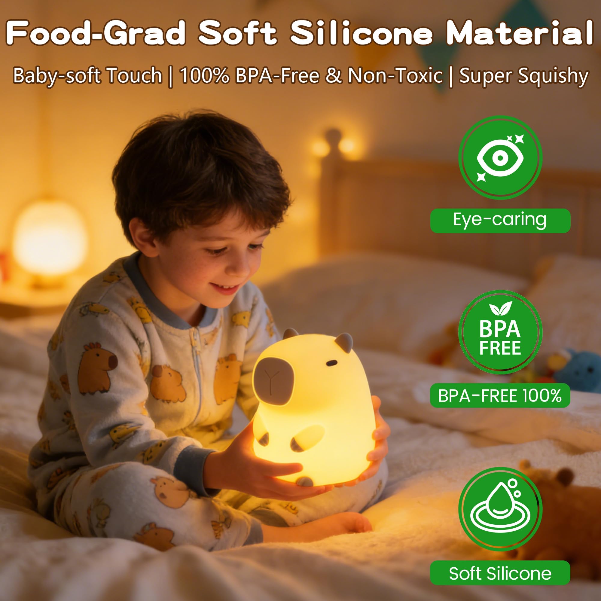 ADORABLE & VIRAL CAPYBARA DESIGN – Inspired by the internet-famous capybara's chill vibes, this cute silicone night light doubles as room decor, sensory toy, and mood booster. Ideal for bedrooms, nurseries, home offices, dorms, and bathrooms, adding a touch of whimsy and warmth to any space. A must-have for capybara fans!