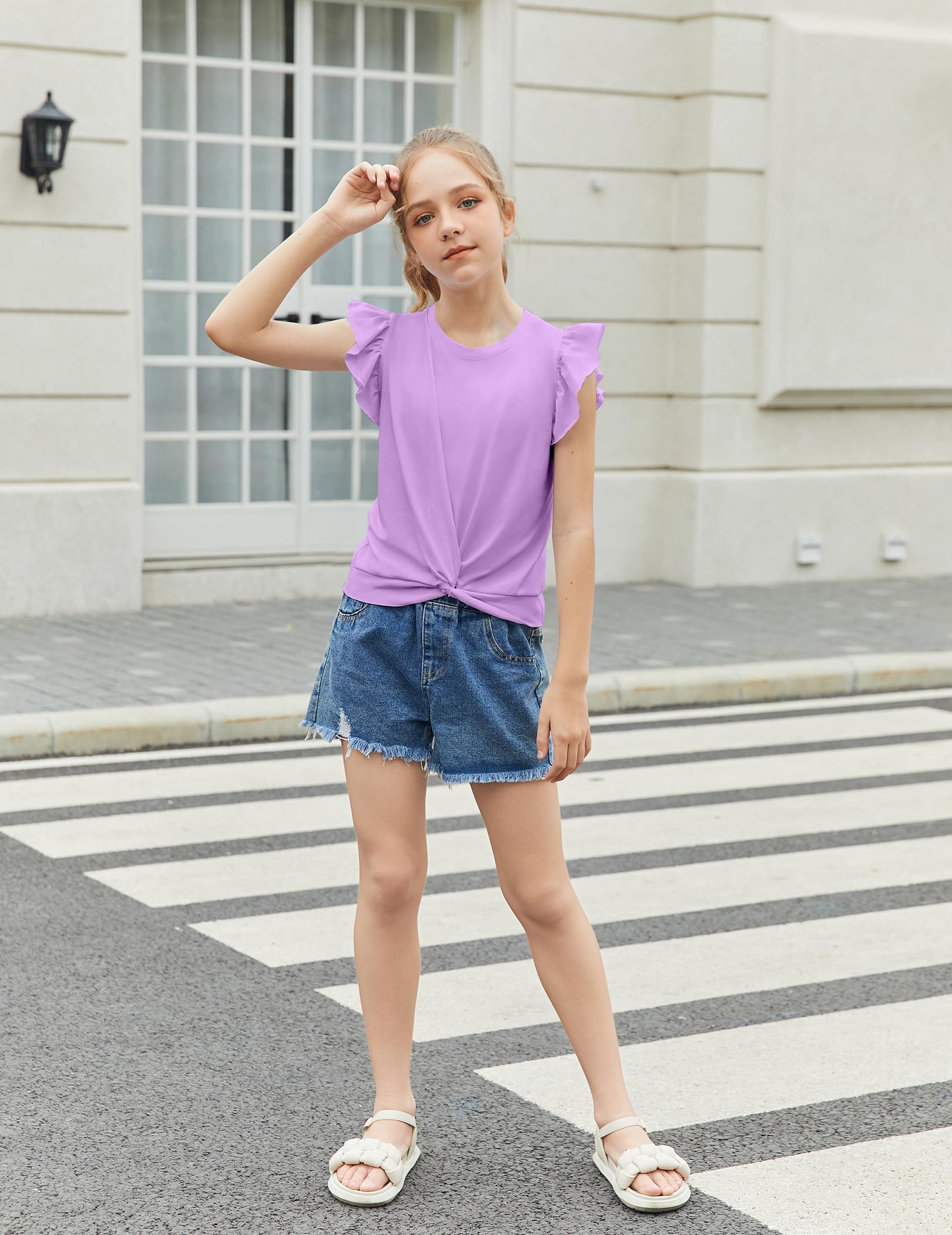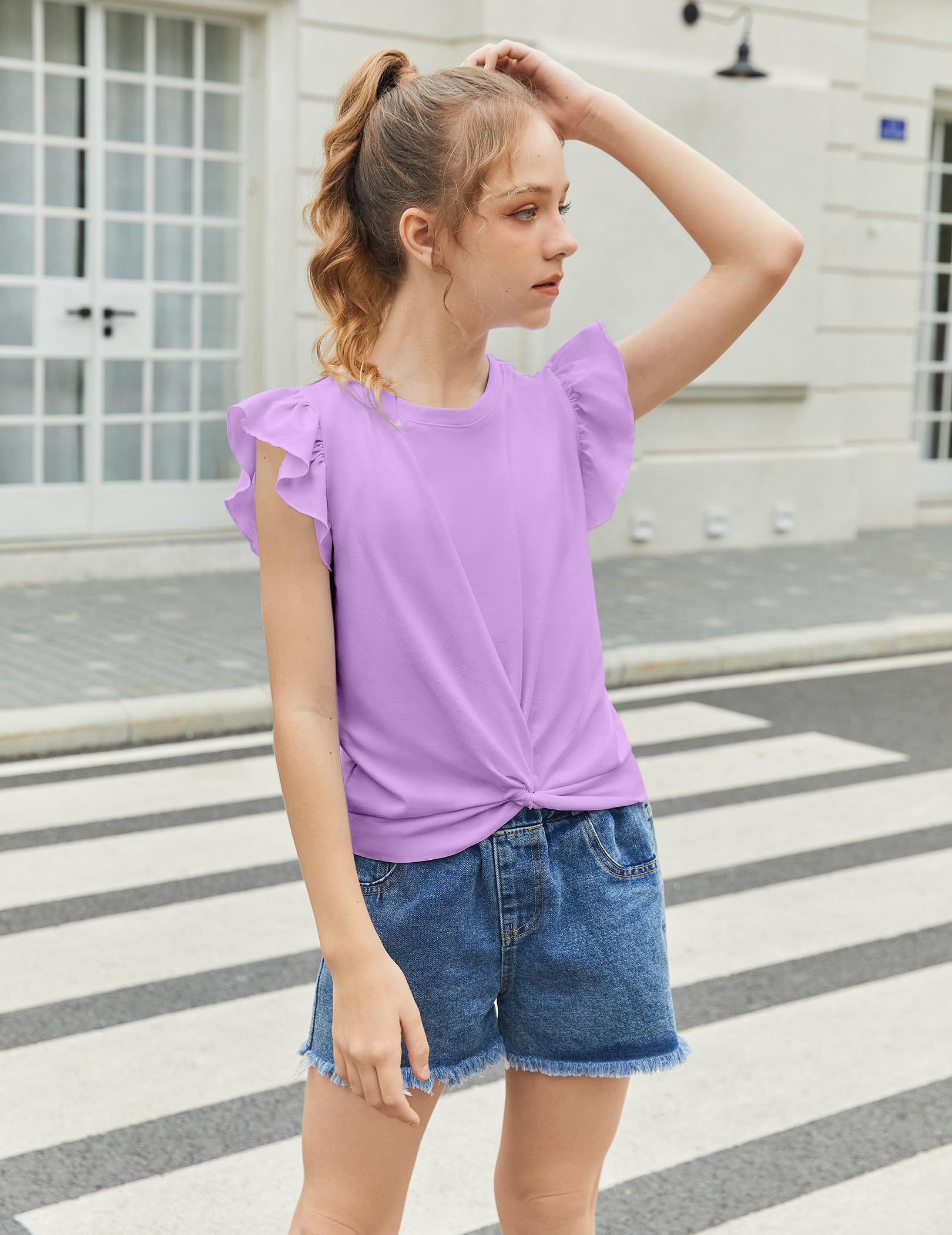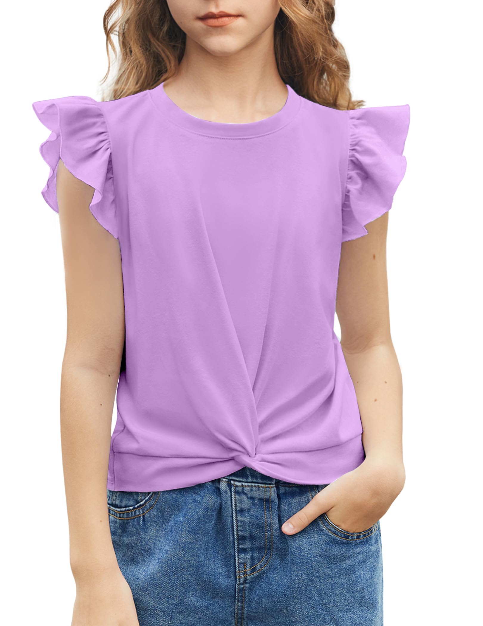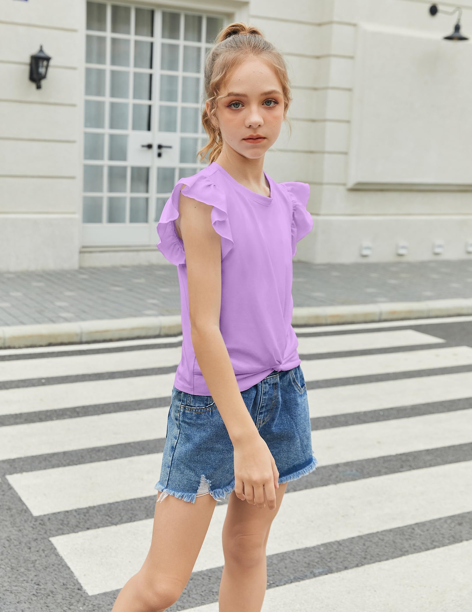 Design:This girl t shirt short sleeve features are designed to Sleeveless type But it comes with a flying sleeve design and are twist front.Full sense of design!So cute girls front twist tops and both ladylike and casual.