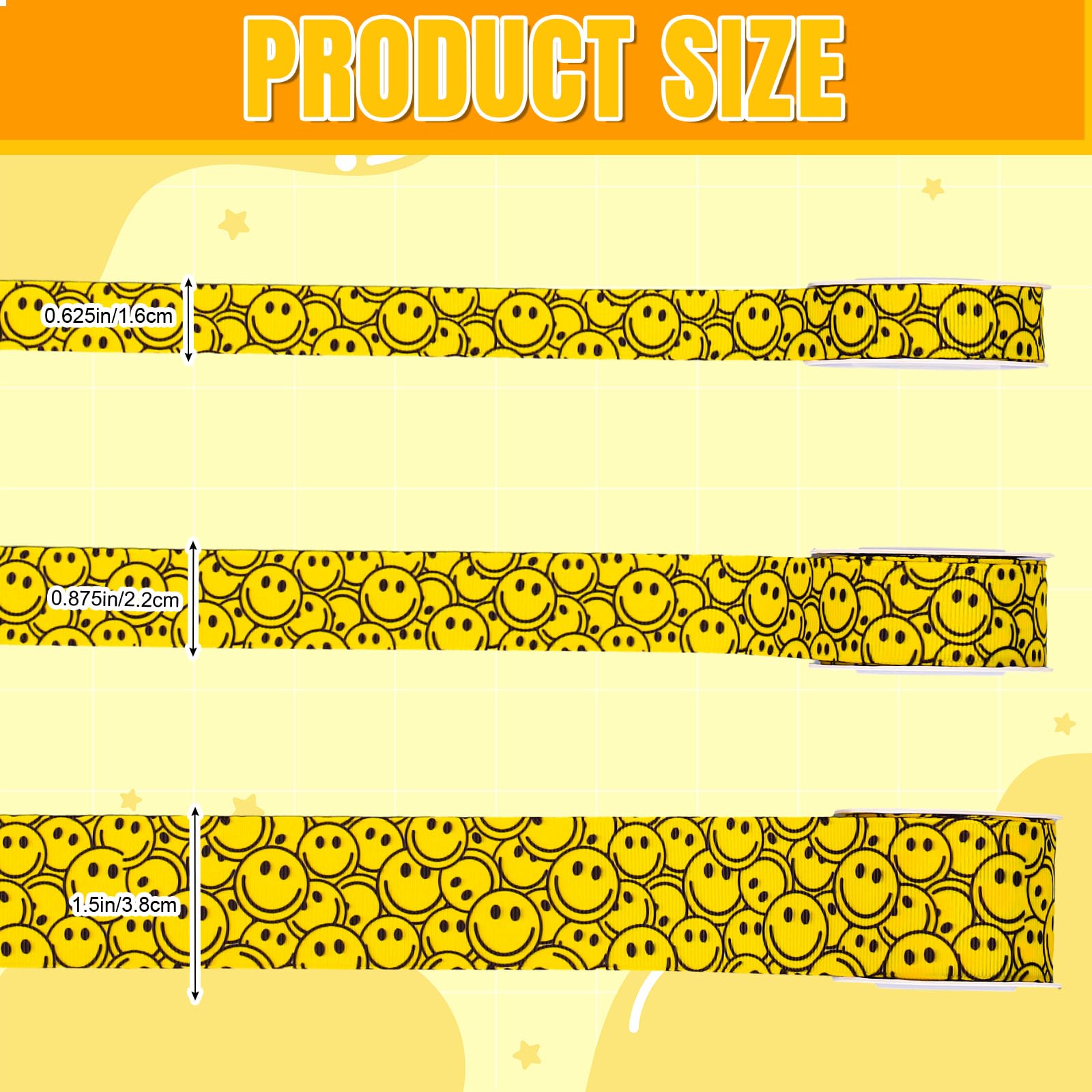 Features: Adorable design: Our ribbons are smile face printed, colored mainly in yellow, cute and bright, the perfect addition to your home and party. Versatile use: Made of good quality material, durable and not easy to fray, easy to hold shapes, they are perfect for handicrafts, gift wrapping, home and party decor. Specifications: Size: 5/8 inch x 5 yard each; 7/8 inch x 5 yard each; 1.5 inch x 5 yard each Color: yellow Package includes: 3 x Grosgrain Ribbon Note: 1.Please allow slight errors of size because of manual measurement. 2.The colors may look slightly different due to different screens, please in kind prevail.