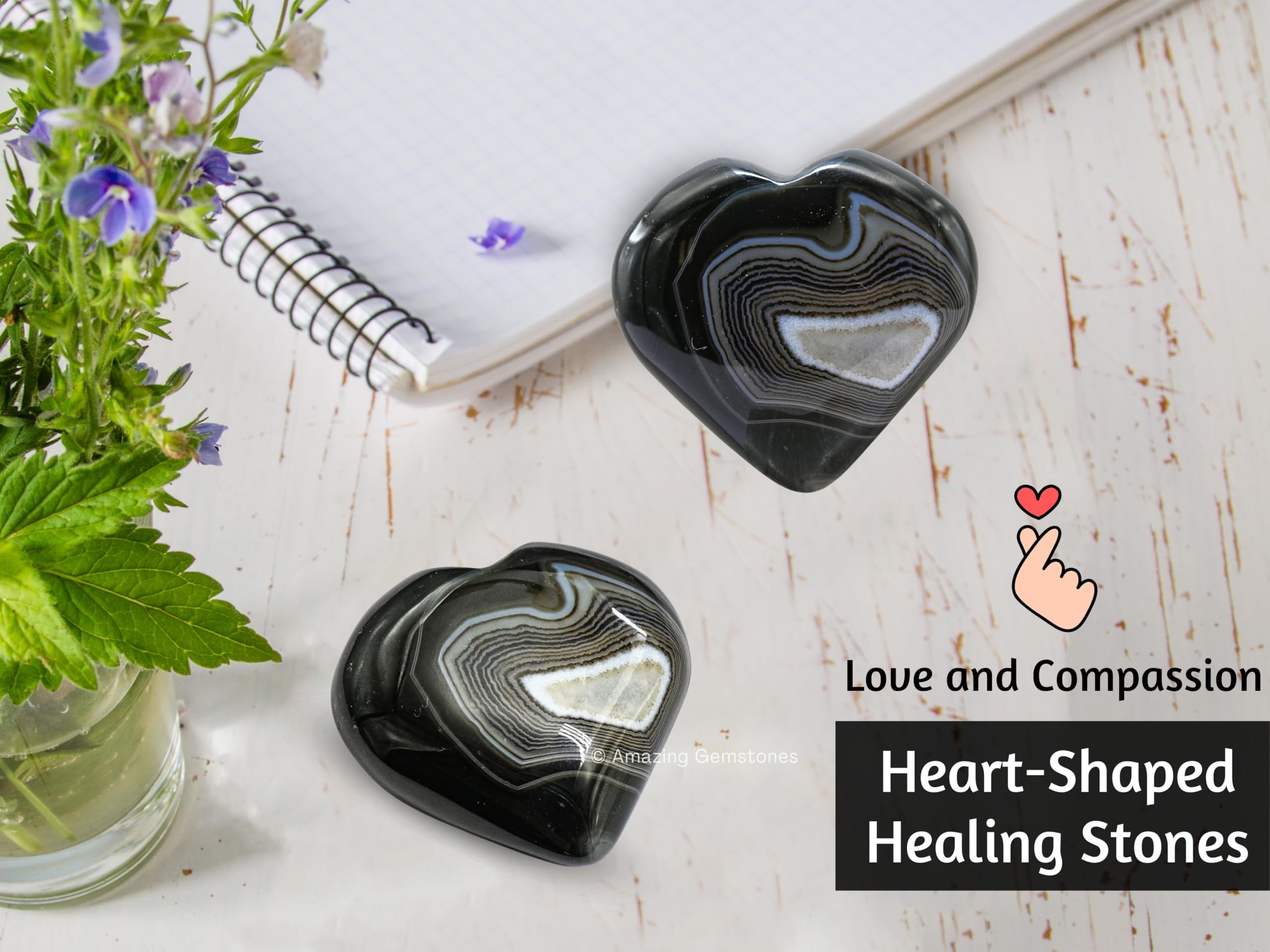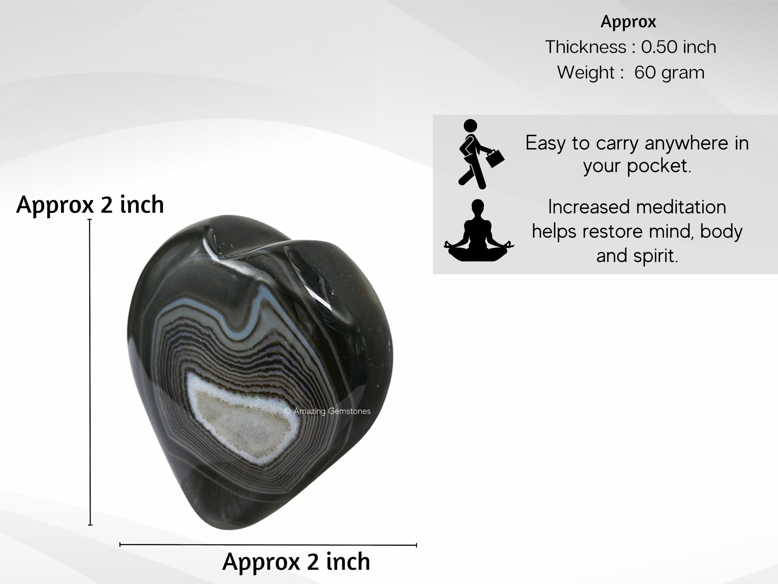 Black Onyx Agate Crystal Heart Palm Worry Stones are polished heart shaped stones that can be used for Back, Neck, Face and Feet Massage therapy, Chakra Balancing, Reiki Healing, Crystal Grid Meditation and many other esoteric healing practices.