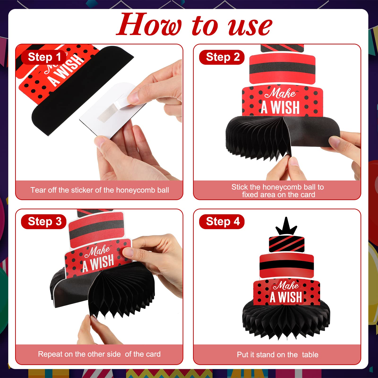 Easy to Assemble: our red birthday table centerpiece decorations are reserved with stickers, you only need to tear off the honeycomb sticker, paste the honeycomb ball to the bottom of the card and fix it, and finally gently unfold the honeycomb ball by hand, which can complete the assembly, simple and convenient