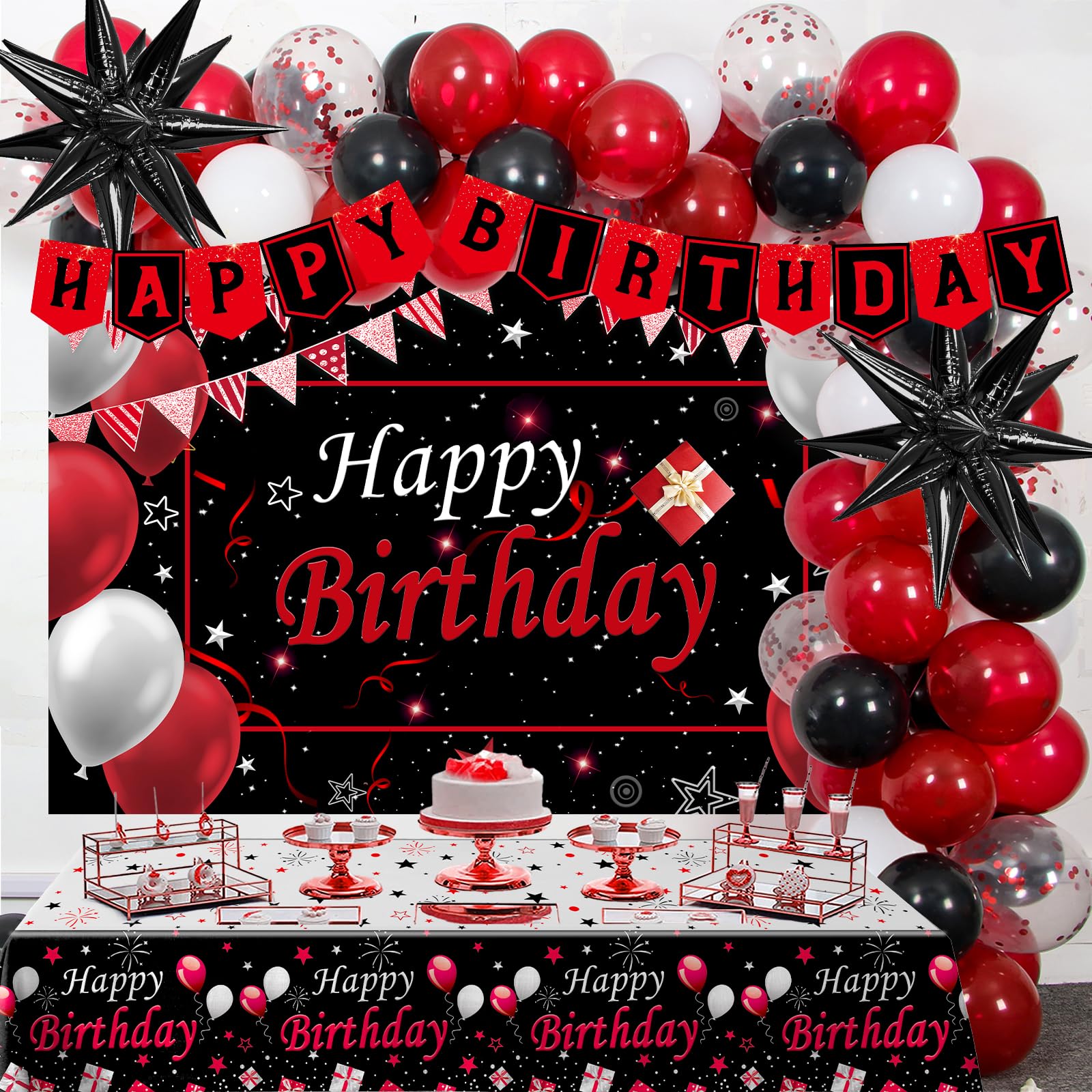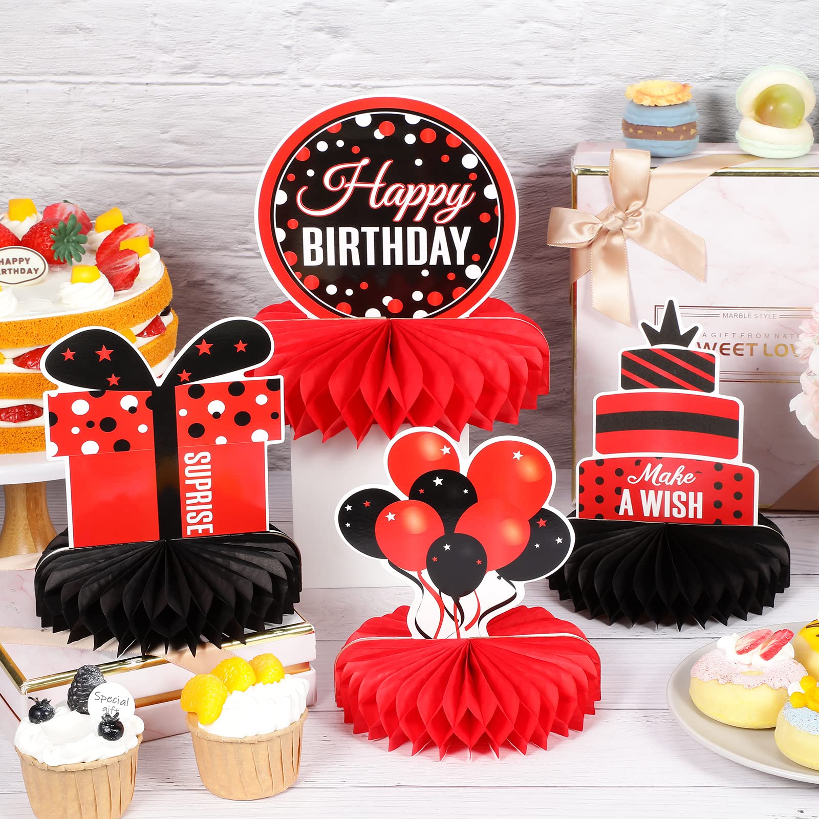 Exquisite Design: distinctive red and black birthday honeycomb table decorations feature delicate and diverse pattern designs, including cakes, balloons, stars, gift boxes, etc., will make your birthday party more different