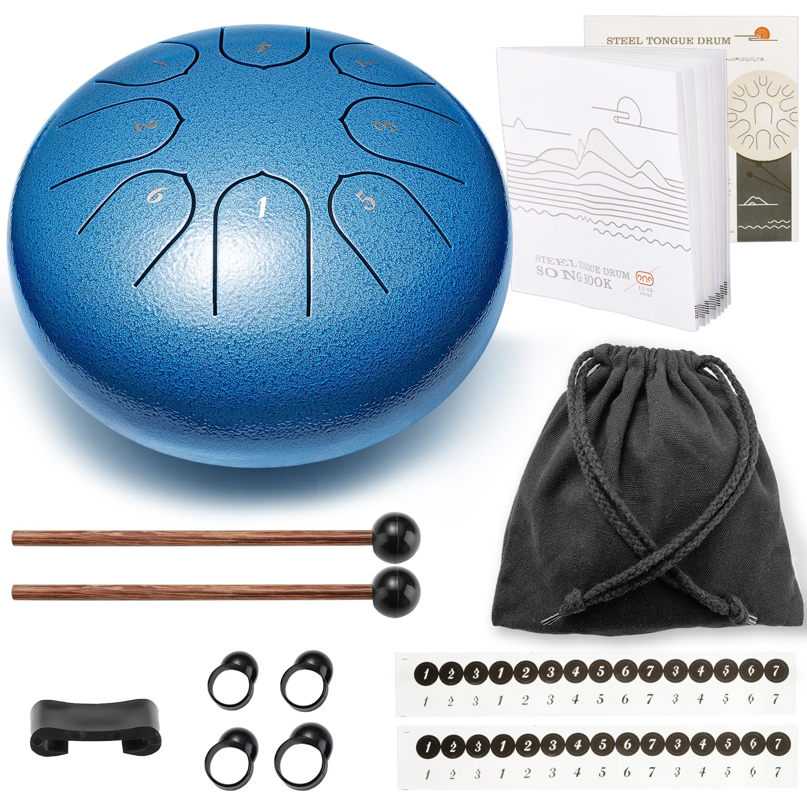 π Accessories Upgrade: 6 inch steel drum, drum mallets, drum bag, finger plectrums, spare note stickers, sheet music, mallets stand. Steel drum are a total of 8 tones, which have a wider range of sound and can play more music. You can play steel drum with the included drum mallets or with you hands, and the included note enable beginners to learn and play it more easily. Steel drum comes with a carry-on bag for easy carryinag