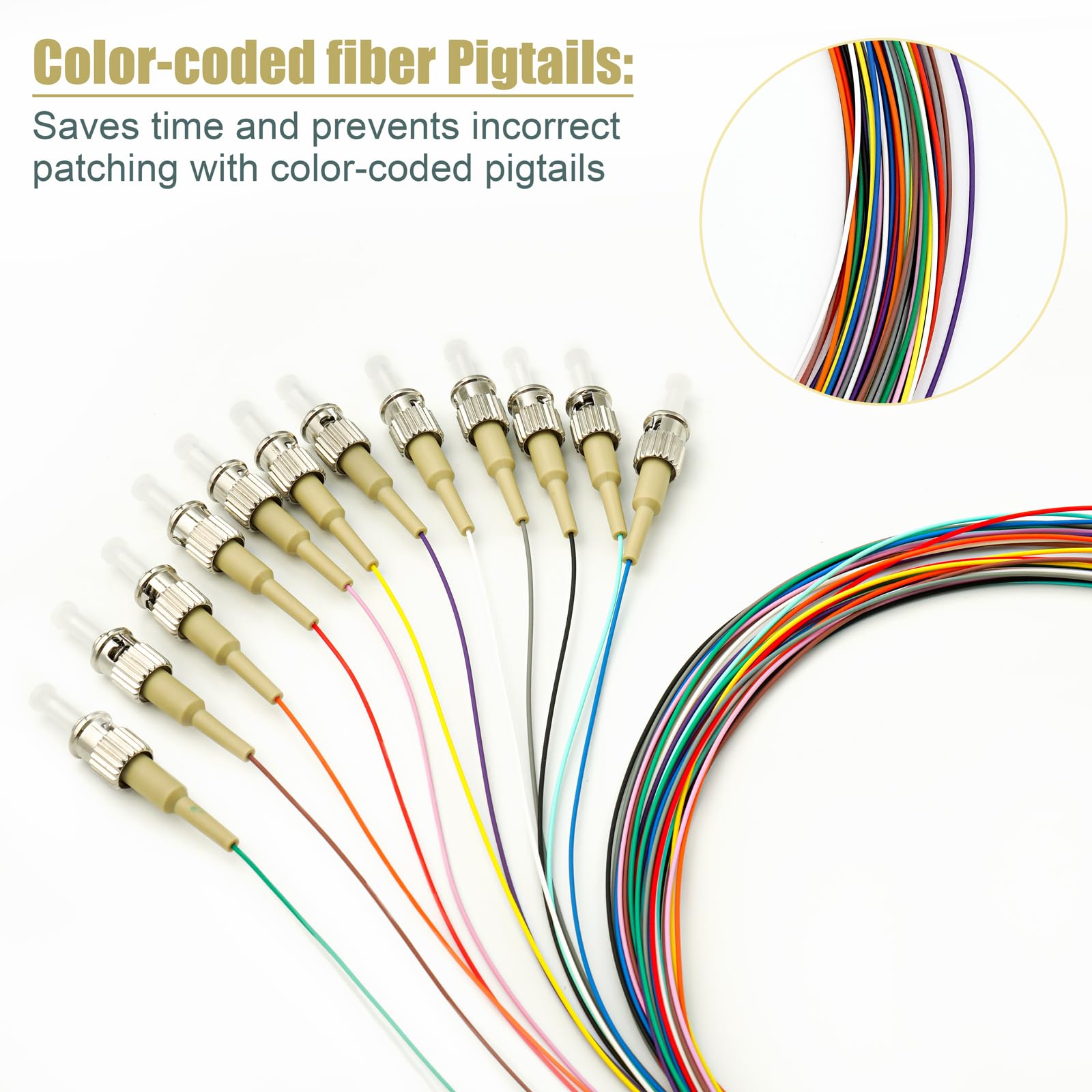 Color-coded Fiber Pigtails: Individually colored to easily match color-coded Fiber Cable that will be spliced. Saves time and prevents incorrect patching with color-coded pigtails