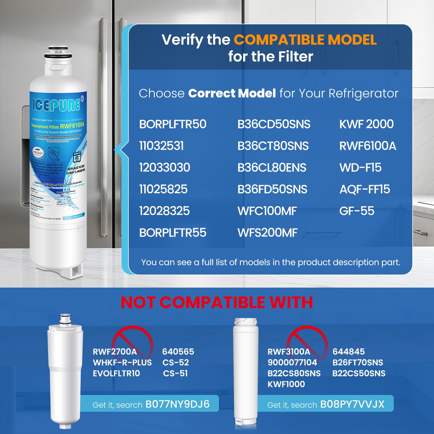 Efficient Filtration Capacity‒ ICEPURE RWF6100A refrigerator water filter replacement for BORPLFTR50 reduces substances from your water including 99% of Chlorine, taste, THM, VOCs, Particles and other major impurities, significantly improving the taste of drinking water to provide pure-tasting water, while retaining minerals beneficial to the human body.