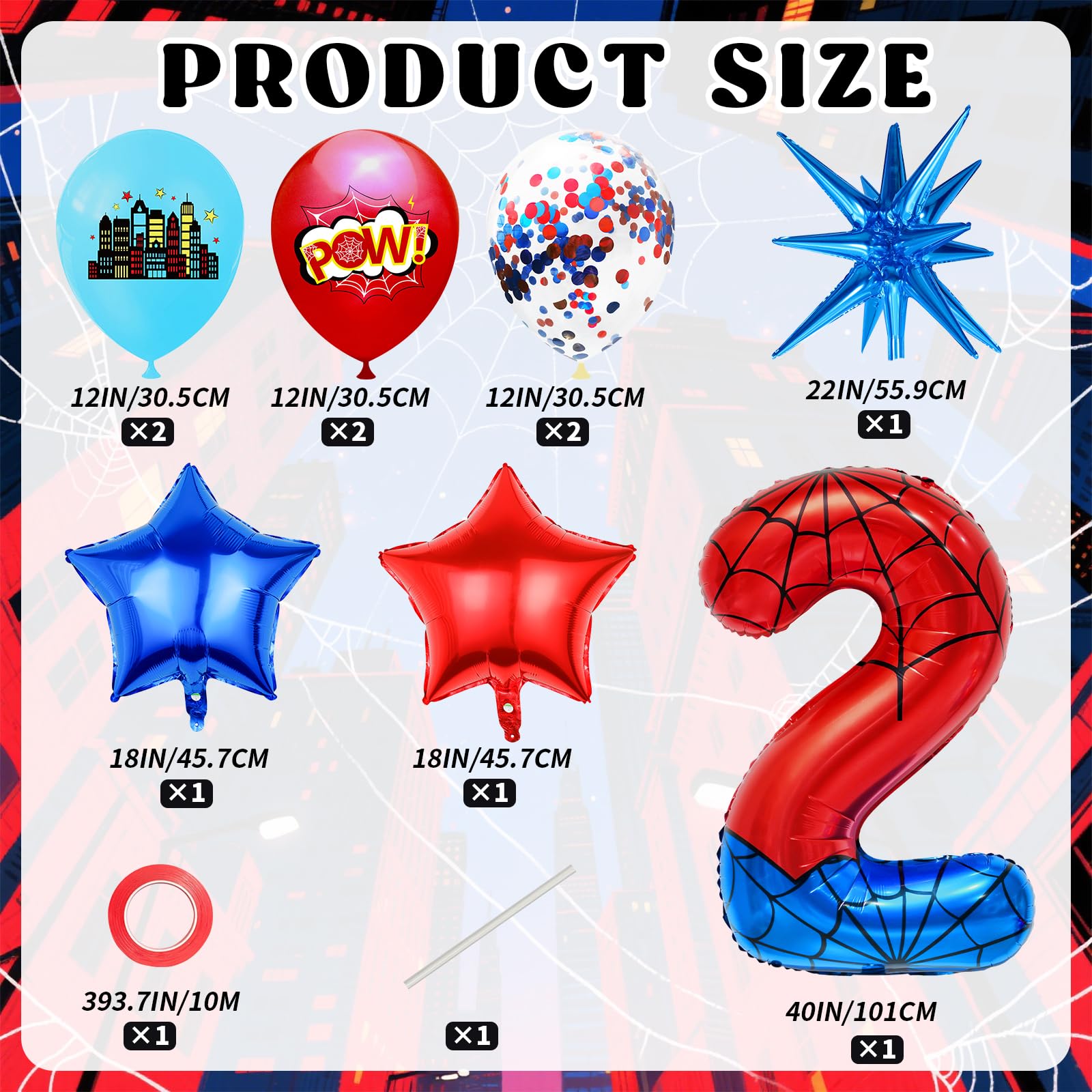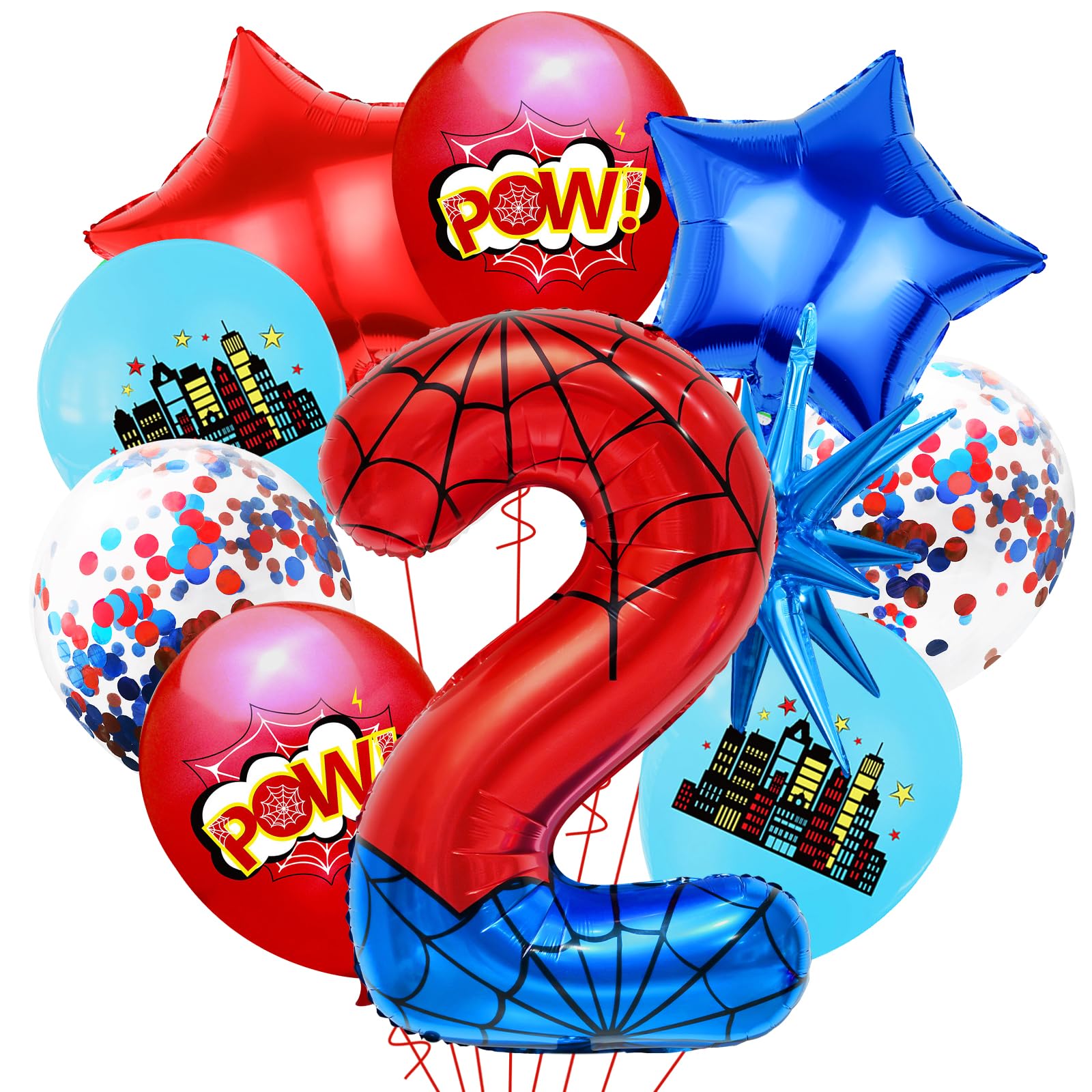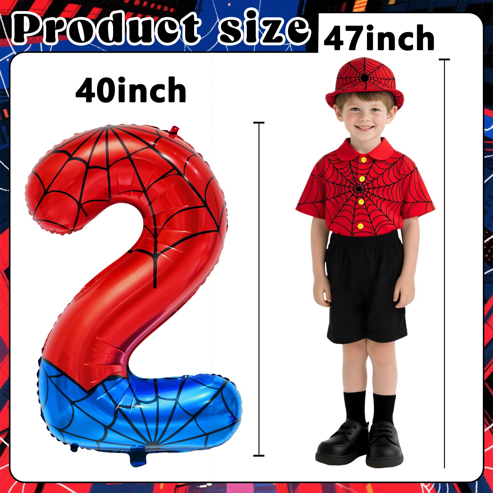Transform your superhero-themed celebration with this spectacular 40-inch Number 2 foil balloon! Featuring a stunning red and blue color scheme with intricate spider web patterns, this giant balloon makes an unforgettable statement at any birthday party. The top portion showcases a vibrant red hue while the bottom displays a bold royal blue, both adorned with detailed white web designs that create an amazing visual effect. Standing at an impressive 41 inches tall, this high-quality foil balloon commands attention as a centerpiece or wall decoration. Perfect for superhero enthusiasts, the balloon brings a perfect blend of action and excitement to your party atmosphere. The metallic finish catches light beautifully, creating an eye-catching display that will wow your guests. Easy to inflate and durable throughout your celebration, this number balloon is an essential addition to your party decorations. Combine with other superhero-themed decorations for a complete party transformation that young heroes will remember!