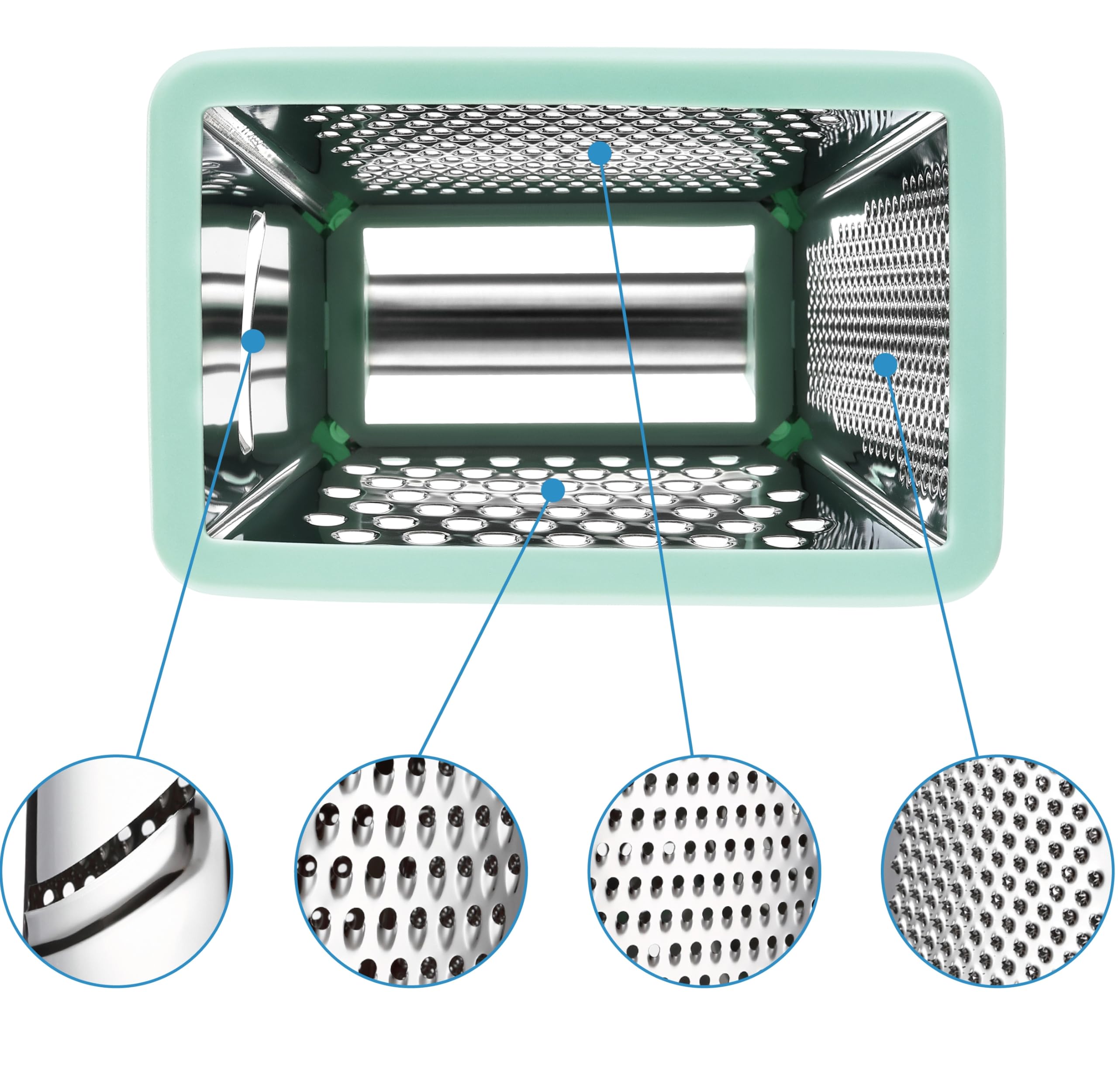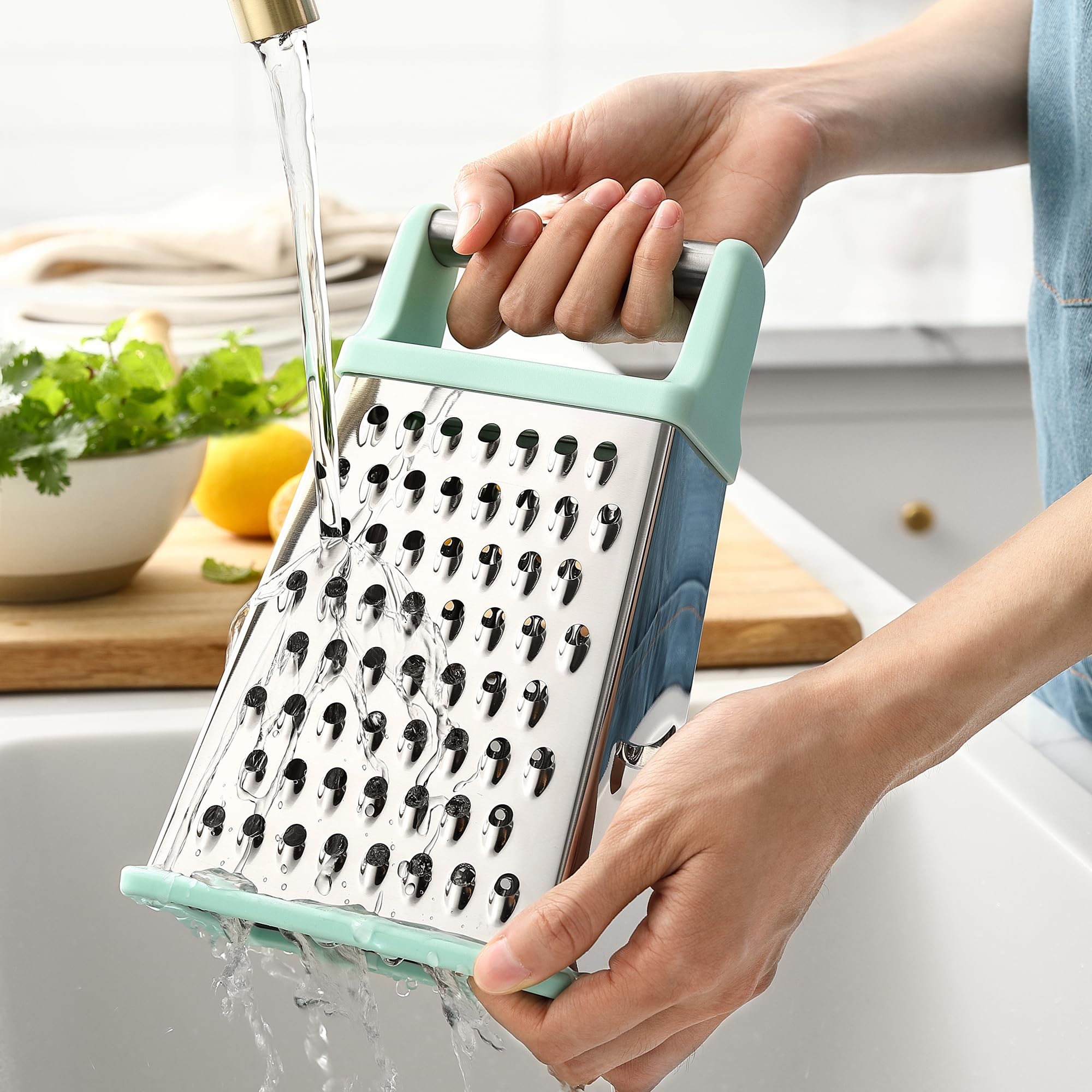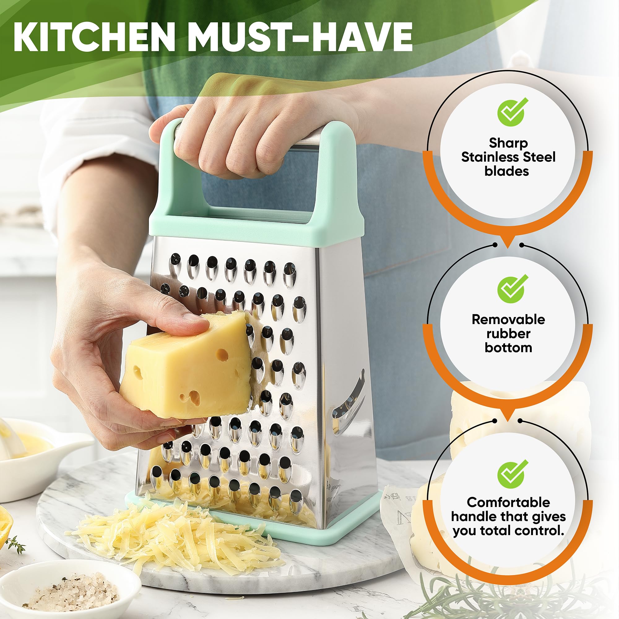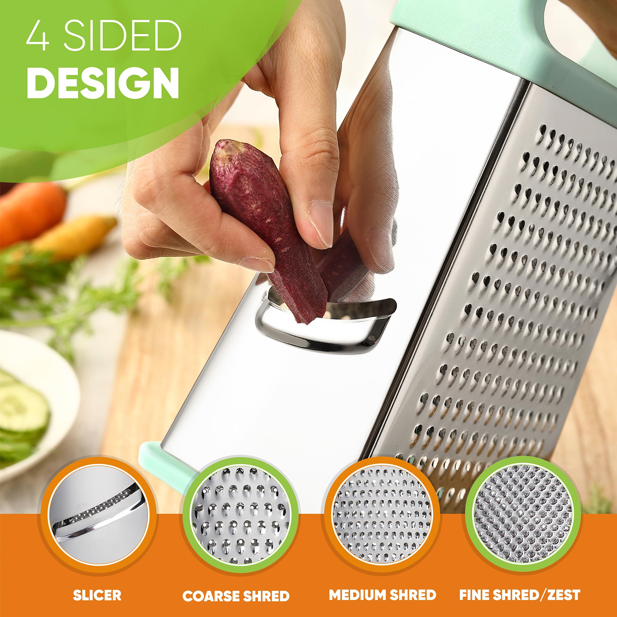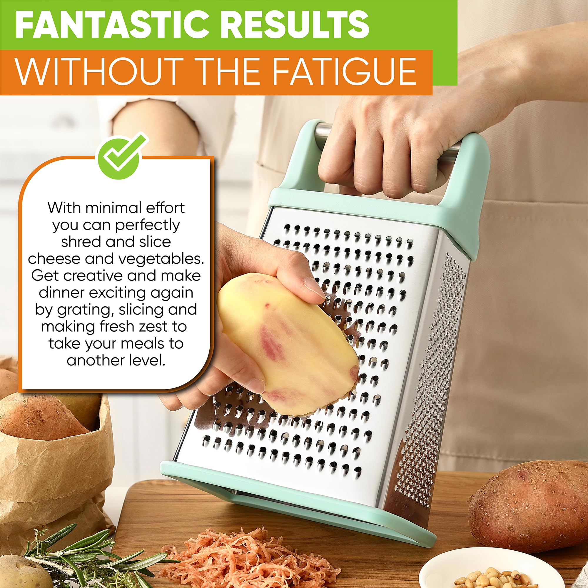 Incredible Versatility With The 4 Sided Design: Consider getting rid of all the other graters and slicers you may own to make room for this. Coarse grating, Medium grating, Fine grating/Zester and even a Slicer - all in one convenient tool. Quickly prep an array of foods like cheese, potato, squash, zucchini, carrots, lemons and cucumbers. Multi-functional with a comfortable handle that gives you total control.