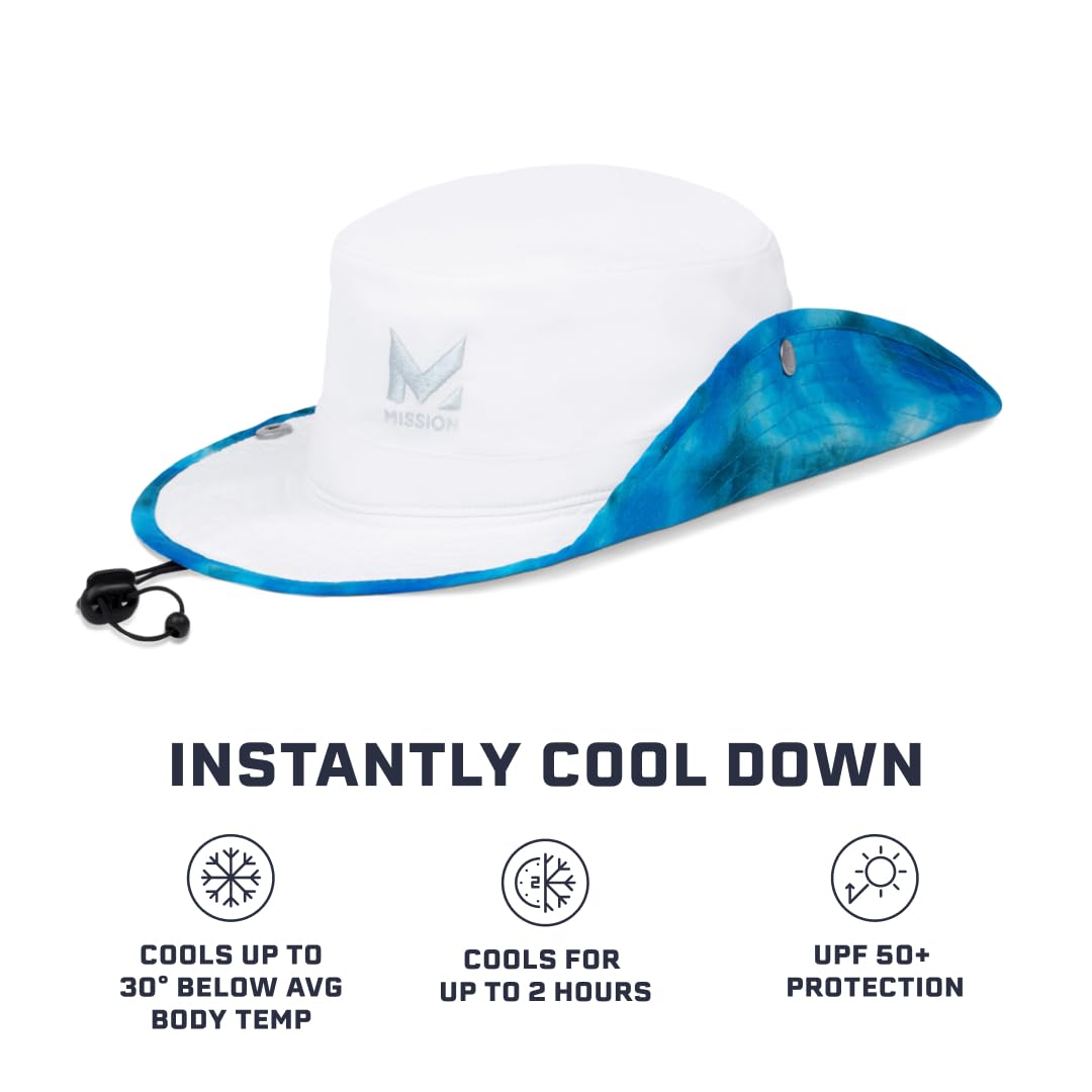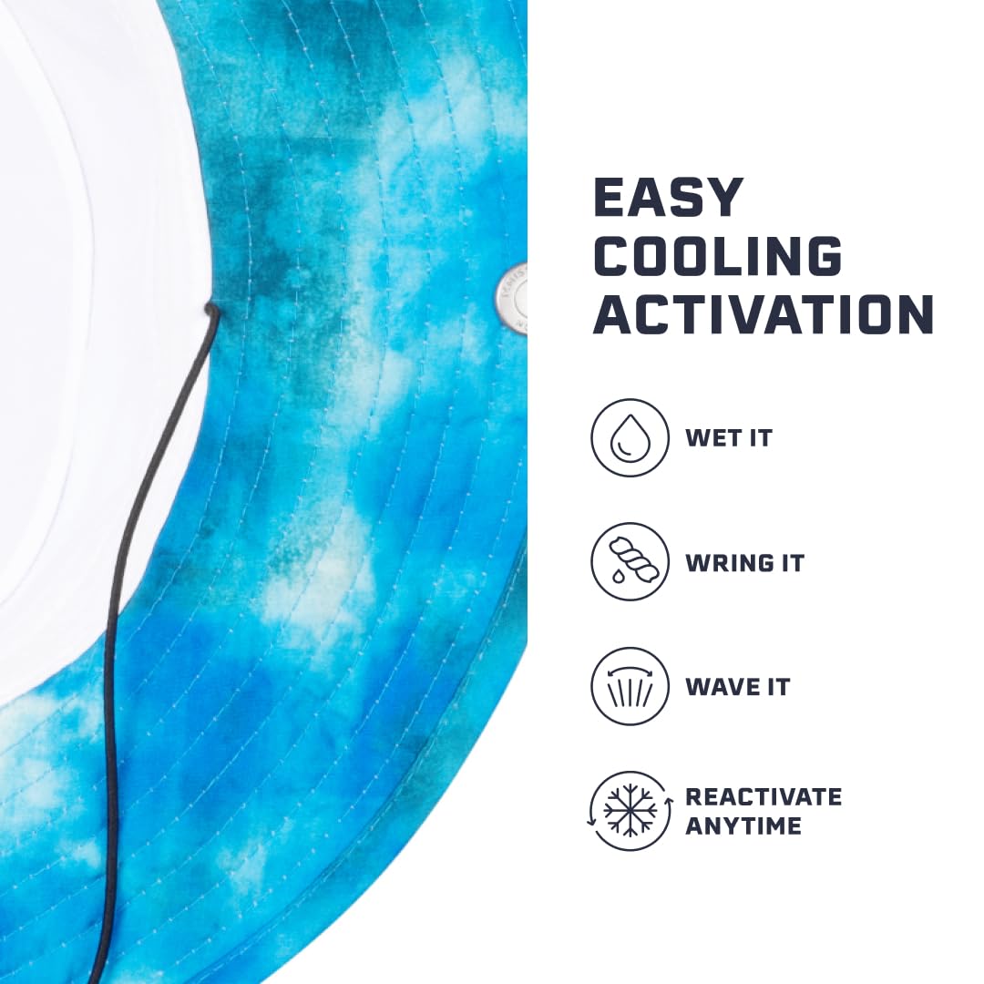 WATER & SWEAT ACTIVATED TECHNOLOGY: This cooling wide-brim hat incorporates advanced Wet-to-Cool Technology, which absorbs water or sweat to cool the hat by up to 30 degrees below average body temperature in under 1 minute. This innovative feature allows the hat to stay cool for up to 2 hours or longer with reactivation. By keeping cool, you can stay focused and dedicated to your activities without distraction. To activate your hat, simply follow these 3 steps: wet, wring, and wave.