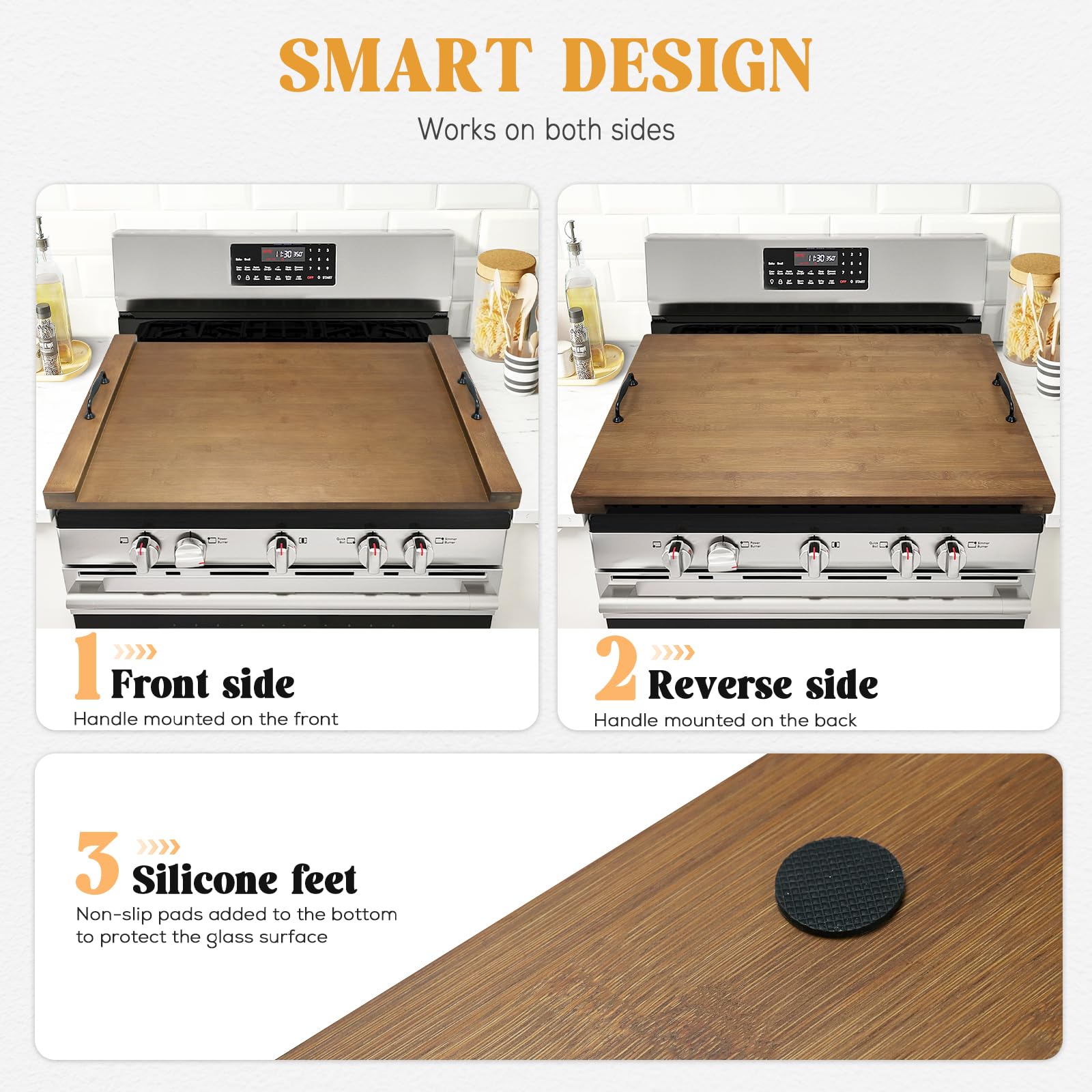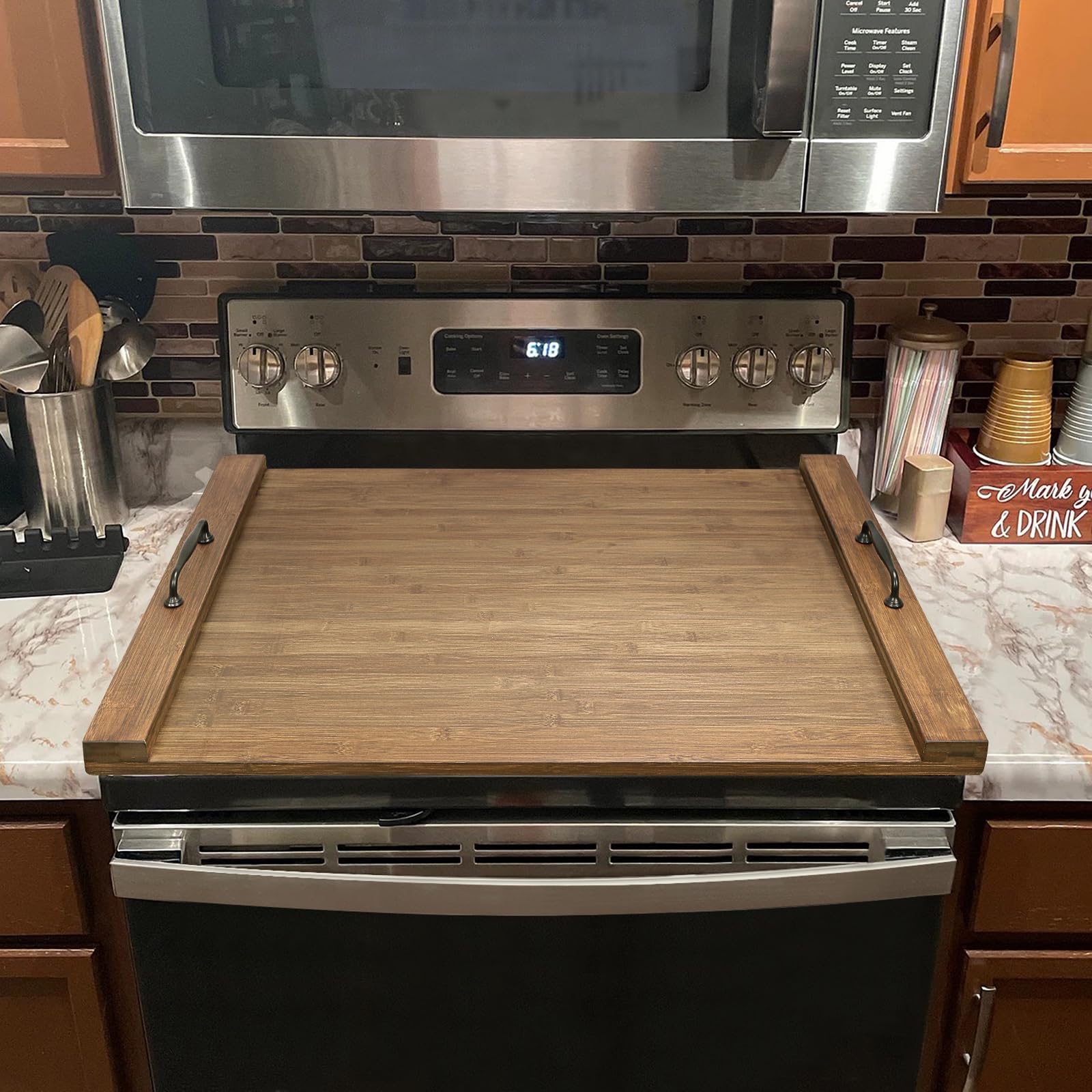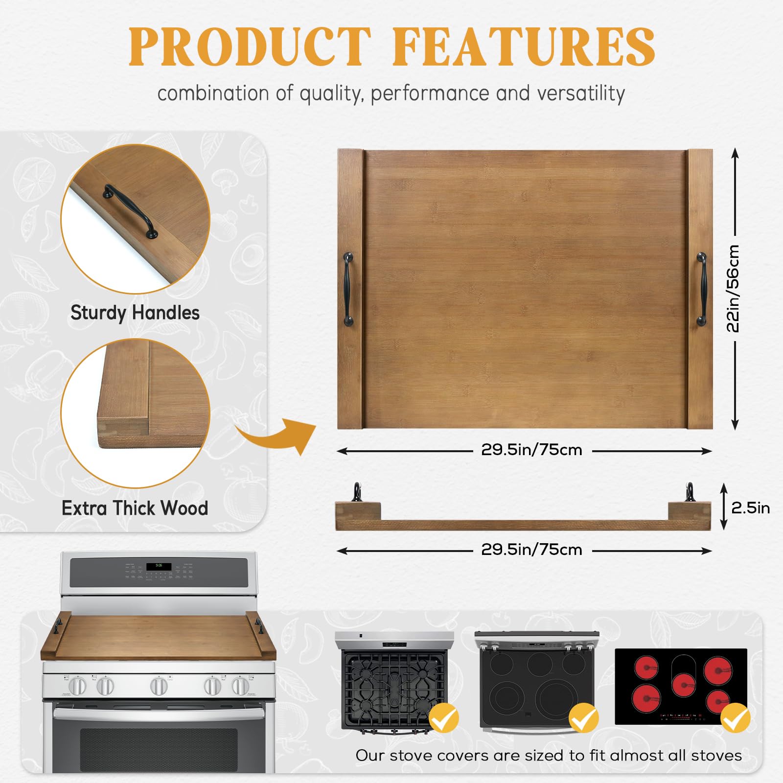 ELEGANT WOOD: The stovetop cover board is expertly crafted from bamboo of the highest quality. our stovetop cover is 29.5 inches wide x 22 inches deep and fit almost all stoves