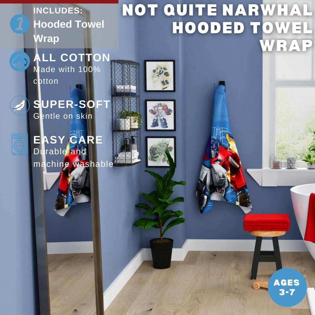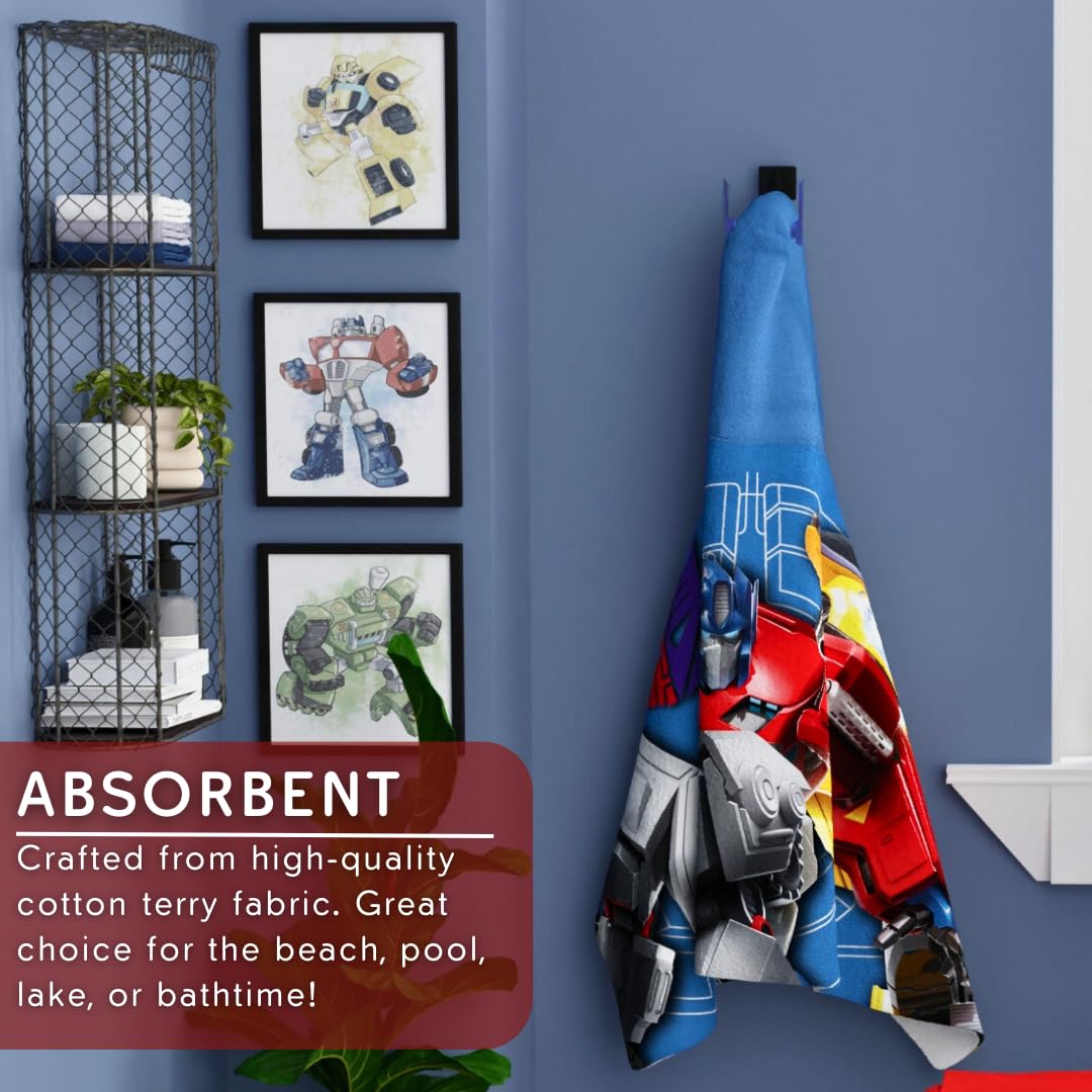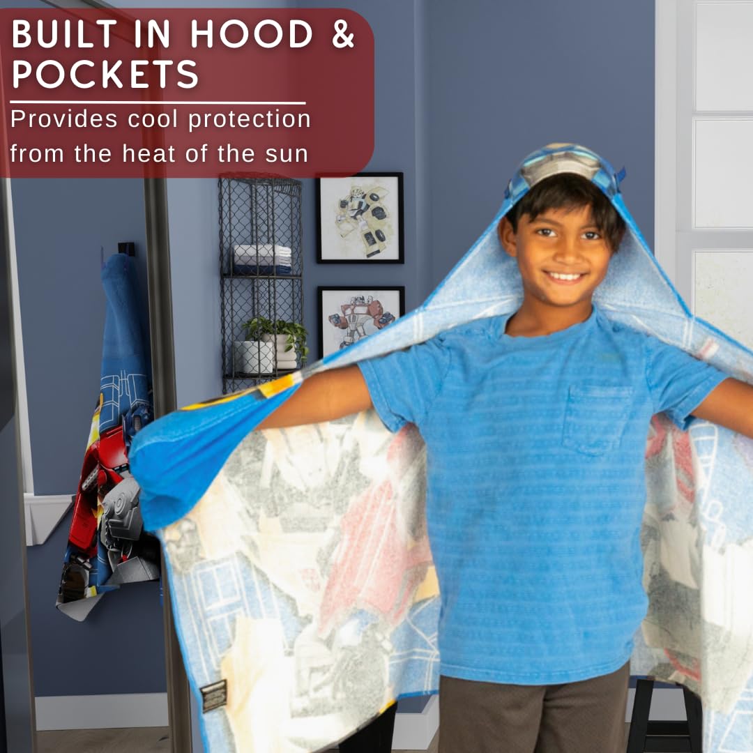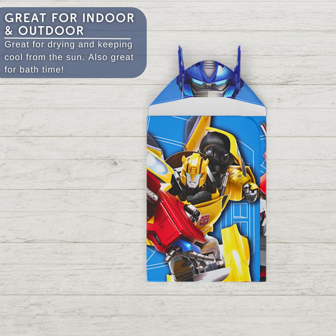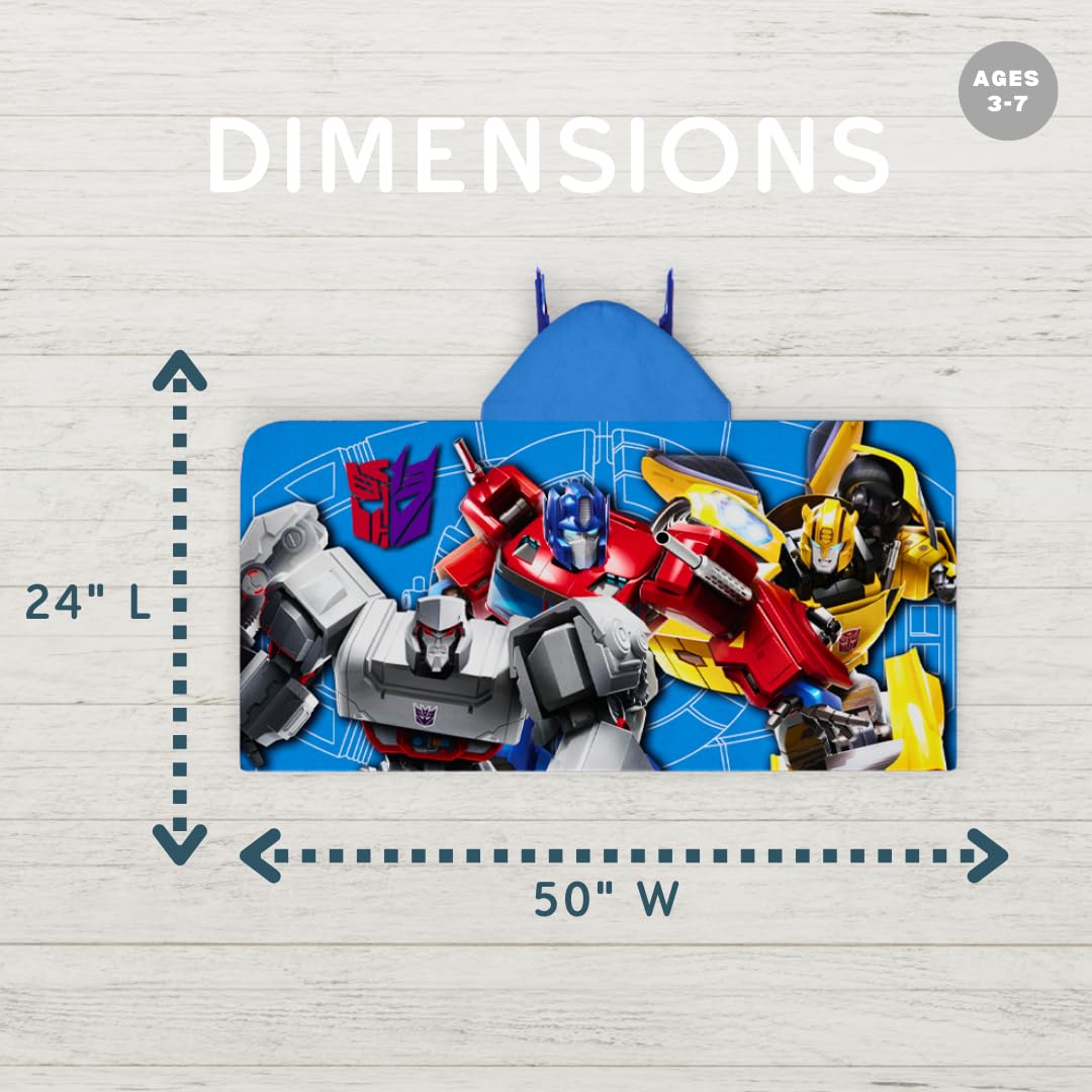 Unleash the power of the Transformers with our exclusive Transformers Hooded Towel Wrap. Measuring a generous 24"x50", it's designed for ultimate comfort and coverage. Crafted from high-quality cotton, it's not just a towel; it's a symbol of post-bathtime transformation. The true marvel of this towel wrap lies on the back, where Optimus Prime, Bumblebee, and other legendary Transformers stand tall in striking shades of grey. It's a visual spectacle that encapsulates the thrilling adventures of the new show, turning your child's bath time into an action-packed spectacle. What makes our Transformers Hooded Towel Wrap even more extraordinary is its official licensing. We've partnered with the creators of Transformers to ensure this product captures the essence of the series. You're not just purchasing a towel; you're acquiring a piece of the Transformers universe, backed by authenticity and quality. Let your child step into the world of Autobots and Decepticons with our Transformers Hooded Towel Wrap. It's not just a towel; it's an epic journey in cotton form, officially licensed and ready to make bath time an adventure like no other.