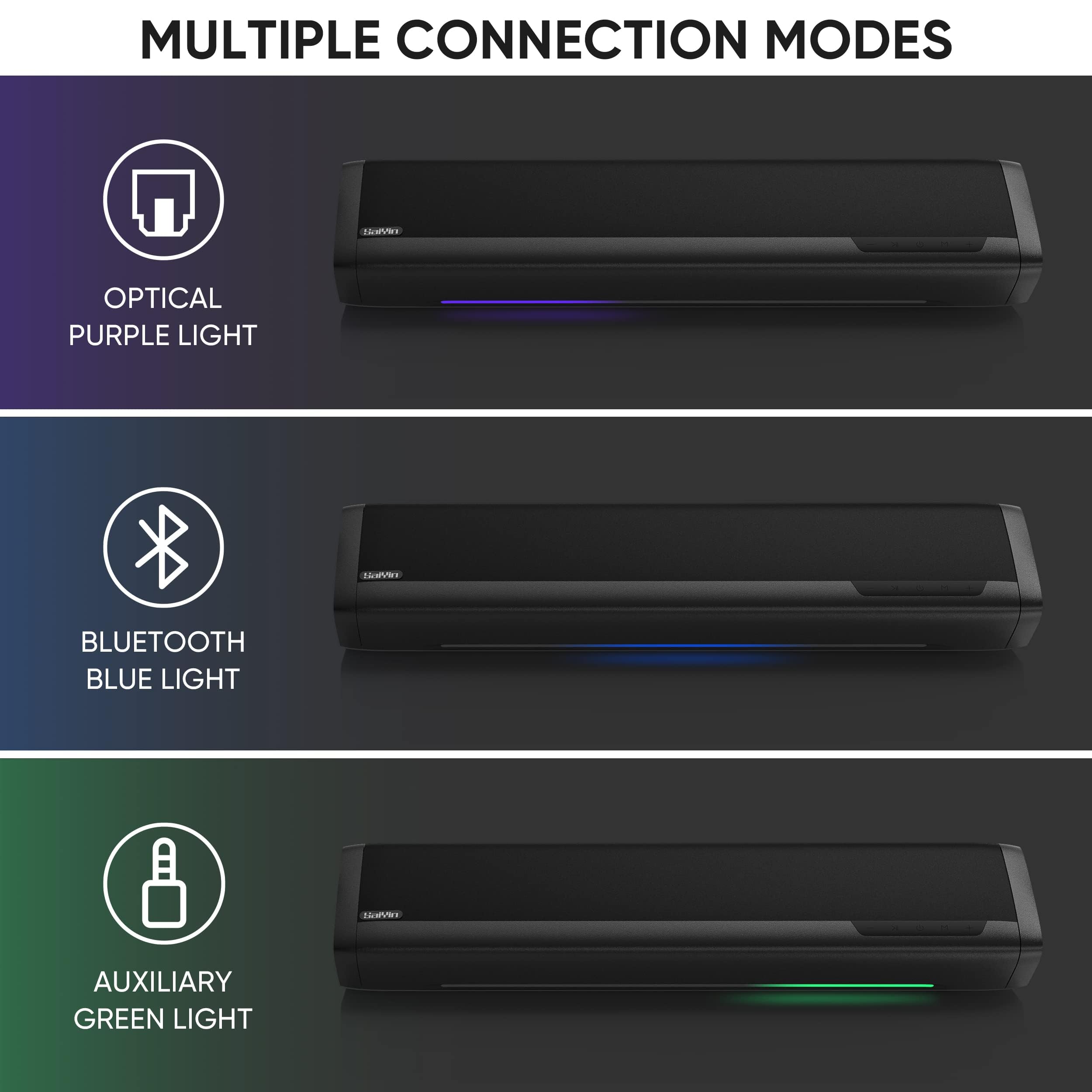 【Multifunctional LED Indicator&Soft Light】Unlike other sound bars, The three-color LED lights help you better identify which the connection mode the sound bar is on(Optical-Purple, Bluetooth-Blue, Auxiliary-Green). Not only that, the volume progress bar below soundbar reminds you the volume level of total or bass.The soundbar's hidden LED indicator and soft lighting make it possible for you to watch TV without distractions.