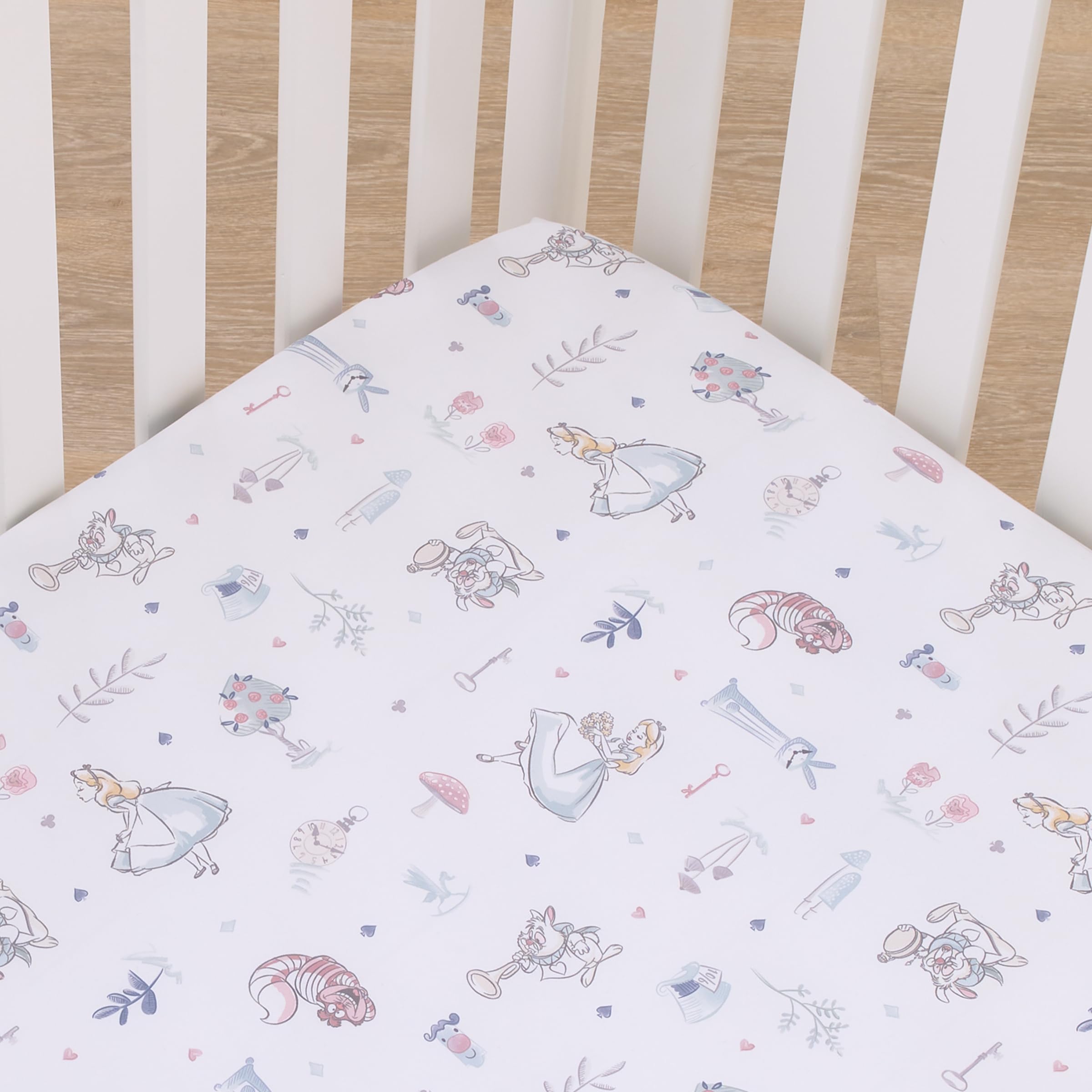 Disney's Whimsical Alice in Wonderland Fitted Mini Crib Sheet features the White Rabbit and Cheshire Cat!