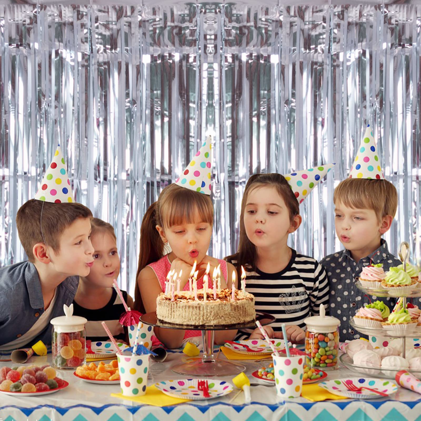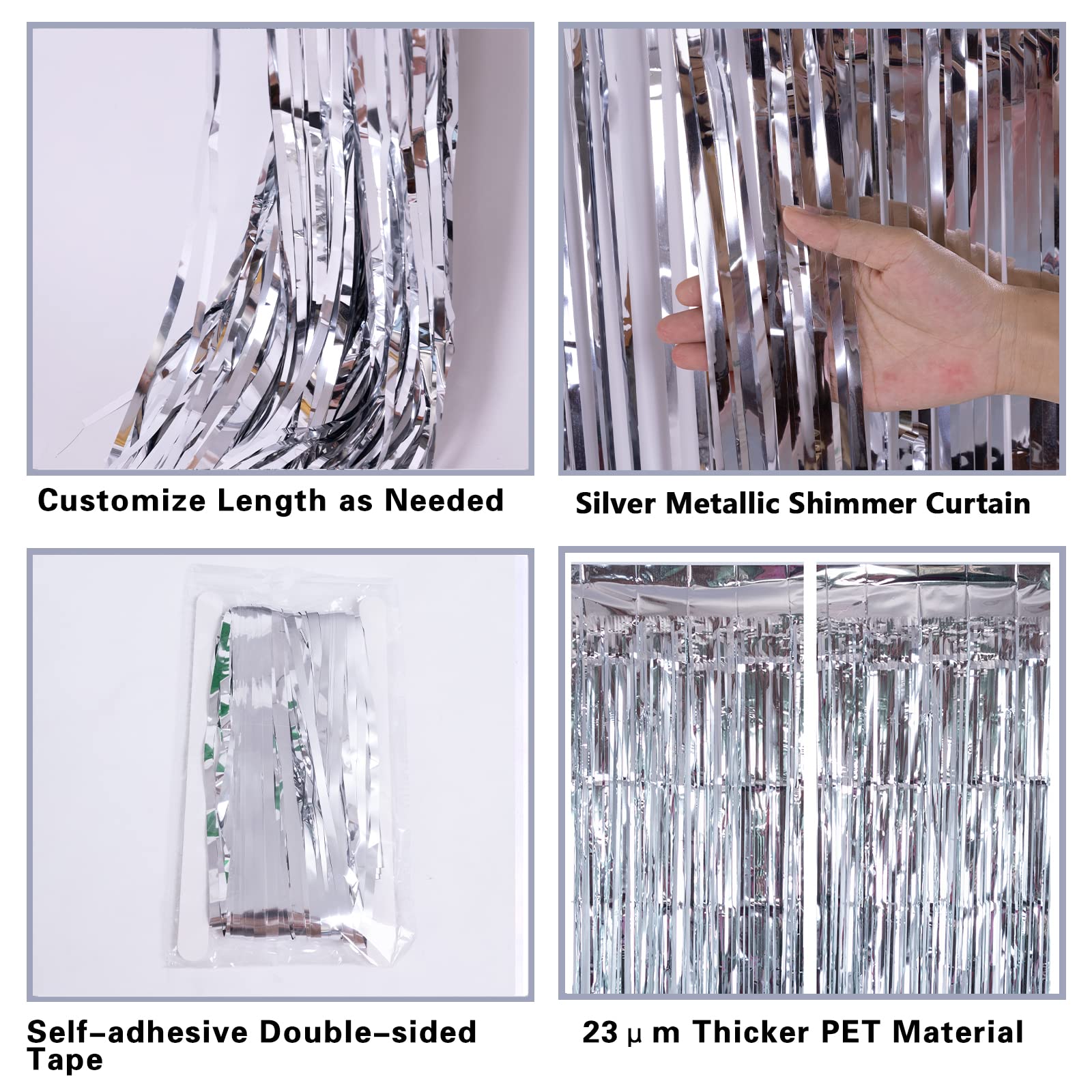 【Waht You Get】Includes 2 packs silver foil fringe curtains, each pack streamer backdrop size is 3.2ft x 8.2ft. Simply hang this silver foil curtain across your doorway to create a glittery surprise and stunning backdrop for your guests.