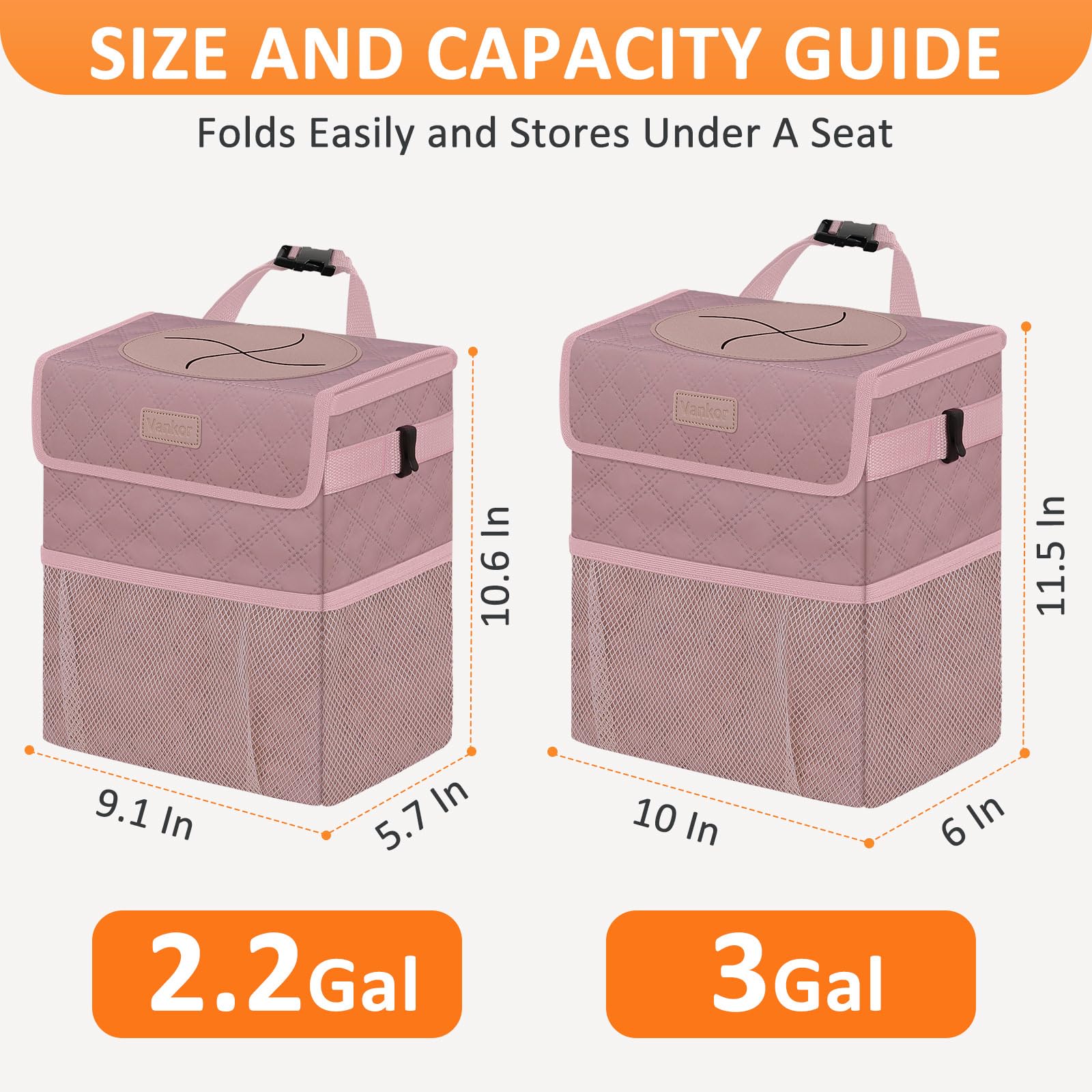 Intimate Design& Capacity: There are 2 side clasps for fixing disposable bags, effectively preventing falling out; Vankor car trash bags have about 2.2 and 3.0 Gallons for storage of car garbage or other stuff; Car trash bin has 100% leak-proof PEVA thick lining, no spillages will happen and is easy to be cleaned; The extra-large opening is made of elastic soft rubber, very roomy and easier to put litter into the bag, and helps to keep trash from spilling