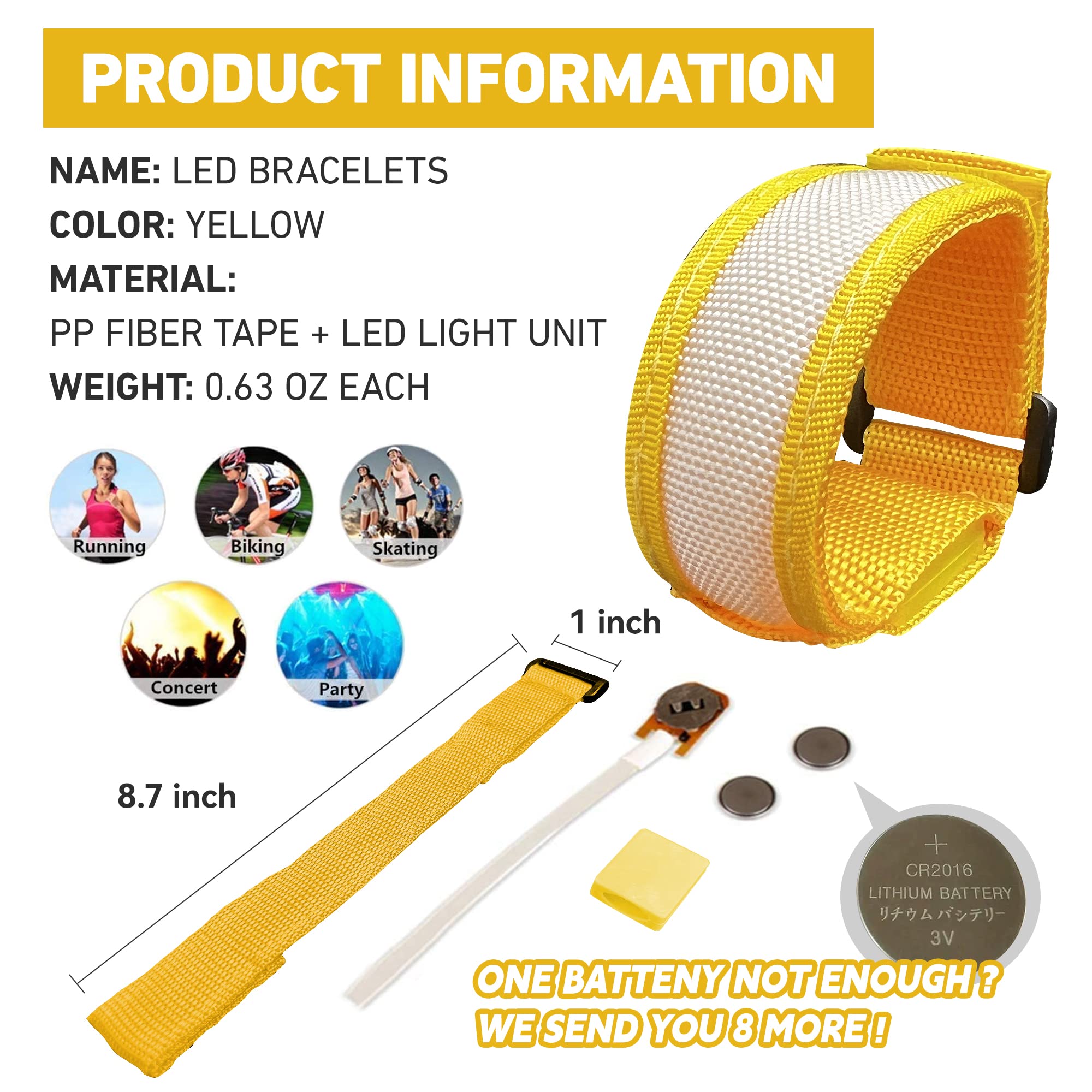 【Super value pack】: 8 Pack LED Wristbands come with batteries in it. Plus 8 extra batteries as gift. Ensuring long hours of fun.