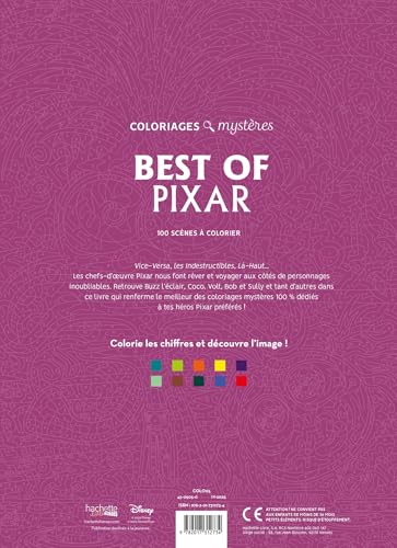 Vice-Versa, les Indestructibles, Là-Haut... Les chefs-d’œuvre Pixar nous font rêver et voyager aux côtés de personnages inoubliables. Retrouve Buzz l’éclair, Coco, Volt, Bob et Sully et tant d’autres dans ce livre qui renferme le meilleur des coloriages mystères 100 % dédiés à tes héros Pixar préférés ! Colorie les chiffres et découvre l’image ! 1 - CHOISIS TES OUTILS - crayons de couleur, feutres à eau ou feutres acryliques 2 - COLORIE LES NUMÉROS selon le code couleur pour révéler une magnifique illustration Disney ! 3 - PROFITE d'un moment de détente avec les livres de coloriage Hachette Heroes ! 100 PAGES DE COLORIAGE MYSTERE - pour des heures de divertissement GRAND FORMAT - le format 300 mm x 215 mm pour donner vie aux personnages PAPIER PREMIUM - pour éviter tout débordement UN CADEAU PARFAIT - pour les fans de Disney de tous âges