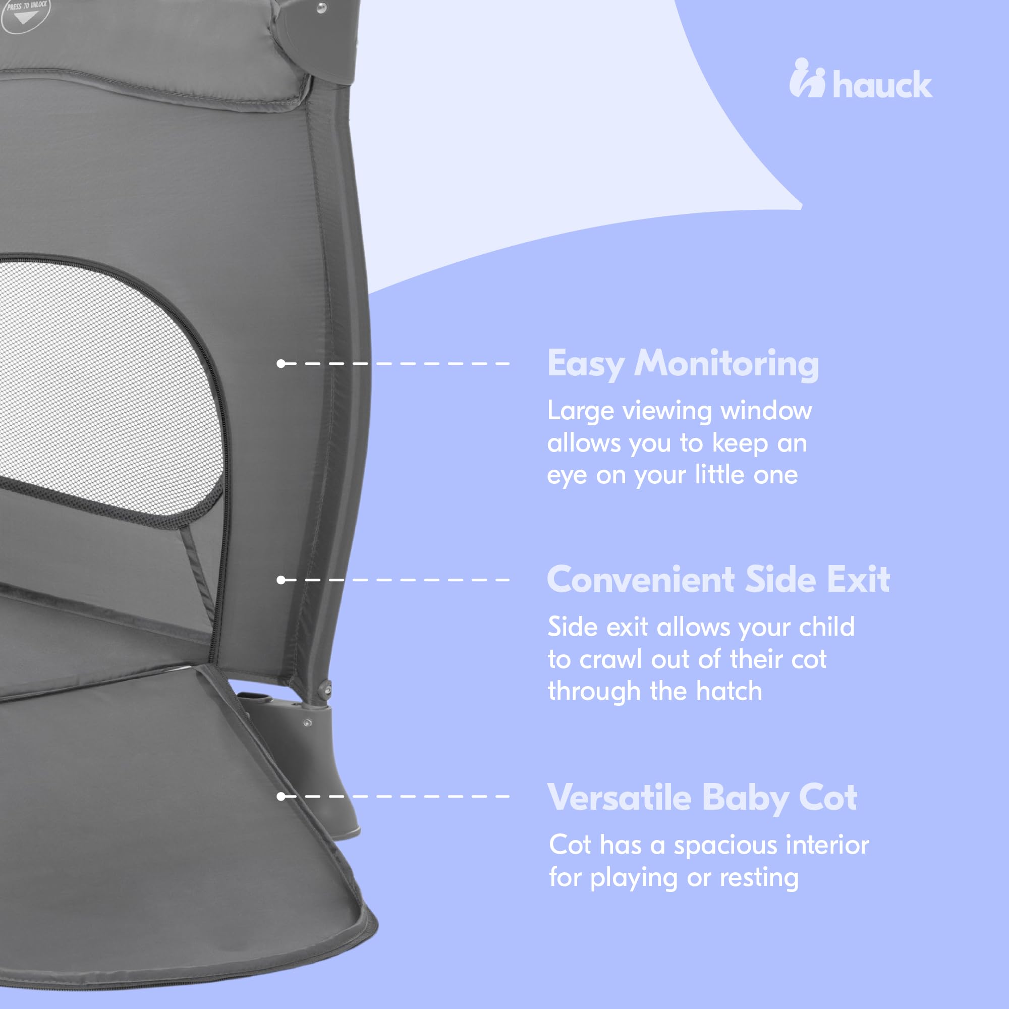 Easy Portability: Featuring wheels for easy movement between rooms, this travel cot keeps your child close and secure wherever you are, with a side exit for toddlers to crawl in and out