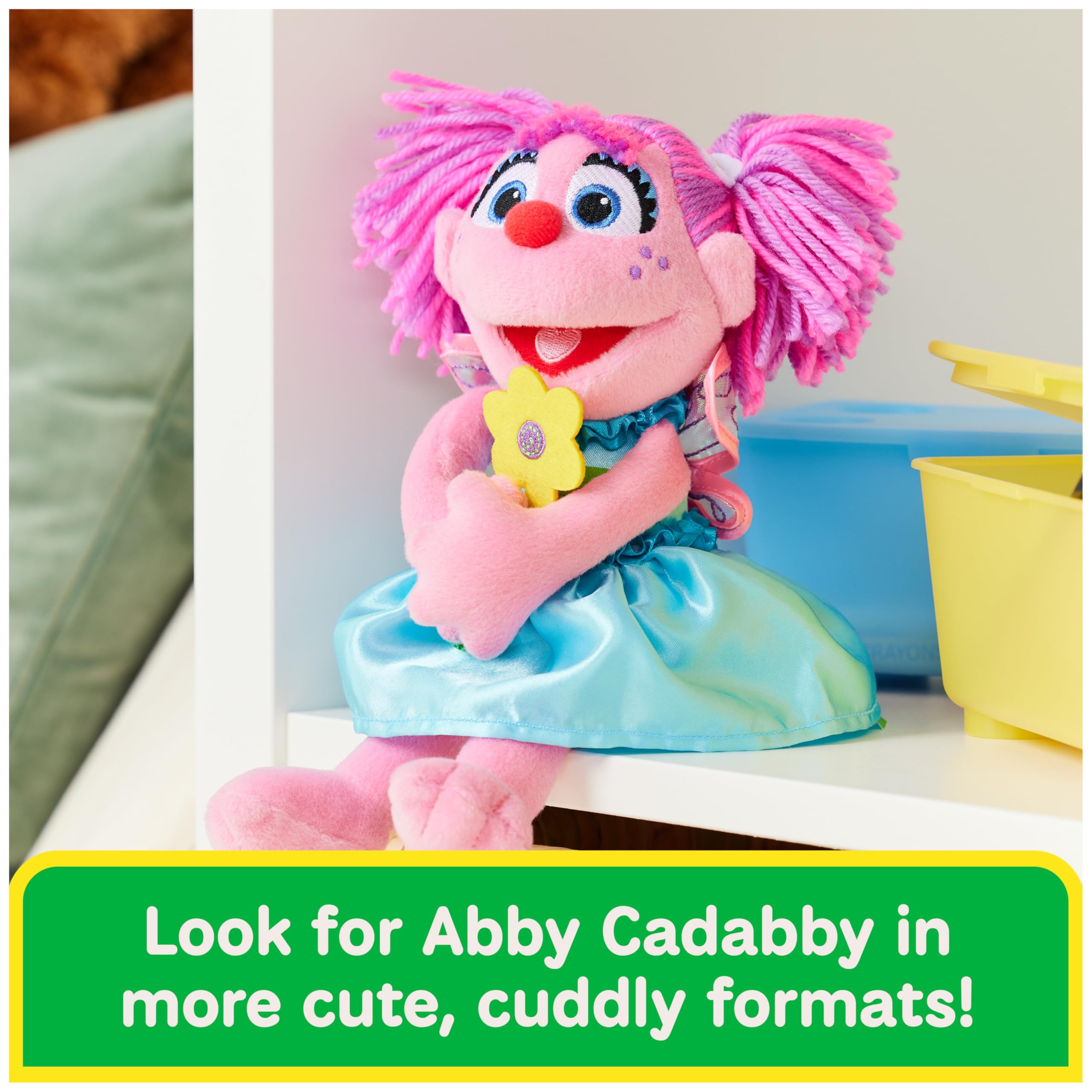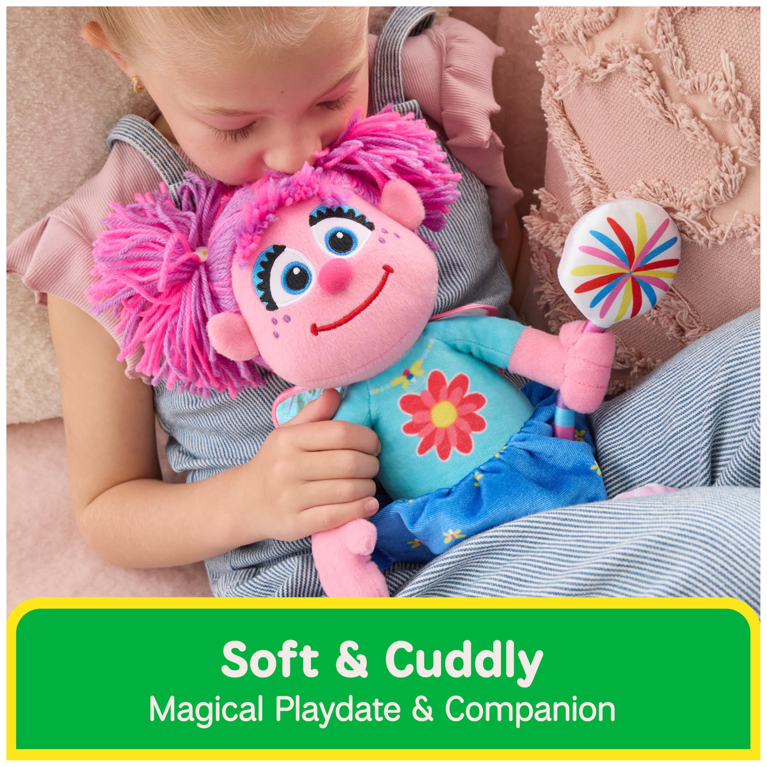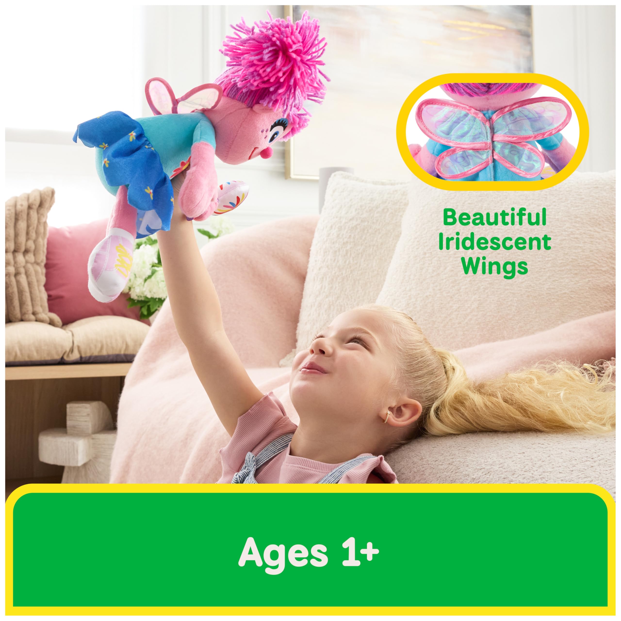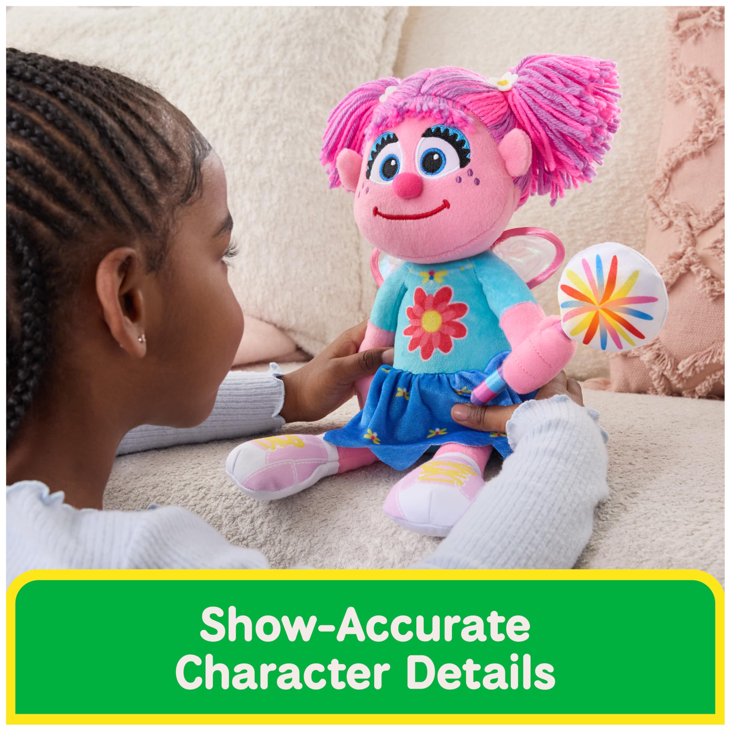Thatβs so magic! Abby Cadabby is bringing the magic to every playdate as a cuddly 13β plush! Since her debut in 2006, Abby is the whimsical fairy resident of Sesame Street who can pop in and out of thin air and shares her magic with friends by turning objects into pumpkins and floating when sheβs happy. Now sheβs here to join your plush collection and brighten the playdate with her magic wand! This adorable plush features Abby with shiny, sheer iridescent wings and signature sky-blue satiny dress, holding her magic wand with a cheerful smile. Press her tummy with a gentle squeeze and the wand lights up with a soft amber glow, offering comfort even for little ones who are afraid of the dark. She also features soft pink plush and her bright pink and purple yarn hair in pigtails, with embroidered facial details and a soft, huggable body that makes her fun and display-ready for all ages 1 and up. This plush toy is surface-washable for easy cleaning and ships in a protective poly bag.