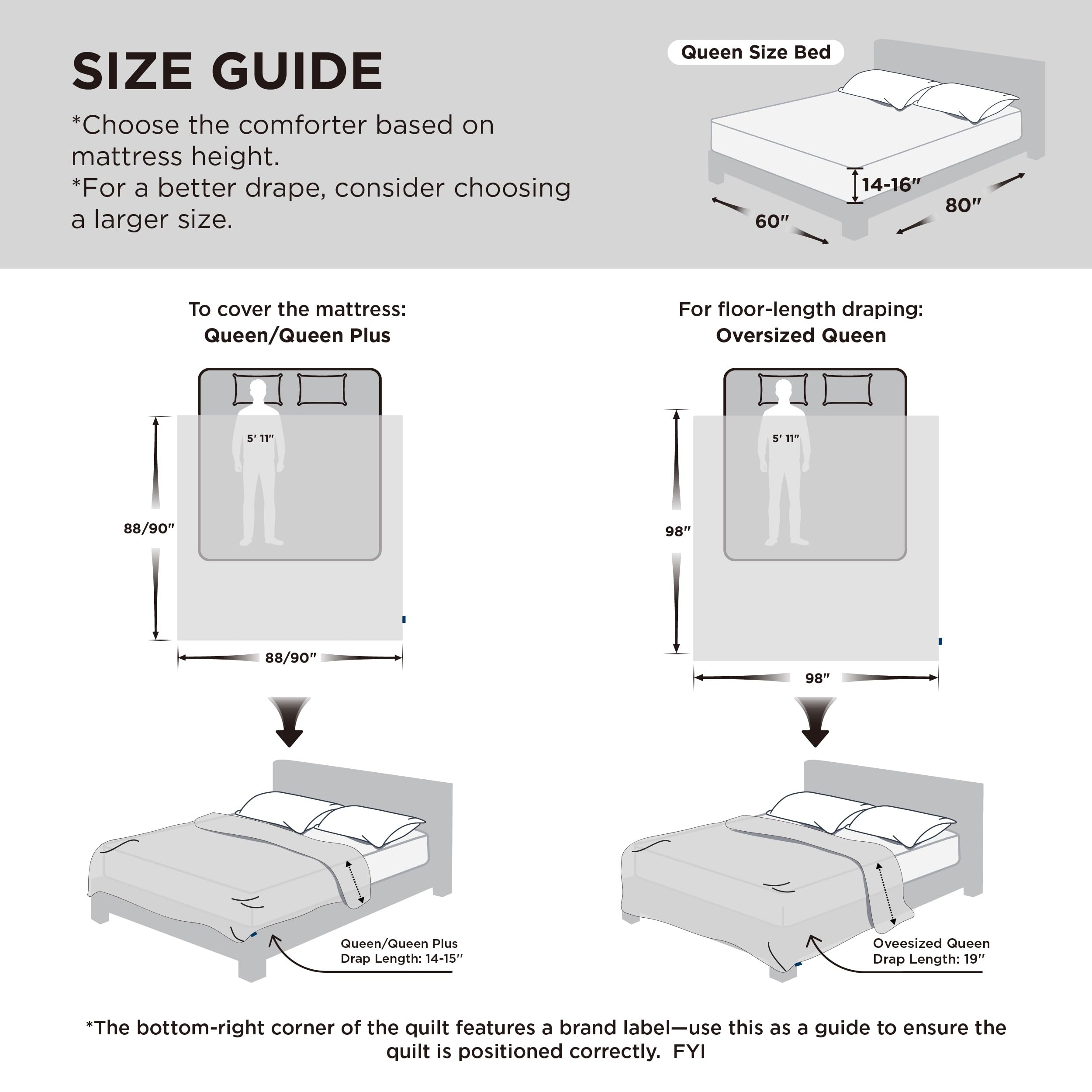 The Bedsure Down Alternative Comforters are available in multiple sizes, including Twin (68"x88"), Twin XL (68"x92"), Full (82"x86"), Queen (88"x88"), Queen Plus (90"x90"), Oversized Queen(98" x 98"), King (102"x90"), Cal King (102"x96"), Oversized King(116" x 98") and Alaskan King(120"x130")