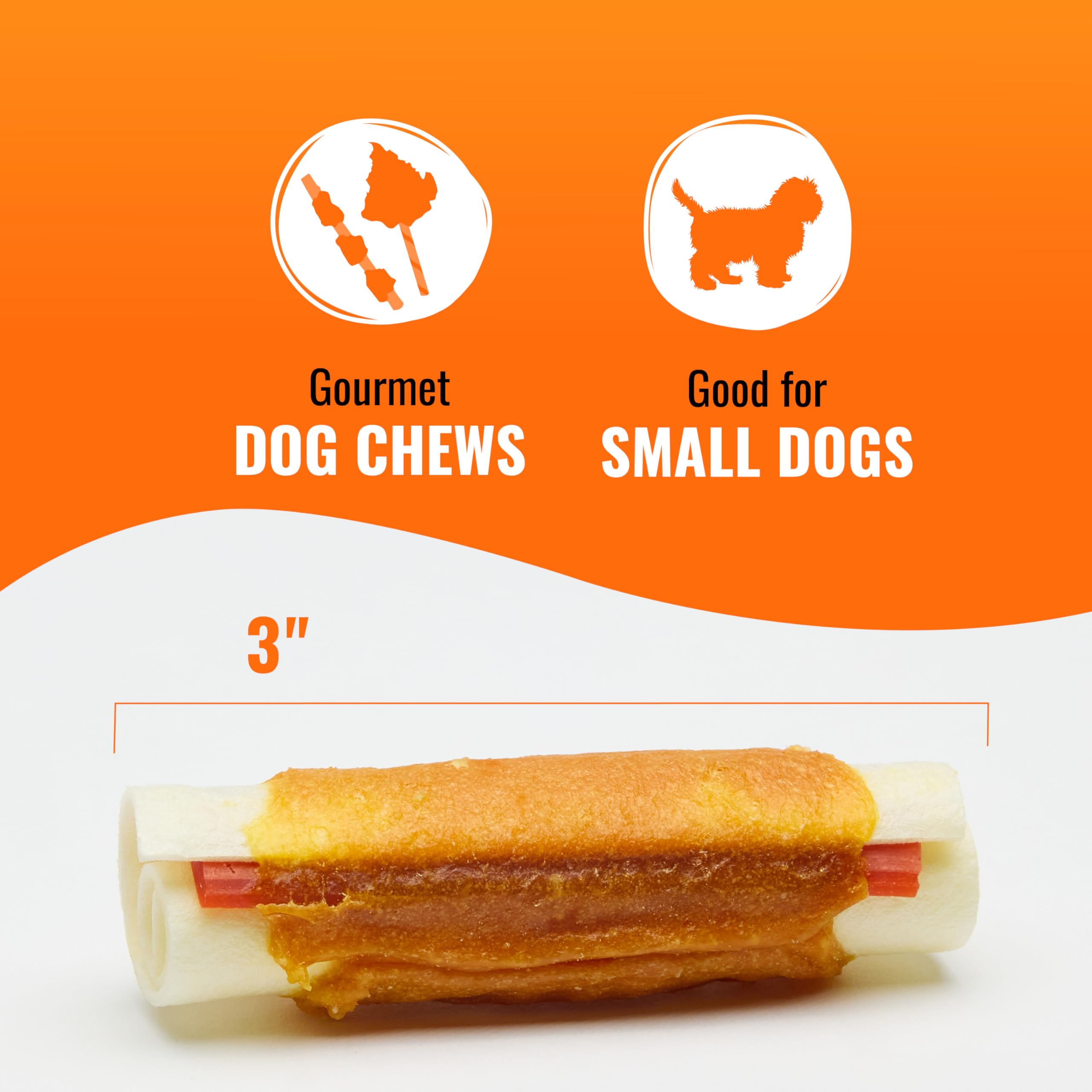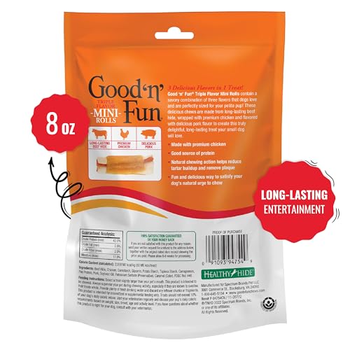 Good ‘n’ Fun Triple Flavor Mini Rolls contain a savory combination of three flavors that dogs love – long-lasting beef hide, premium chicken and delicious pork flavor. And, they’re perfectly sized for your petite pup! A good source of protein, these delicious chews are wrapped with premium chicken and flavored with tasty pork flavor to create a truly delightful, long-lasting treat your small dog will love. Plus, the natural chewing action helps reduce tartar buildup and remove plaque. It’s a fun and delicious way to satisfy your dog’s natural urge to chew. Select a treat slightly larger than your pet’s mouth. This product is intended to be chewed. Always supervise your pet during chewing activity, especially if they are known to swallow their treats whole. Provide plenty of fresh drinking water and discard any leftover chunks or fragments. This product is intended for intermittent or supplemental feeding only. Treats should not exceed 10% of your dog’s daily caloric intake. Visit your veterinarian regularly and discuss your pup’s daily caloric requirements based on weight, size, breed, age and activity level. If you have questions about whether this product is right for your dog, consult with your veterinarian.