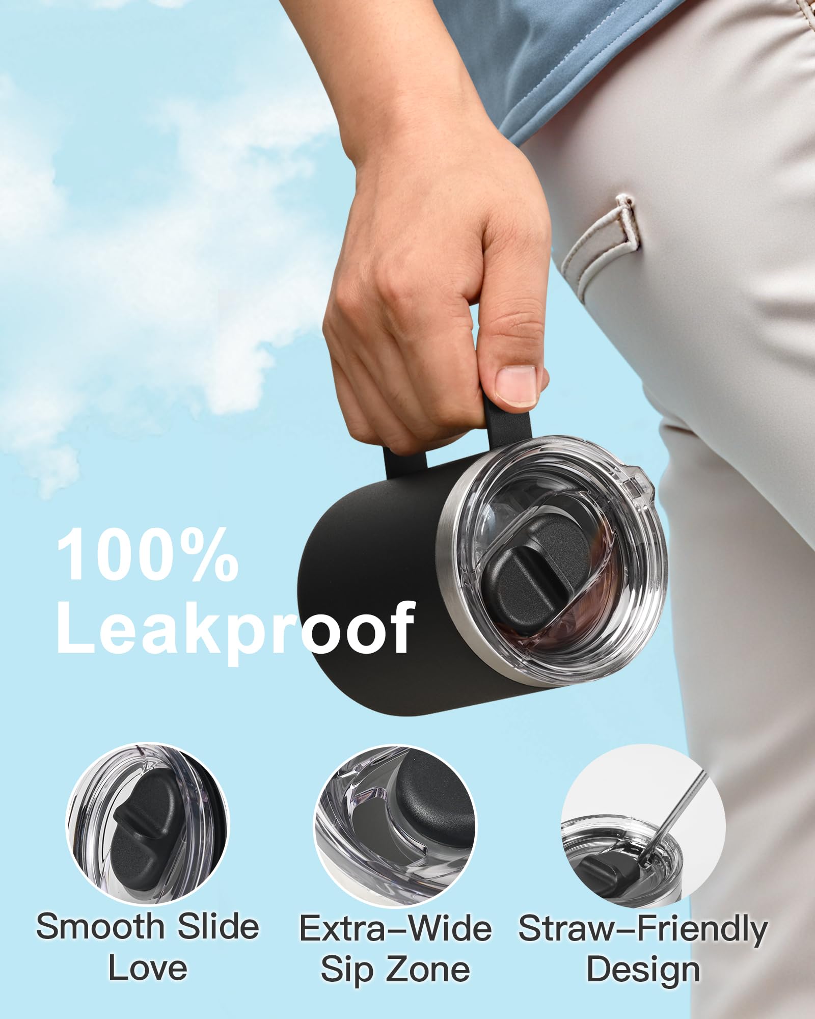 100% Leak-Proof Slider Lid: Exclusive slider lid glides smoothly,settled and locks securely with an airtight seal, staying 100% leak-free even when inverted. Youβll love the effortless sliding action that makes sipping on the go a breeze. Stainless steel coffee mugβs wide-mouth design with soft straws lets you sip comfortably, whether youβre using a straw or drinking straight from the cup!