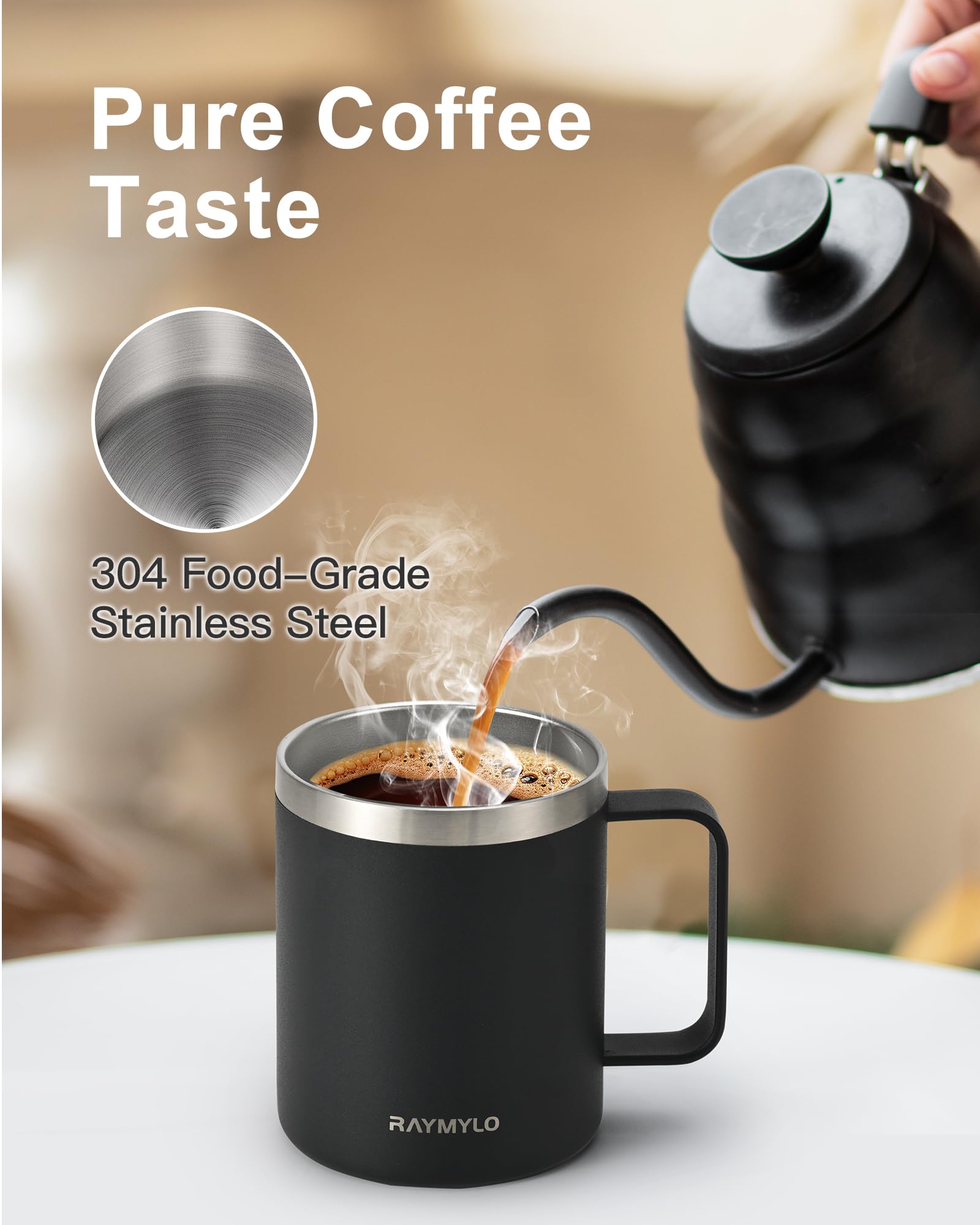 Pure Coffee,Zero Metallic Aftertaste Guaranteed: RAYMYLO coffee mug crafted from 304 food-grade stainless steel, this reusable coffee cup with lid ensures zero metallic aftertaste. Enjoy your coffee, tea, or cold brew with uncompromised flavor ! Perfect for coffee lovers and tea enthusiasts alike.