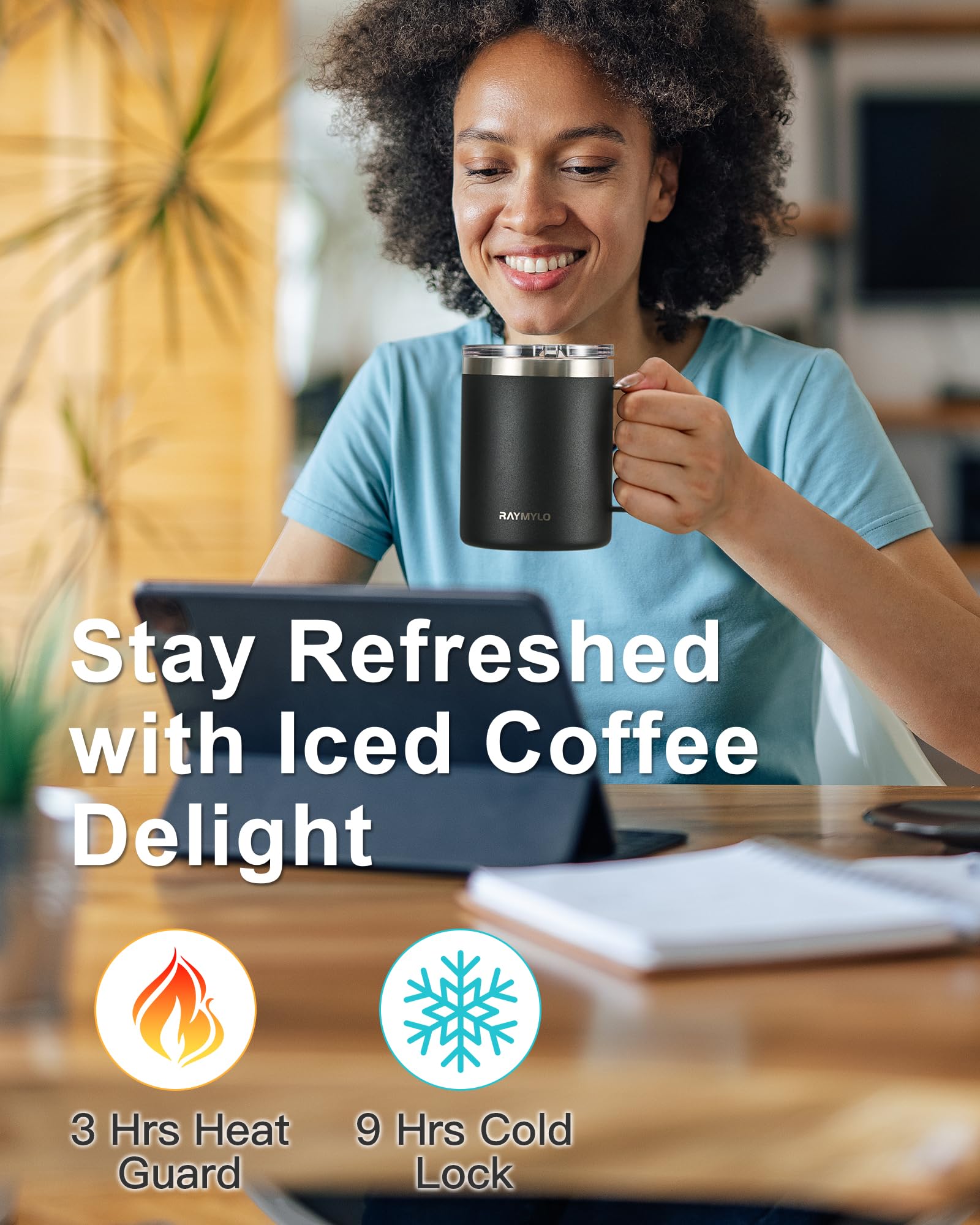 Double-Wall Vacuum Insulation: RAYMYLO Coffee Mug keep your drinks icy-cold for 9 hours and cozy hot for 3 hours with advanced Double-wall design! Perfect for hot summer days or long work hours, this insulated coffee mug with handle ensures your drink stays refreshingly cold or deliciously hot when you need it most.