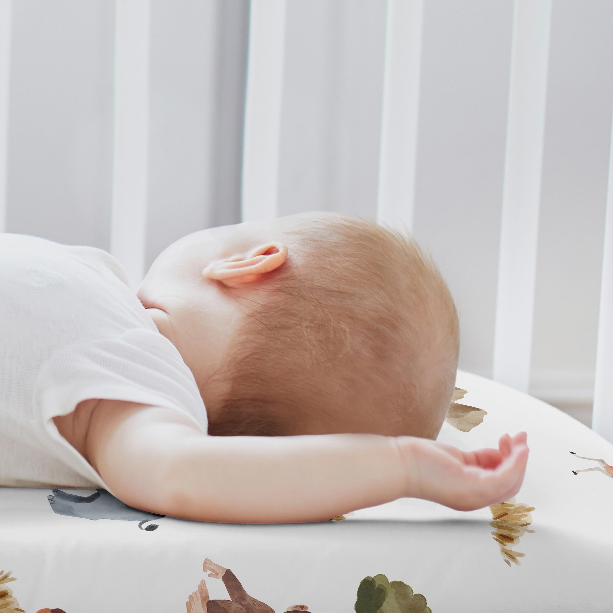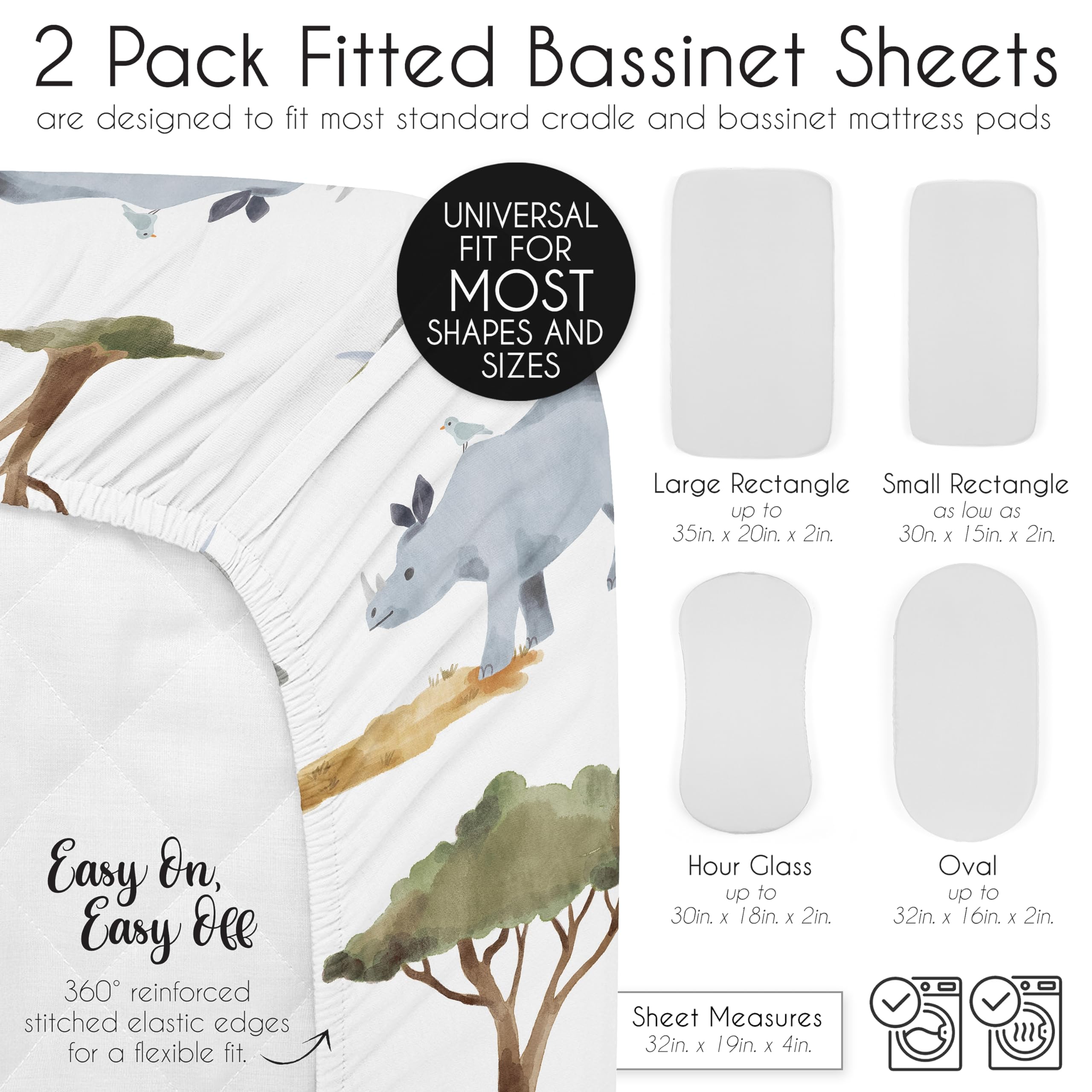 SNUG FIT: Includes: (2) Fitted Bassinet Sheets: 32in. x 19in. x 4in. each. Our sheets fit snugly, with premium elastic sewn around the bottom edge for a secure fit on most standard bassinets, pack n play bassinets, cradles, beside sleepers, & oval, hourglass & rectangular mattress shapes. These microfiber bassinet cover sheets feature a jungle animals, wildlife safari, elephant, monkey, lion animal print paired with a green boho, hatch mudcloth print. WILL NOT FIT STANDARD SIZE OR MINI CRIBS.