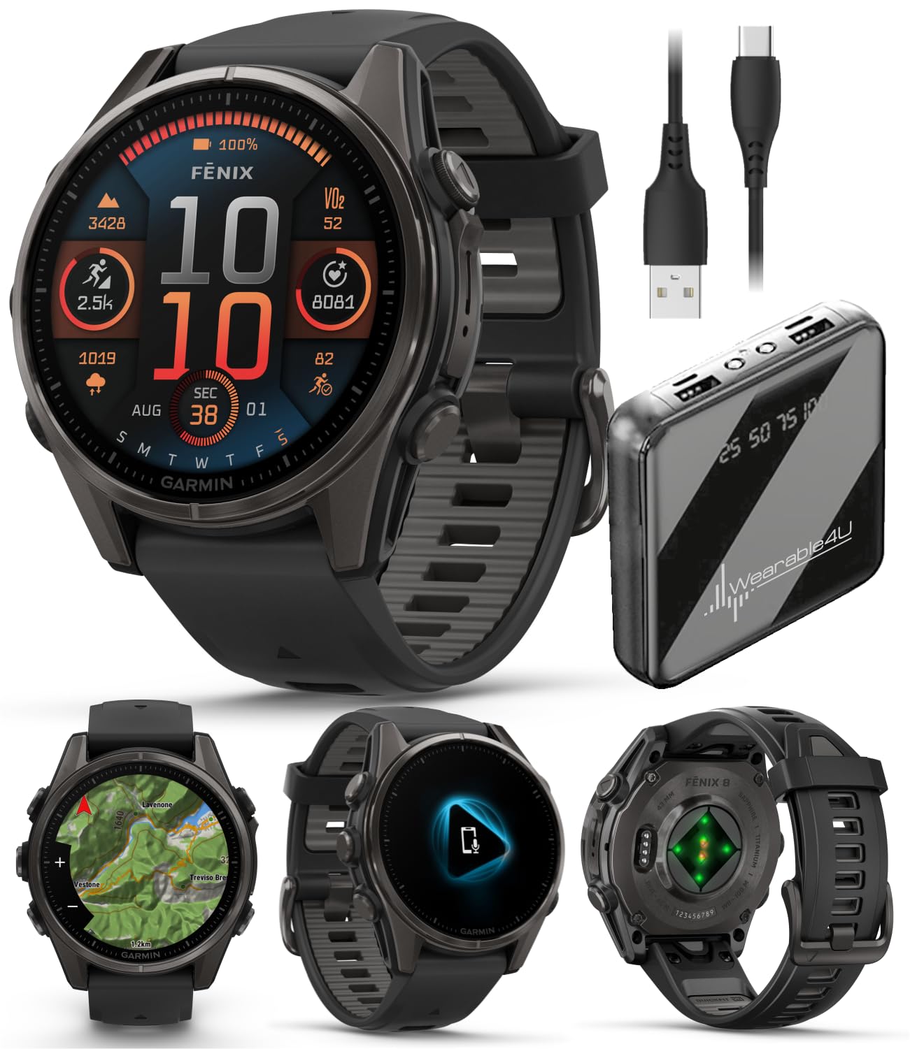 IN THE BOX: 1x Garmin fenix 8 Sapphire Titanium smartwatch, 43 mm, 1x charging/data cable, 1x Wearable4U Power Bank, 1x microUSB cable