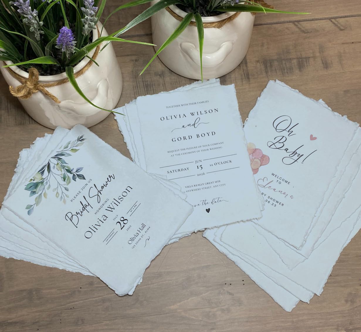 [Home Printer Friendly – 150gsm A4 Handmade Paper]: Our cotton paper for deckled edge 150gsm paper is compatible with home printers, offering endless possibilities when used as wedding invitation paper, or for cards, menus or even books. For best results, feed one sheet at a time through the manual feed tray. As printer settings and tolerances can vary, we recommend testing with a sample first to ensure optimal print quality. 50 sheets of 8.25”x11.7” / 21x30 cm, A4 size paper