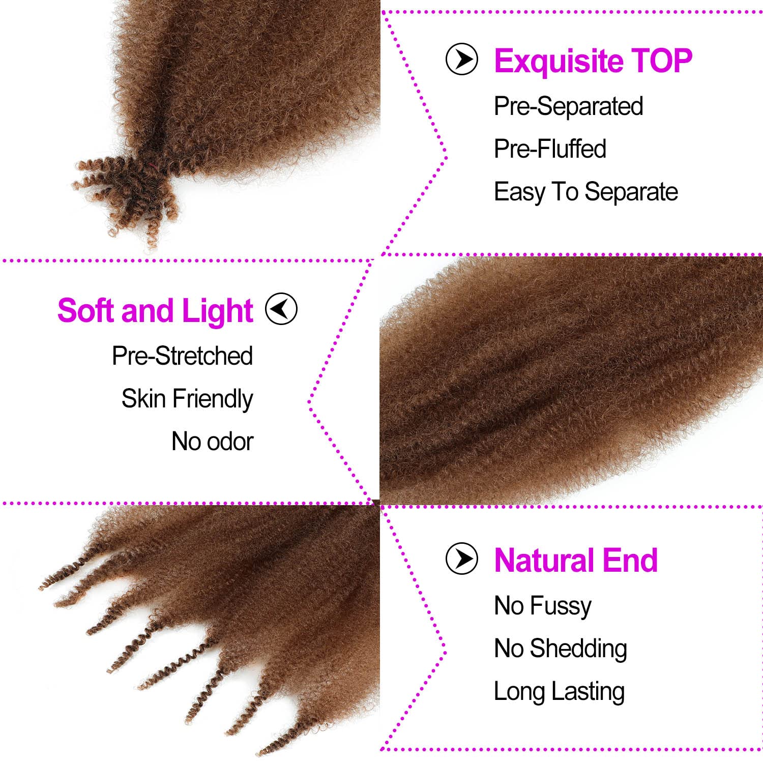 1. Hair Material: Pre-separated springy afro twist hair made of 100% high quality low temperature fiber. Our spring afro twist hair boasts more density and natural looking, soft and fluffy, no smell, friendly to skin