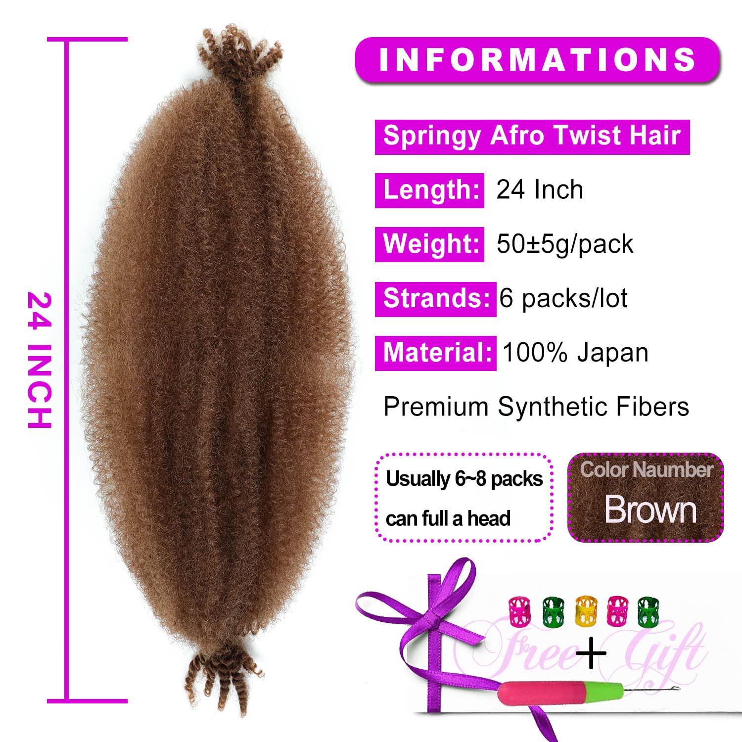 4. Hair Specifications: Springy afro twist hair length 24 Inch (50±5 g/Packs, 8 Strands/Pack ,6 Packs/Lot), giveaways in every pack, Usually 4-6 packs can full a head