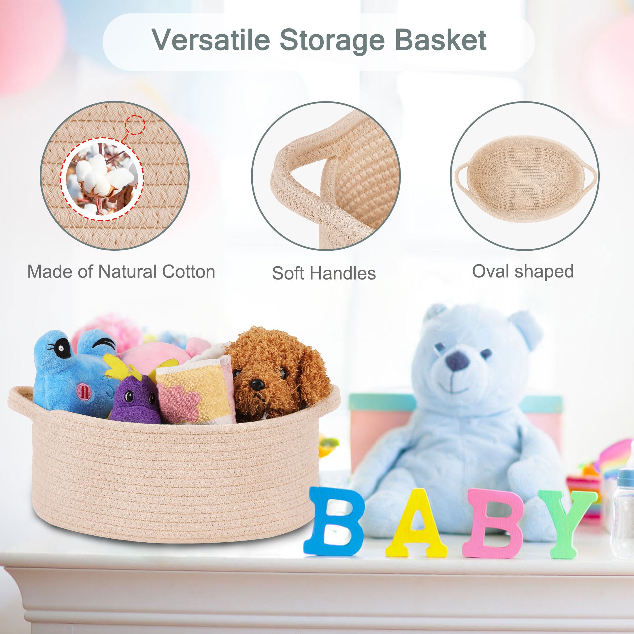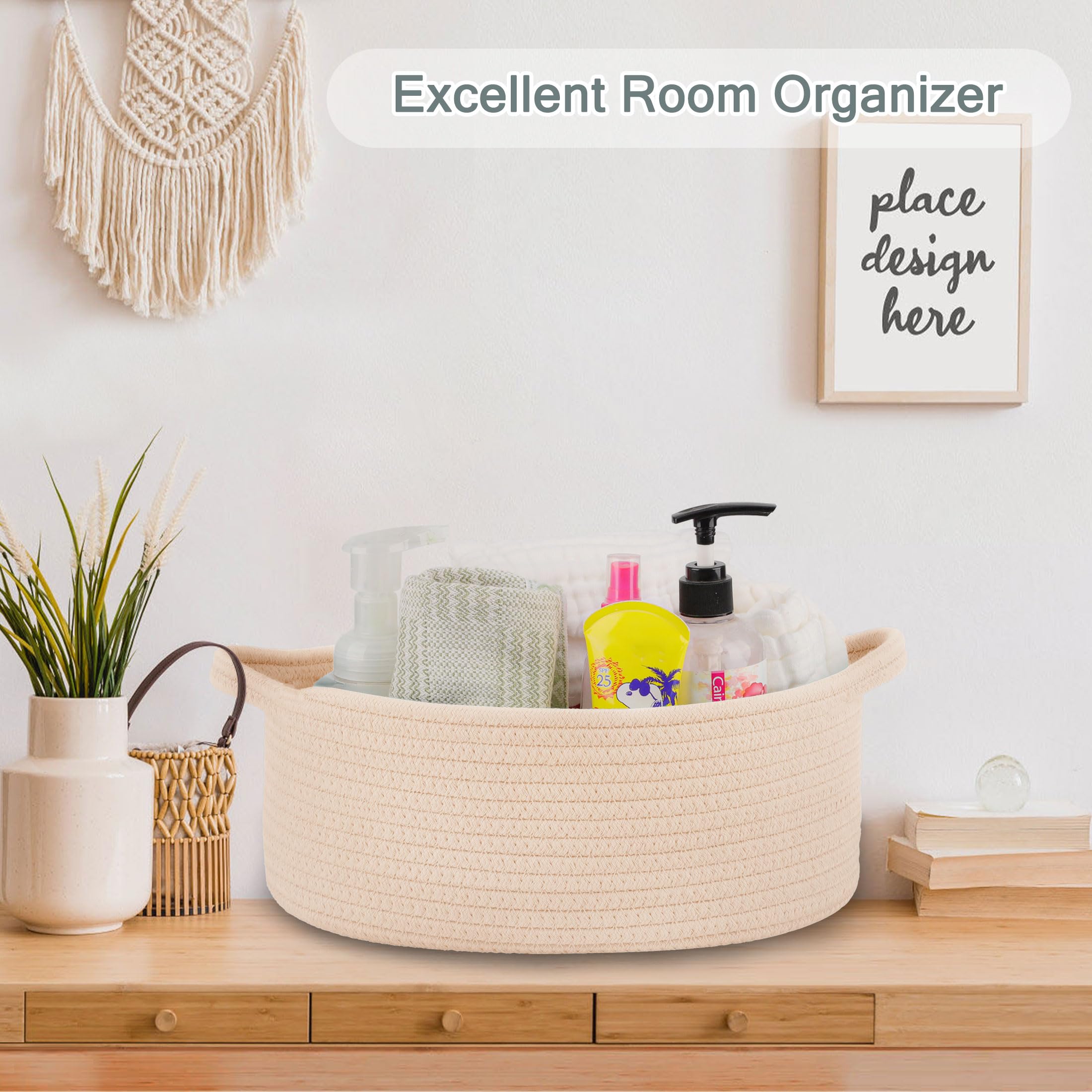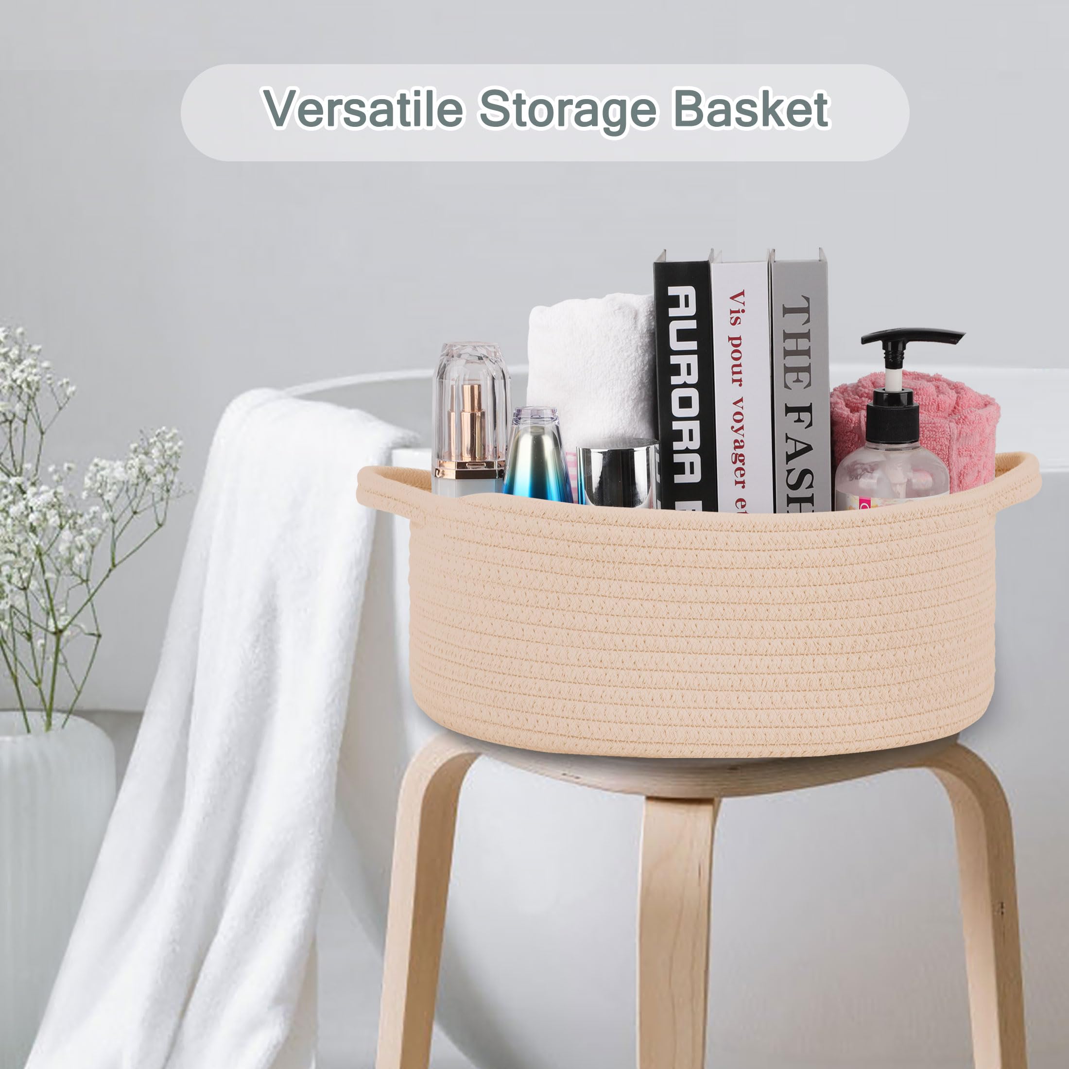 【Versatile Storage Basket】 Our rope storage basket is the perfect organizer for keys, wallets, diapers, books, remotes, toys, makeups, and more. You can use it as a baby basket, end table basket, shelf storage basket, office desk basket, basket for bathroom, kids' toy basket, book basket, shallow basket, and more. It can also be used as a pet toy basket for cats and dogs.