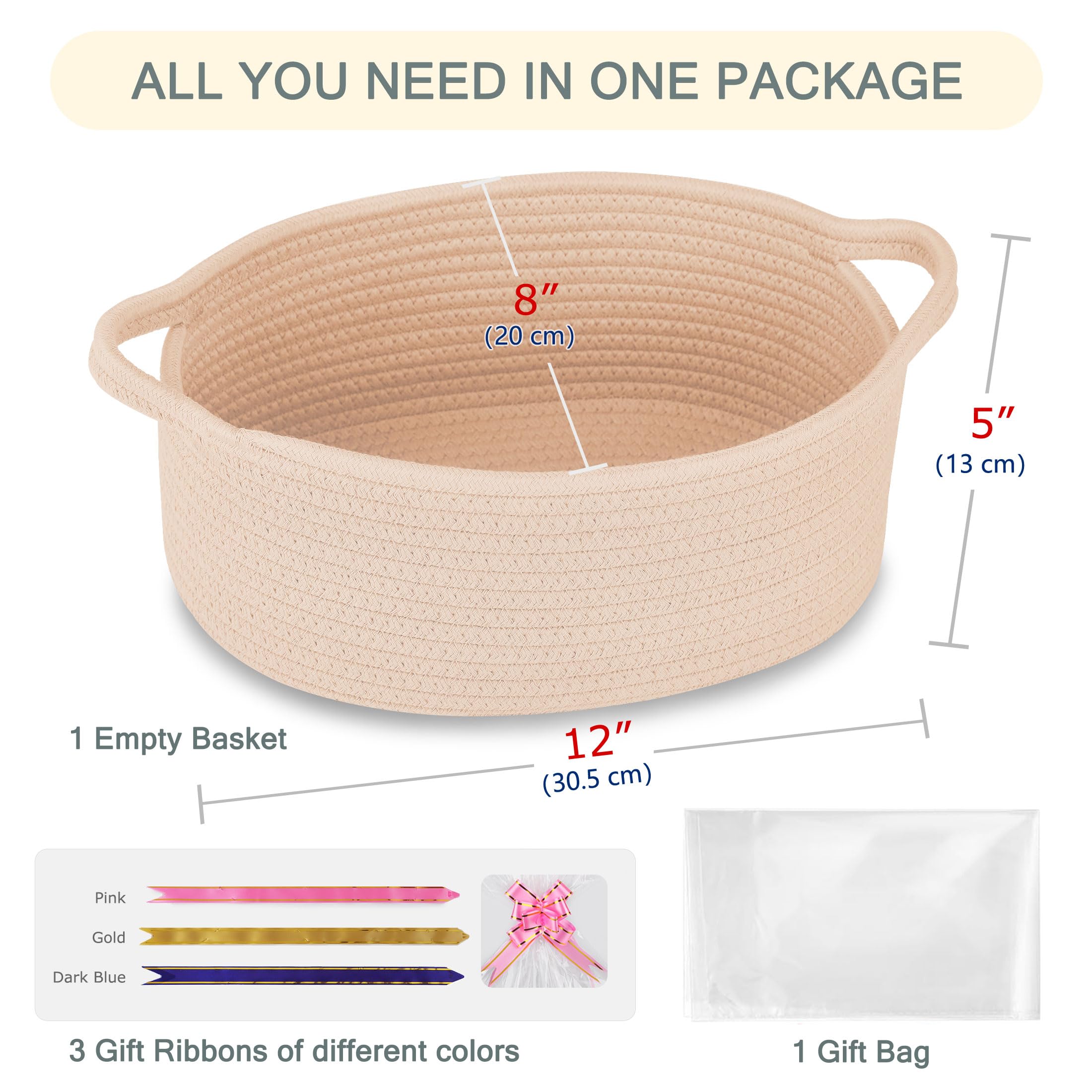 【Ideal Size and Material】The cute small empty gift basket size is 12“ x 8” x 5”. The soft basket is made of natural cotton rope, a healthy, chemical-free material that is safe for kids and pets.Our gift baskets are available in a variety of colors.The classic solid color design enhances any room or decor in your home.