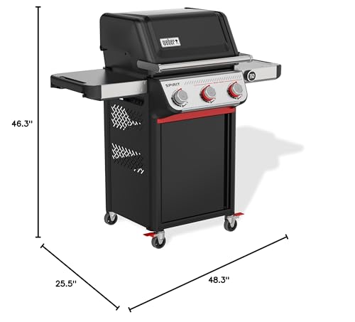 Grill food that tastes better than ever on the reinvented black 3-burner Spirit EP-325 propane gas grill with Sear Zone. Create bold, flavorful sear marks on meat, fish, and vegetables with two red Boost Burner knobs that unleash 40% more power in the Sear Zone. Ignite each individual burner easily with one hand with Snap-Jet Ignition and control the heat precisely with a full range of temperatures from high to low and everything in between. See the cooking temperature at a glance with a digital thermometer that’s easy-to-read day and night. Make the most of your space by adding a variety of Weber Works drop-in accessories (sold separately) to the side table and snap-on accessories (sold separately) to the side rails. If you're looking for a rotisserie grill for locking in juice and evenly browning and crisping a whole chicken, prime rib, or leg of lamb, consider adding the compatible Weber rotisserie accessory (sold separately). Stainless steel Flavorizer Bars catch and vaporize juices, boosting grilled flavor and funneling grease away from the burners to prevent flare-ups. Outdoor grill and BBQ also has a grease management system with large drip pan and removable grease tray that slides out for quick and easy cleaning and maintenance. A cabinet with a door hides the propane tank and grilling accessories, while a warming rack keeps food warm, toasts buns, or even grills smaller food items while the main course finishes grilling below. Liquid Propane tank sold separately.
