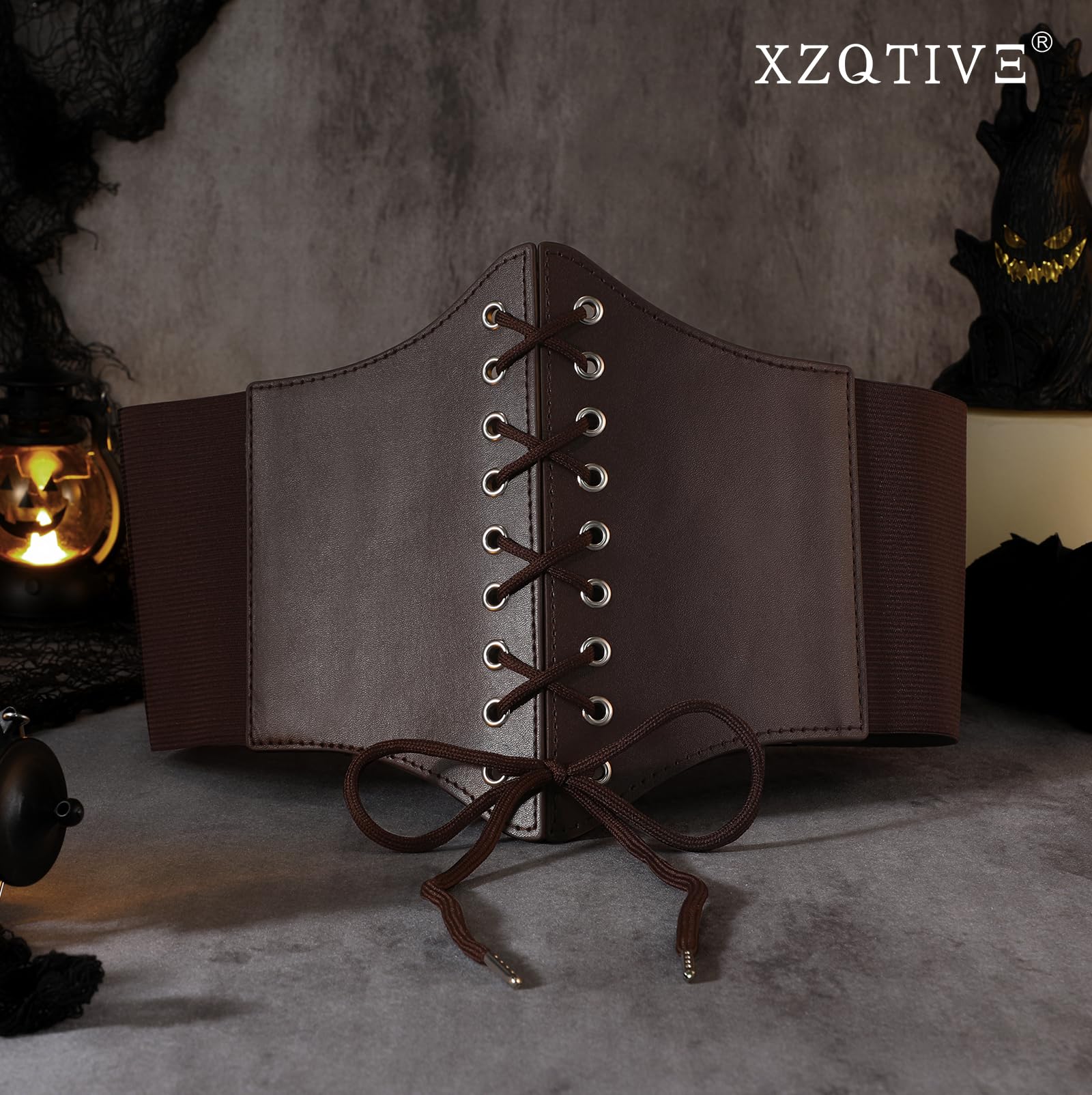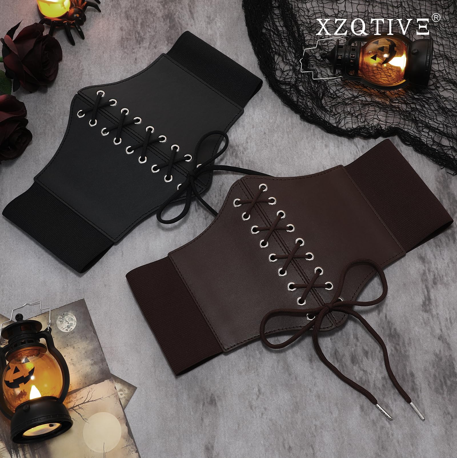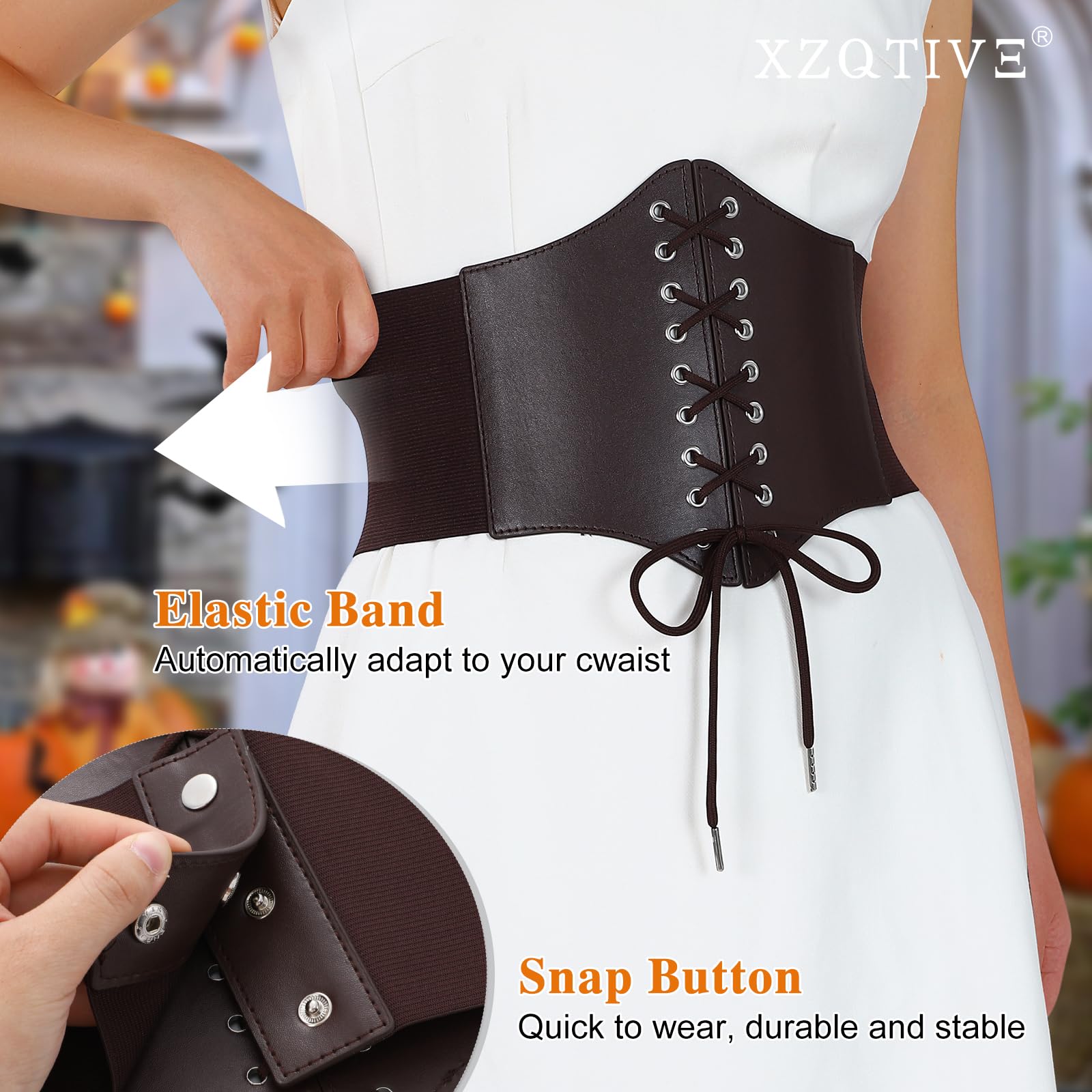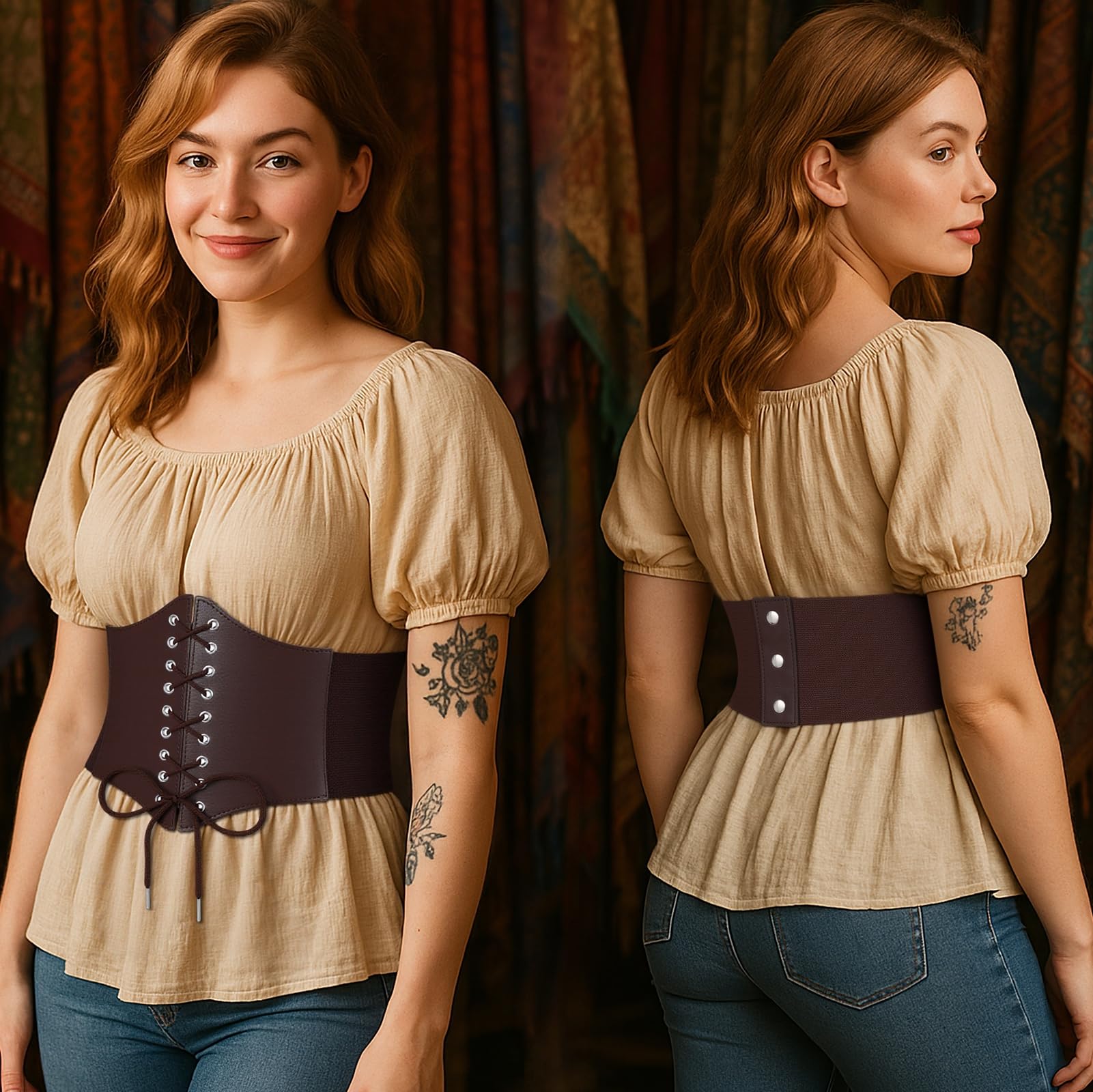 ➜ Black Corset Belt for Waist - Wide Costume cinching belt with tied corset leather on the front, elastic webbing band on the back, snap button closure to lock the belt,
