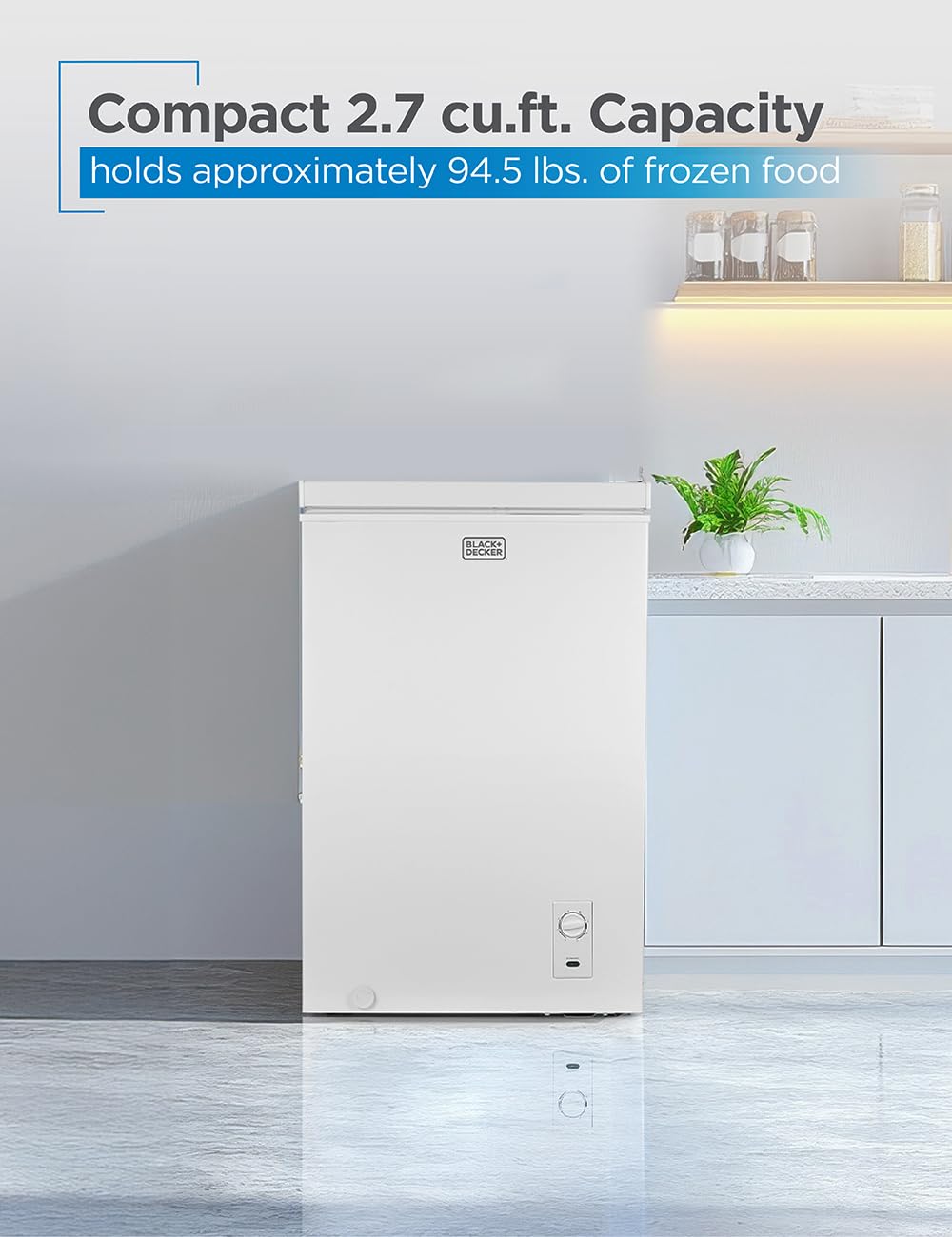 Compact, Deep Freezer Storage: 2.7 cu. ft. capacity holds a substantial 94.5 lbs. of frozen foods including cold meat, frozen dinners and ice cream. Keeps perishables frozen for your home or garage.
