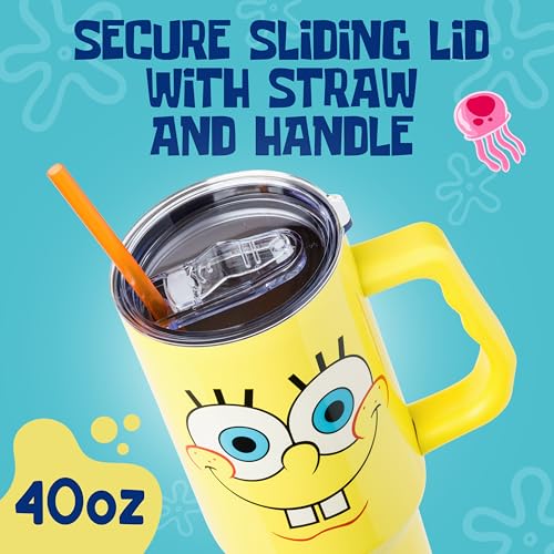 Take a trip to Bikini Bottom with this themed tumbler! Stainless steel tumbler features SpongeBob SquarePantsβs face against a yellow background. Design is featured on both sides of the tumbler. This stainless steel tumbler is NOT microwave or dishwasher safe; HAND WASH ONLY. This stainless steel tumbler holds up to 40 ounces of your favorite beverage and is designed with a convenient handle making this tumbler easy to carry wherever you go. Whether you're on a road trip, at a sporting event, at work, or enjoying a picnic, this tumbler is ideal for all your hydration needs. SpongeBob SquarePants and cartoon fans alike will enjoy this tumbler featuring this comedic character, making it the perfect gift. Great for birthdays, holidays, or other gift exchanges. Take a dive into the fictional world with Silver Buffalo! Silver Buffalo provides fans with official merchandise from their favorite characters. Working alongside licensors and brands, we create unique and imaginative products which are designed with great care and detail. Silver Buffalo aims to connect fans to their favorite cartoon characters, superheroes, movies, tv-series, and more. Celebrate your fandom!