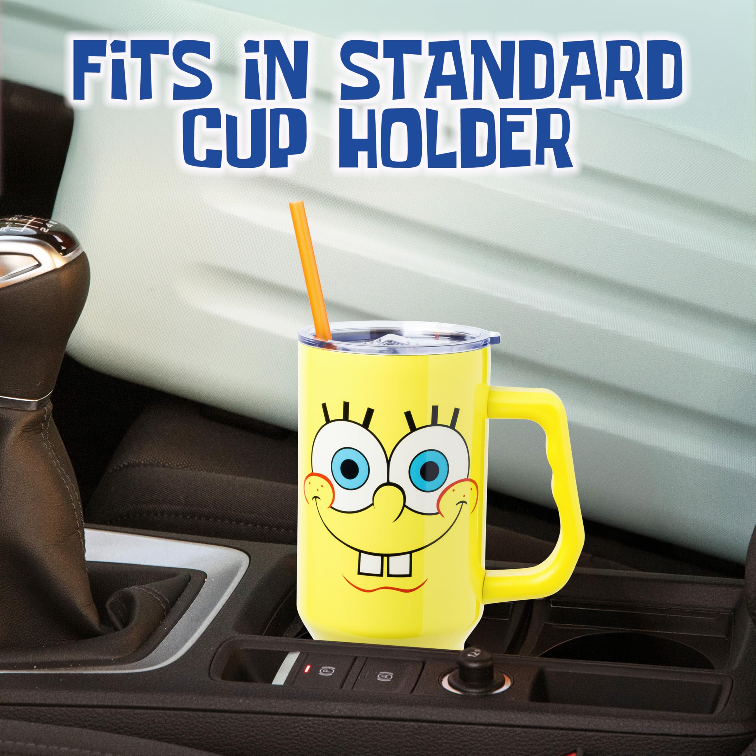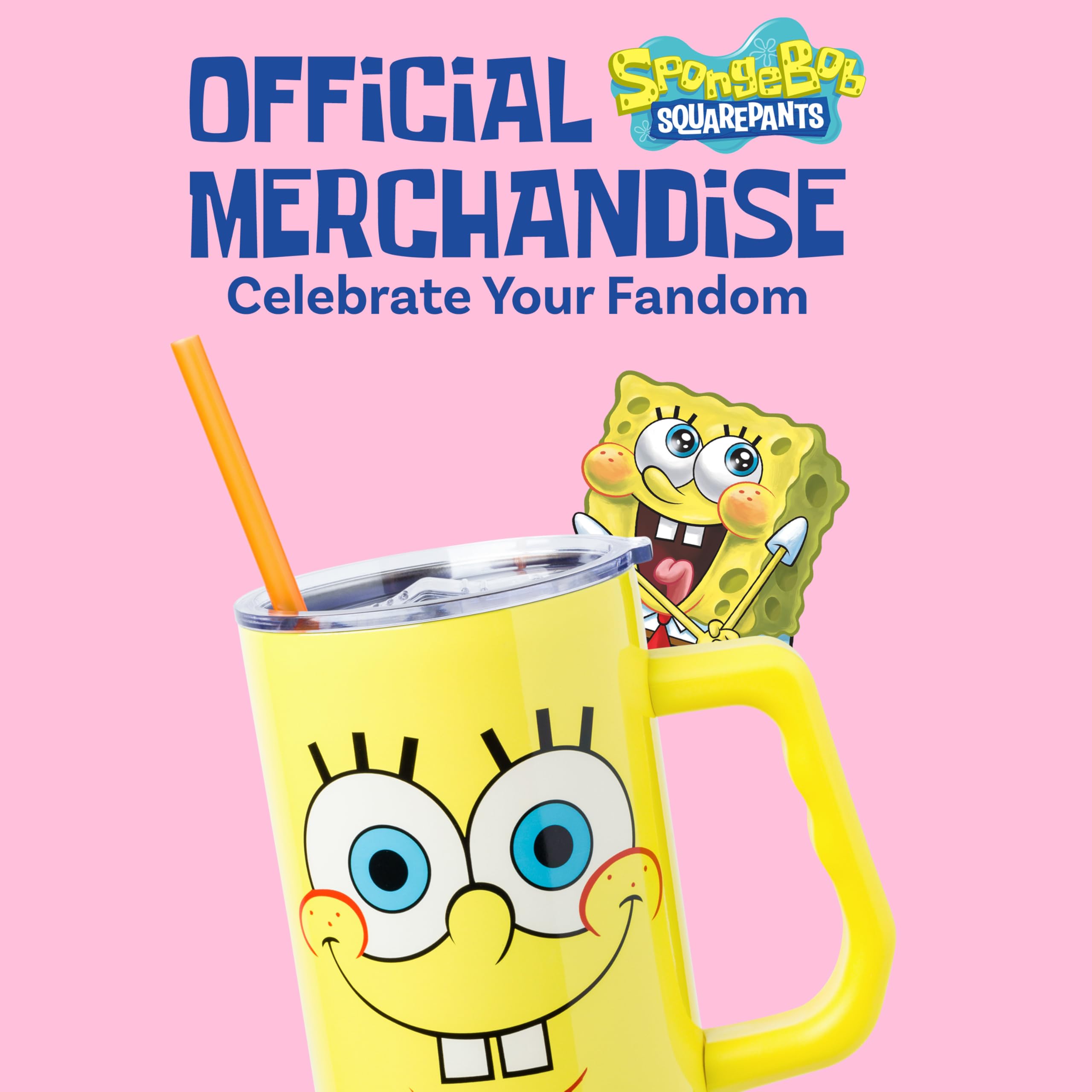 SPONGEBOB TUMBLER: Themed tumbler features SpongeBob SquarePantsβs face against a yellow background. Design is featured on both sides of the tumbler.