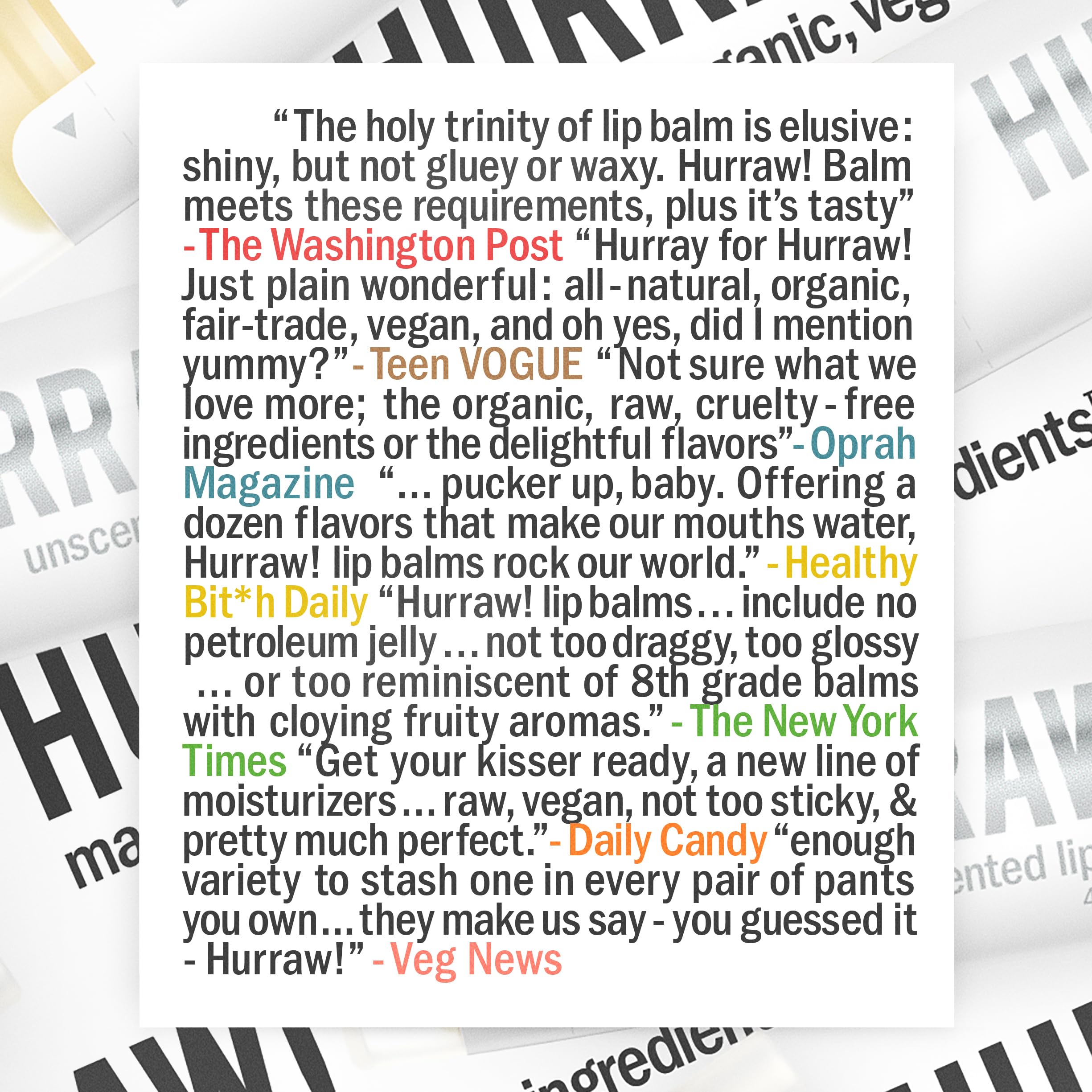 CRITERIA: Hurraw! Lip Balms are all natural, vegan, raw, made with premium fair trade ingredients, super smooth, not draggy, not sticky, not sweet, not too glossy, not too smelly. Never grainy. Long lasting and no melting in a back jean pocket! Made in Montana, USA.