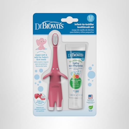 Establish good oral hygiene habits with baby with Dr. Brown's Infant-to-Toddler Elephant Toothbrush and Toothpaste Set. Together, they safely clean baby's first teeth and gums - just add a pea-sized drop of toothpaste to the toothbrush and use small circular motions to clean. Super-soft bristles gently clean while the durable, yet soft material of the brush is gentle on sensitive mouths. Dr. Brown's Fluoride-Free Apple Pear Baby Toothpaste safely and effectively cleans with no fluoride, artificial flavors, or colors. The toothbrush is sized just right for small mouths and little fingers - helping baby build the skills they need to reach independent brushing. The elephant ears on the brush let baby set it down without surface contact or the wide base lets you securely store it upright. Intended for ages 0-3 years. Always use with adult supervision. BPA free. Toothbrush: Wash prior to each use. Replace every 3 months or when bristles appear worn. Toothpaste: Safe to swallow. Keep away from dogs. 1.4oz/40g.