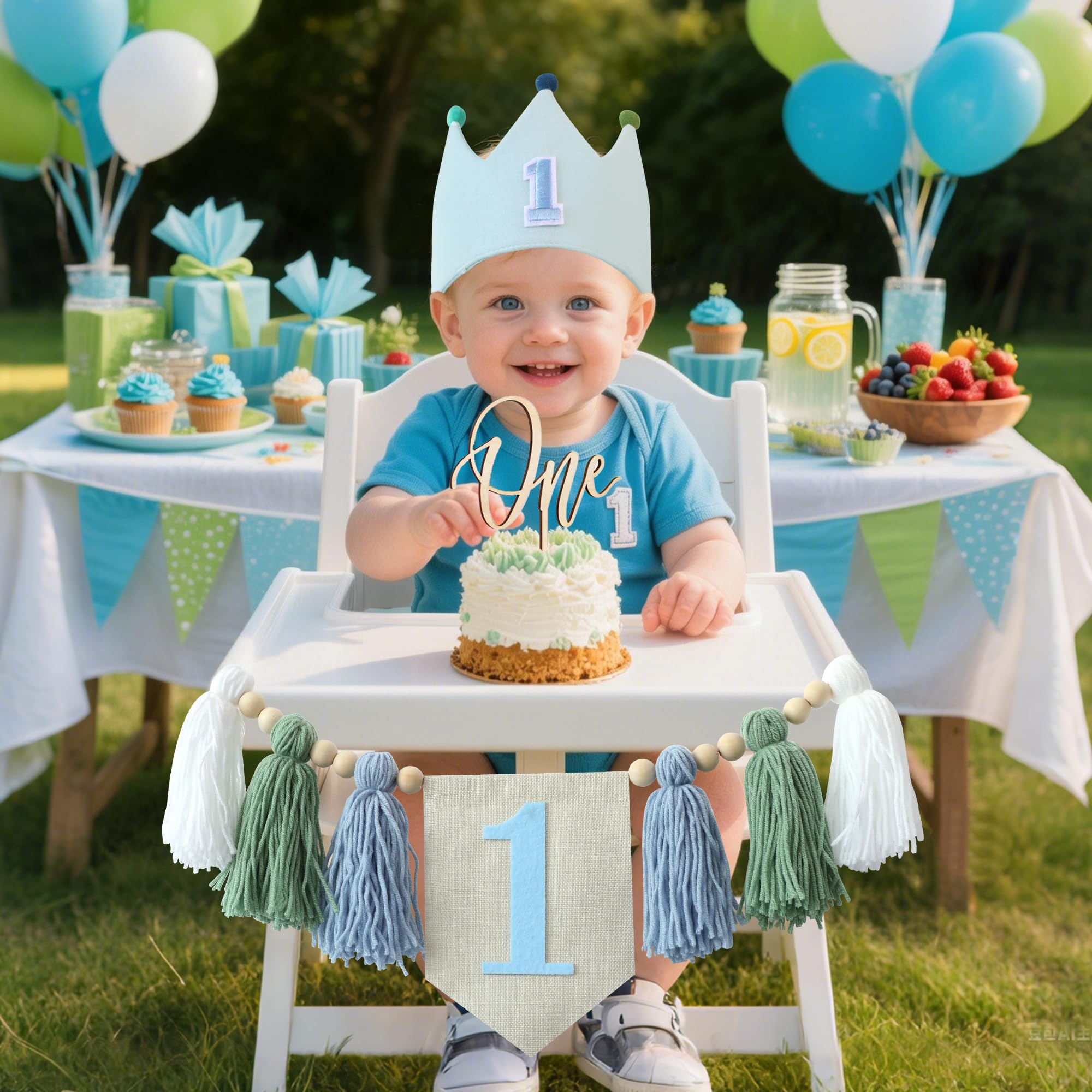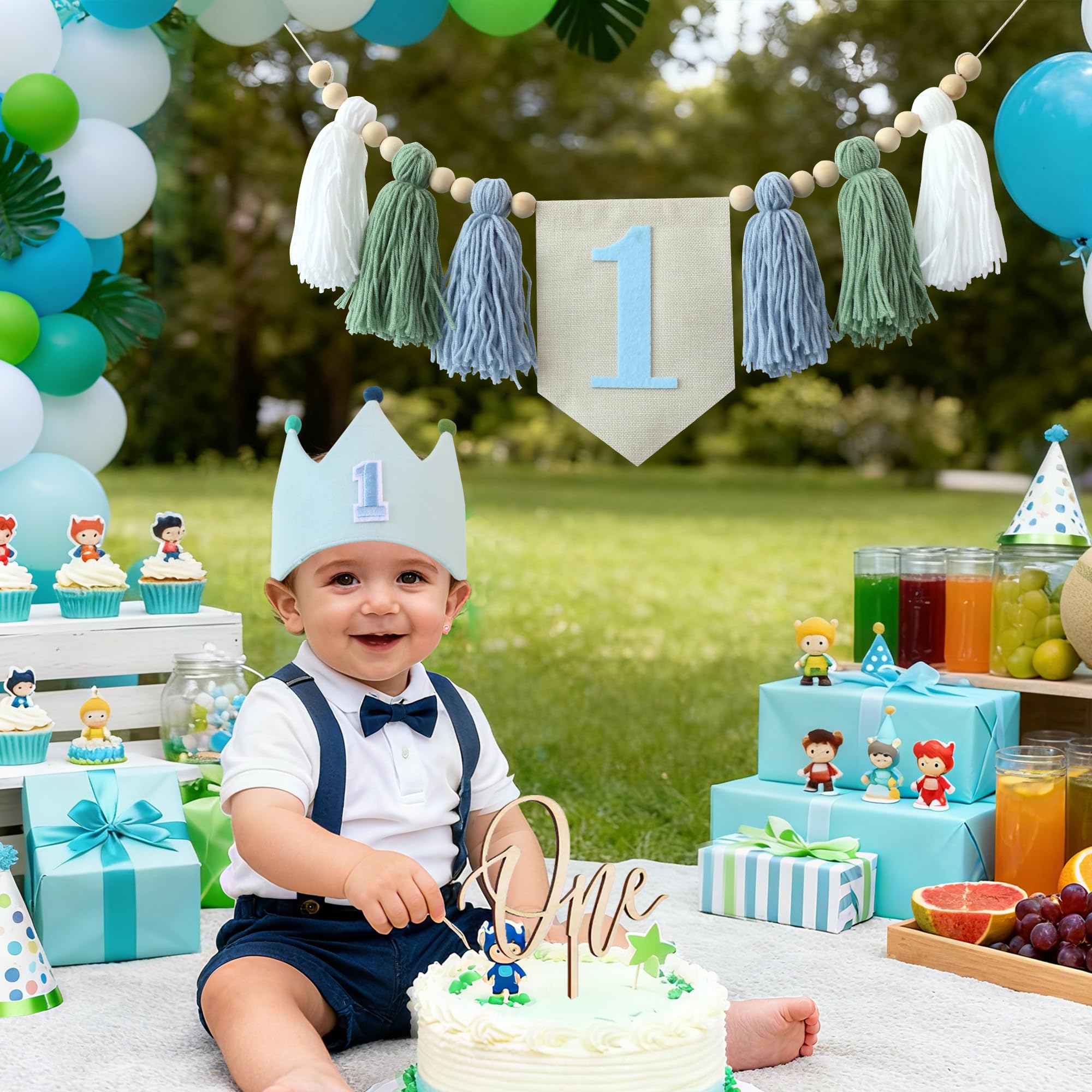 PACKAGE CONTENTS: A tasseled garland banner containing the number in white; green and blue with wooden beads; A blue crown hat with the number and a one cake topper; This set is a great way to add a touch of color to your baby's birthday party