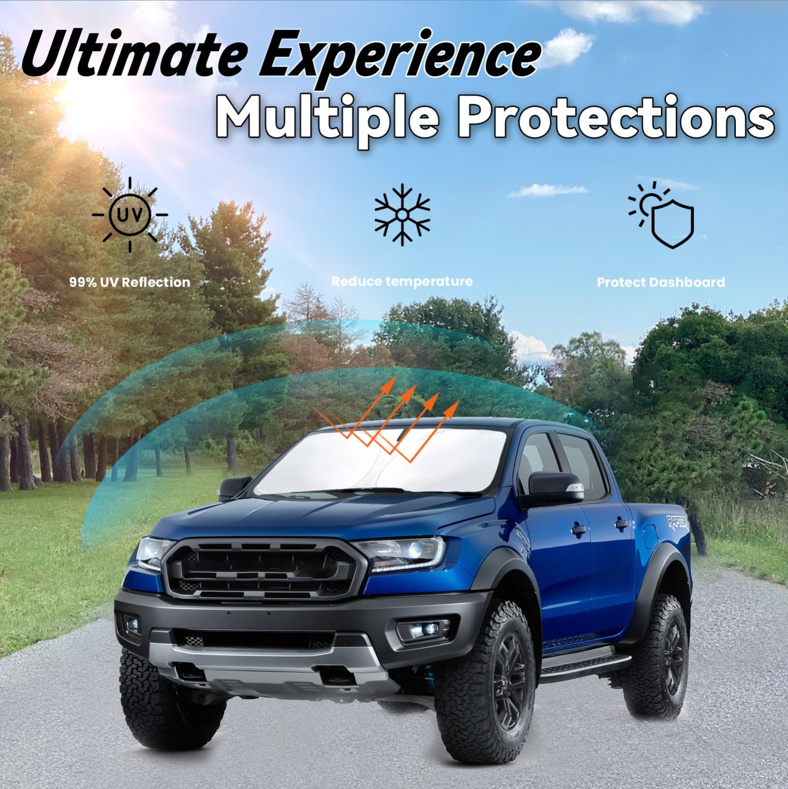 【Ranger Sunshade】: Car sun shade for Ford Ranger 2019-2026 is custom-fit for a precise installation; It fits perfectly to your window without the need for suction cups; It won't sag or collapse, making it ideal for outdoor camping adventures